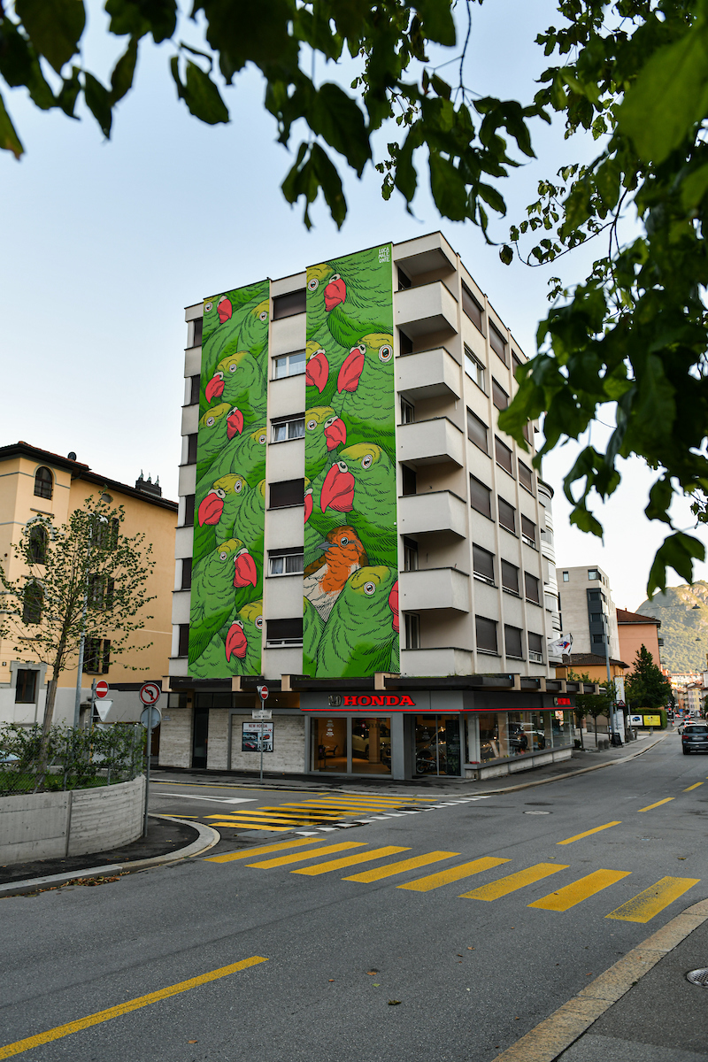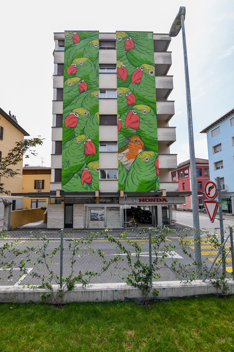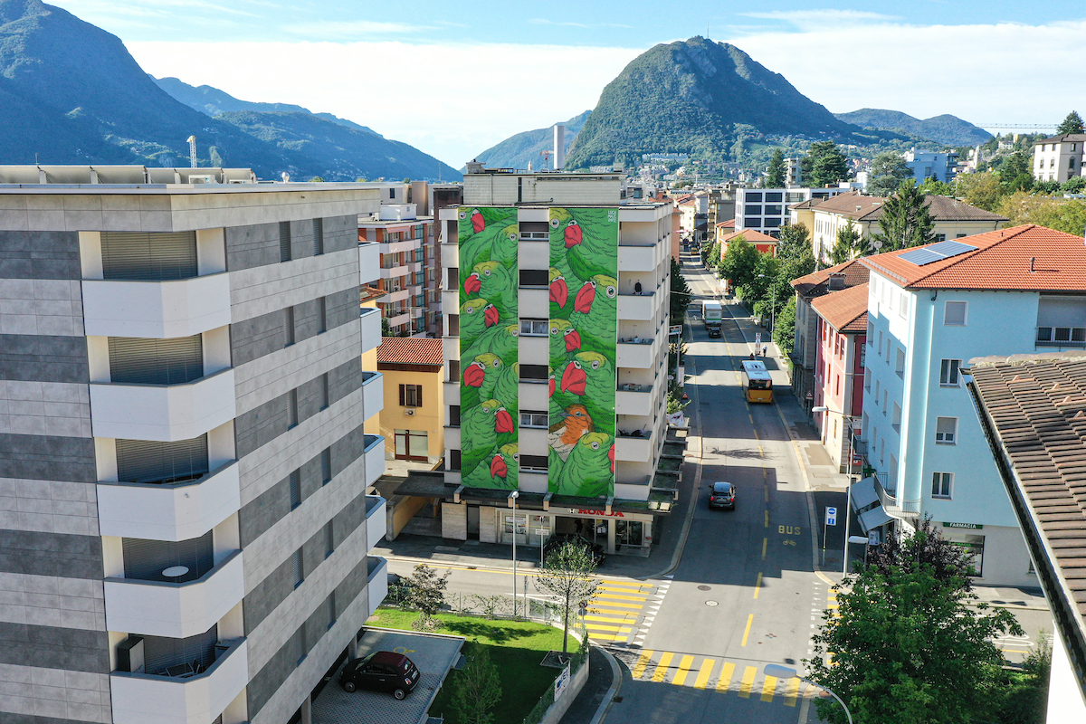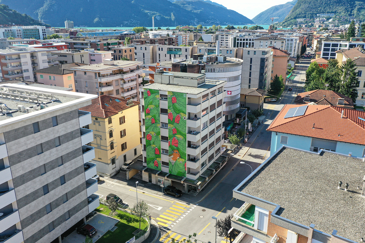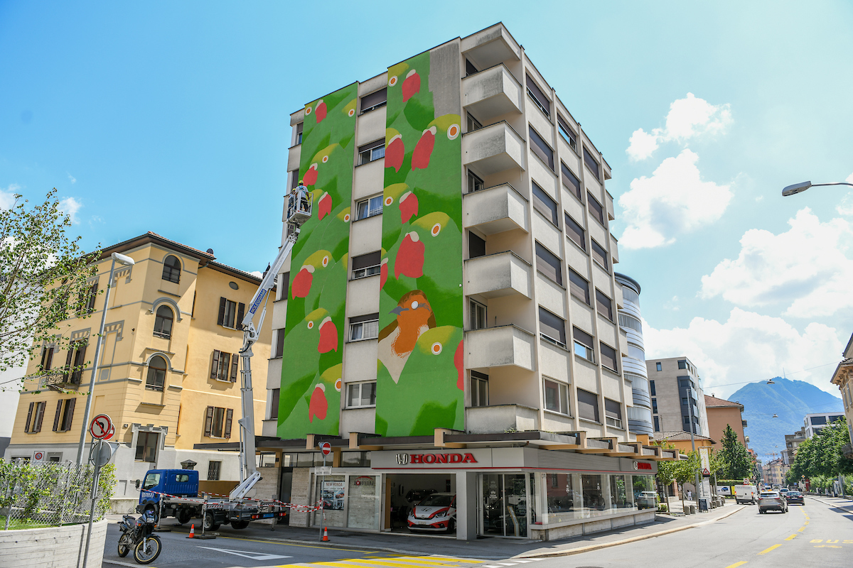 An acclaimed artist on the Italian art scene, Lucamaleonte, born in 1983, from Rome, has been an active player in the world of Street Art since the early 2000s. A graduate of the Central Institute for Restoration, he began working on the walls of Rome in particular, where he discovered the Stencil technique. Over the years, the complexity of his works has become increasingly pronounced: in his work today he alternates between paintings on walls and those on canvas, for public and private commissions. In Lugano, he created an impressive mural located on the double façade of the private building on Via Giacomo Mercoli 2. The work is in line with his artistic journey: on the one hand, his long-standing research and interest in illustration, and, on the other hand, in everything that is in some way encyclopaedic, groupable, sortable, systematisable and archivable, are clearly visible. Medieval herbaria and bestiaries, in particular, also inspired the artist when he was designing the Lugano mural: new flora and fauna were created and, while remaining in tune with the characteristics of the location, have invaded the urban space, offering people new perspectives.