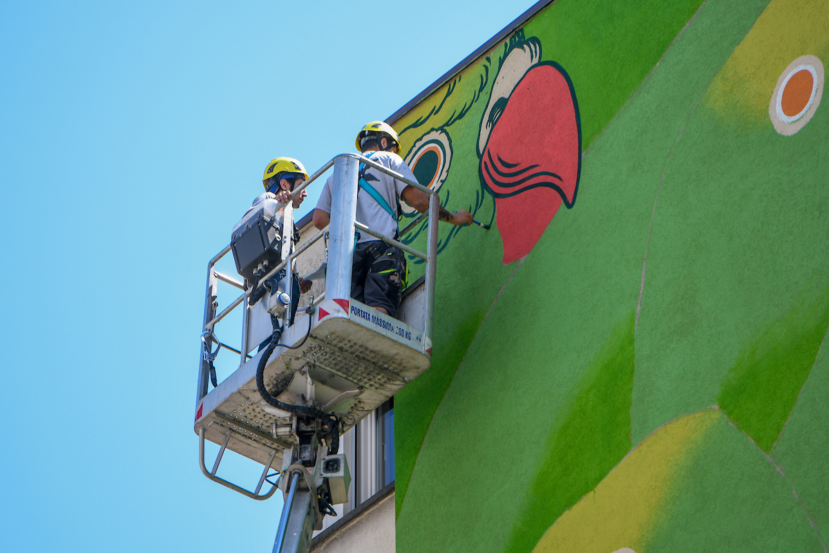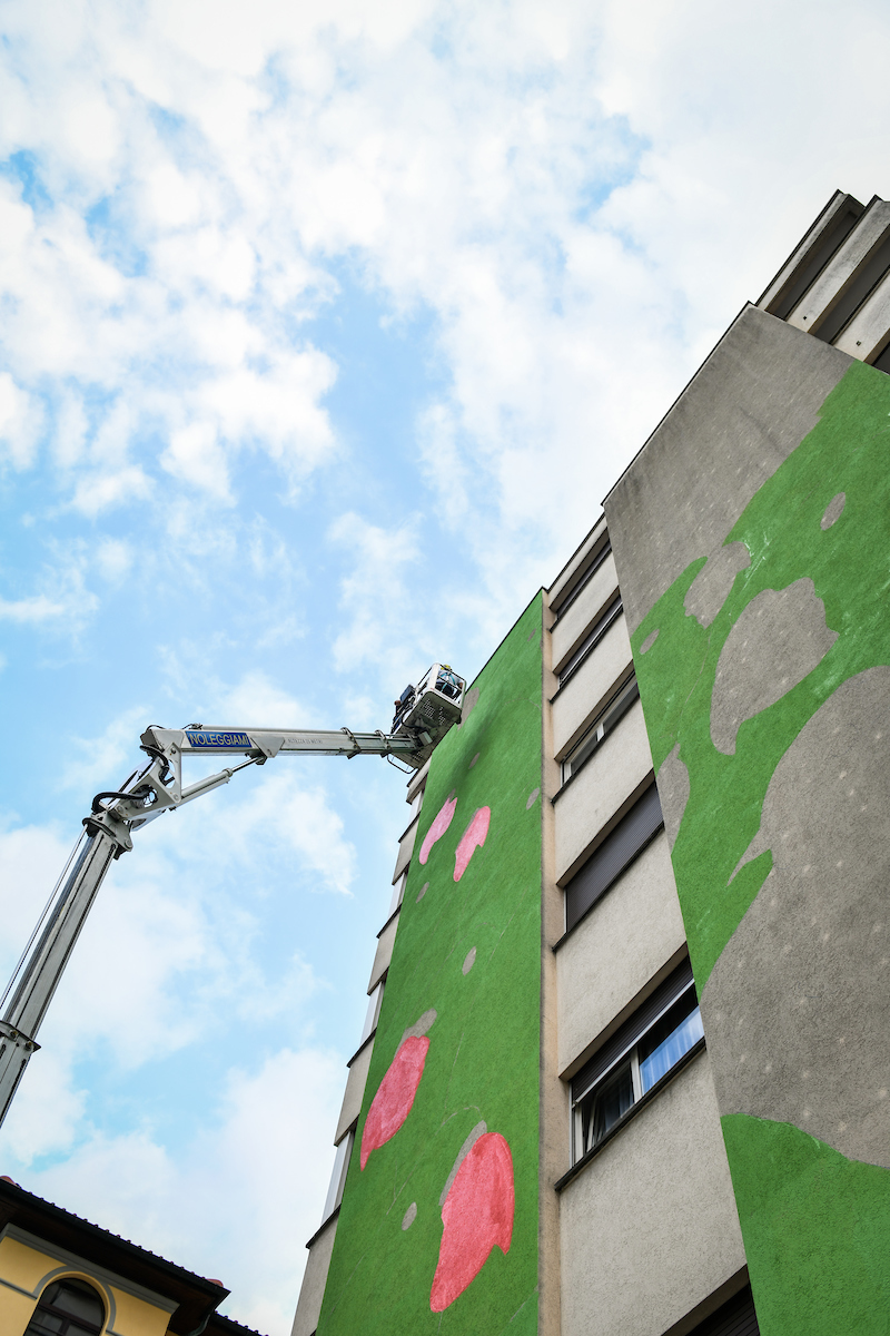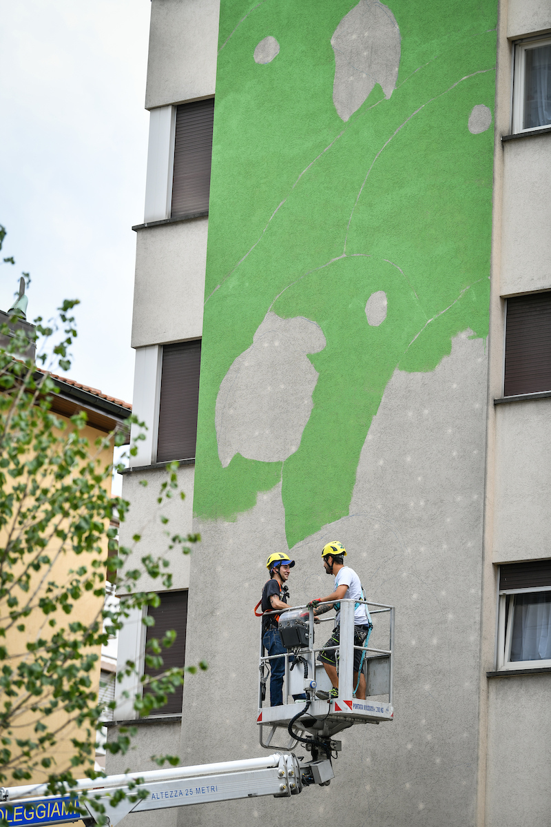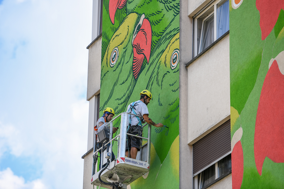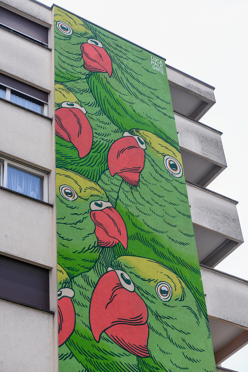 An acclaimed artist on the Italian art scene, Lucamaleonte, born in 1983, from Rome, has been an active player in the world of Street Art since the early 2000s. A graduate of the Central Institute for Restoration, he began working on the walls of Rome in particular, where he discovered the Stencil technique. Over the years, the complexity of his works has become increasingly pronounced: in his work today he alternates between paintings on walls and those on canvas, for public and private commissions. In Lugano, he created an impressive mural located on the double façade of the private building on Via Giacomo Mercoli 2. The work is in line with his artistic journey: on the one hand, his long-standing research and interest in illustration, and, on the other hand, in everything that is in some way encyclopaedic, groupable, sortable, systematisable and archivable, are clearly visible. Medieval herbaria and bestiaries, in particular, also inspired the artist when he was designing the Lugano mural: new flora and fauna were created and, while remaining in tune with the characteristics of the location, have invaded the urban space, offering people new perspectives.