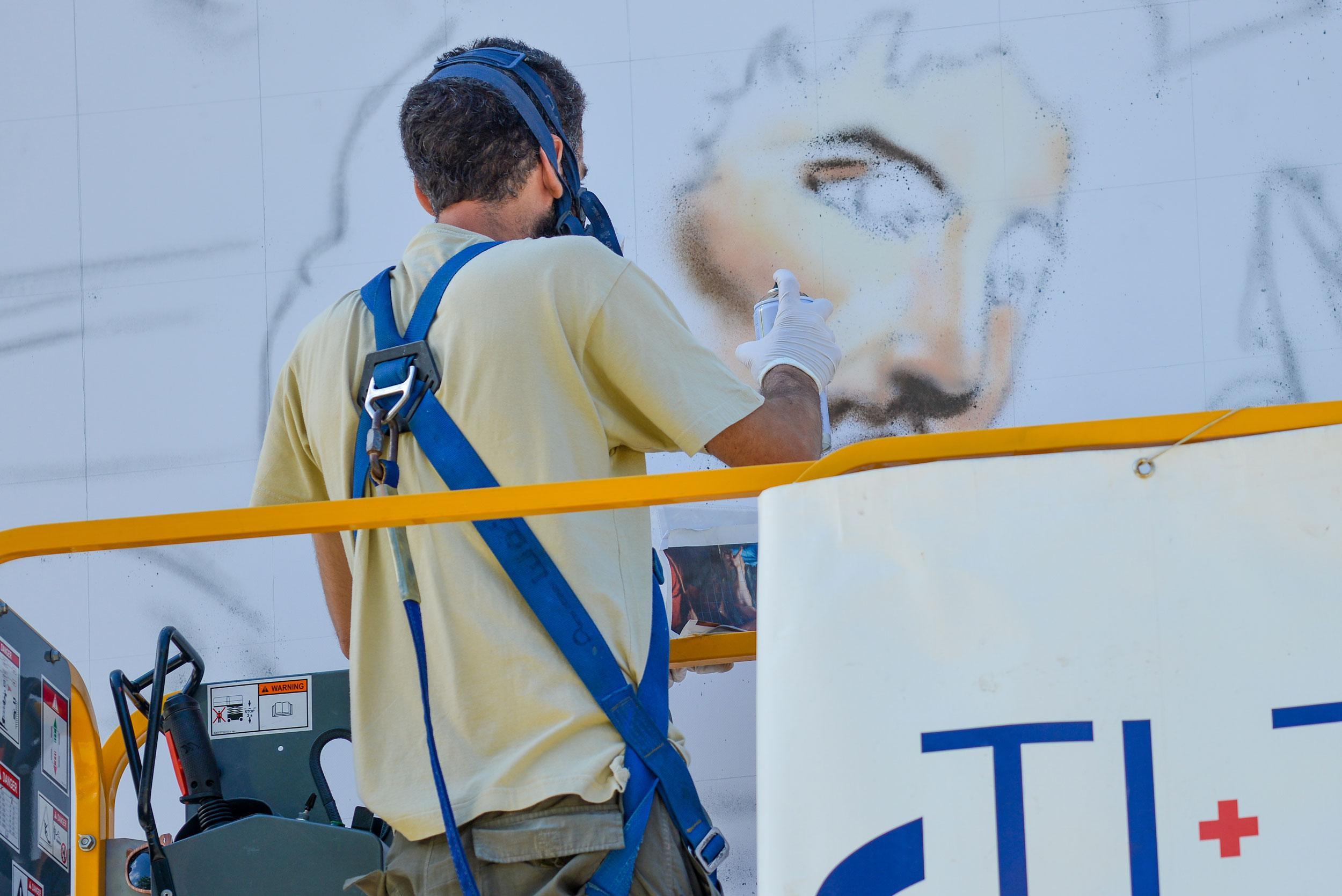 La street art incontra la pittura del ‘600 con Andrea Ravo Mattoni. L’arte classica rivive nel cuore della Città e il pubblico può entrare in contatto diretto con la storia dell’arte locale. Il dipinto Predica di San Giovanni Battista dell’artista ticinese del ‘600 Pier Francesco Mola, viene reinterpretato su una grande “tela” di 5 metri di larghezza per 4 metri di altezza con le bombolette spray in modo sbalorditivo. Il dipinto originale è oggi esposto presso la Galleria Nazionale d’Arte Antica di Palazzo Barberini a Roma e rappresenta la predica di San Giovanni Battista. Tra i personaggi si ritrova una tipica figura del Mola: l’uomo con turbante. Il vecchio barbuto e il soldato di spalle con l’armatura luminescente esemplificano invece un Tiziano rivisitato in forma barocca.