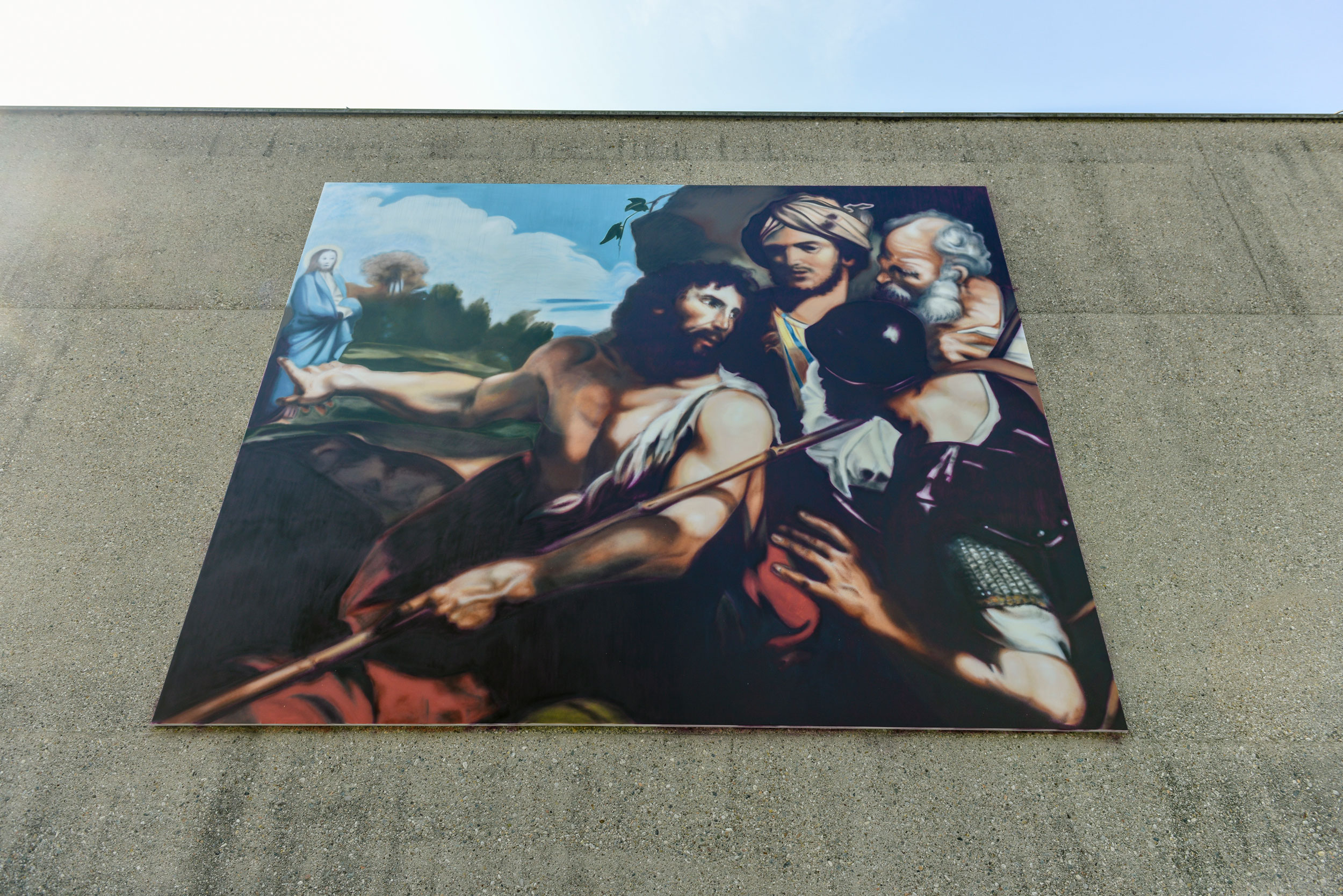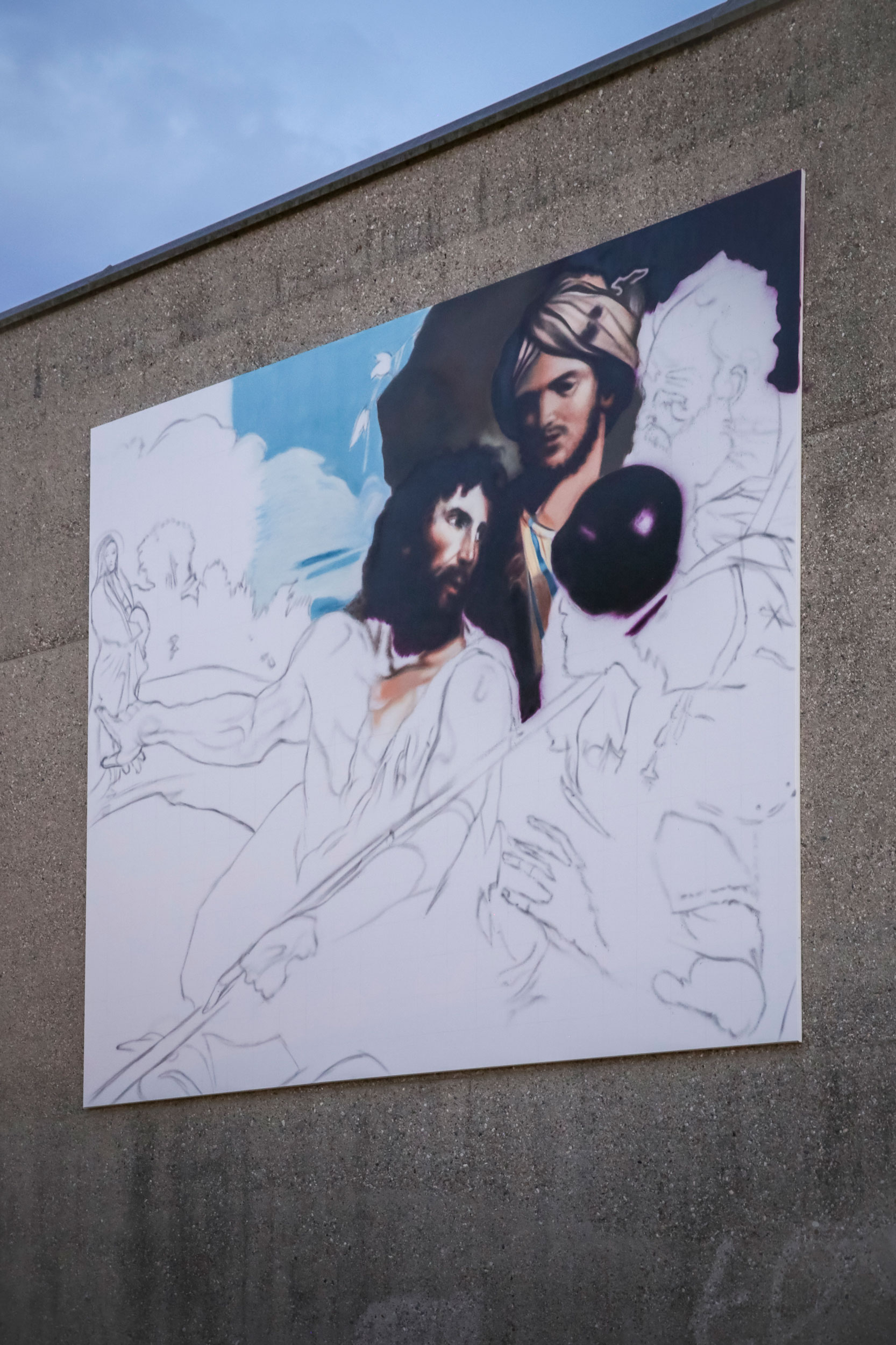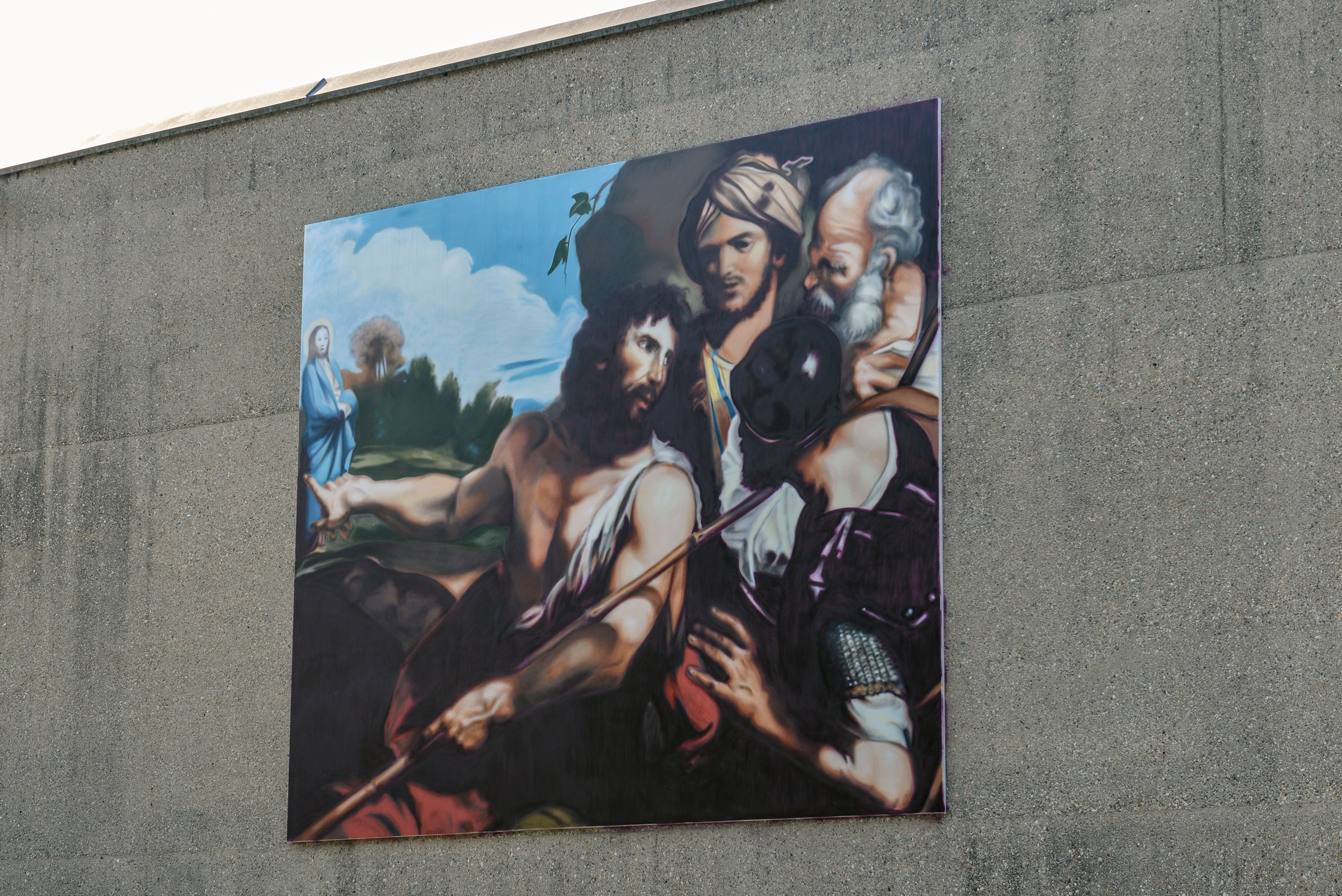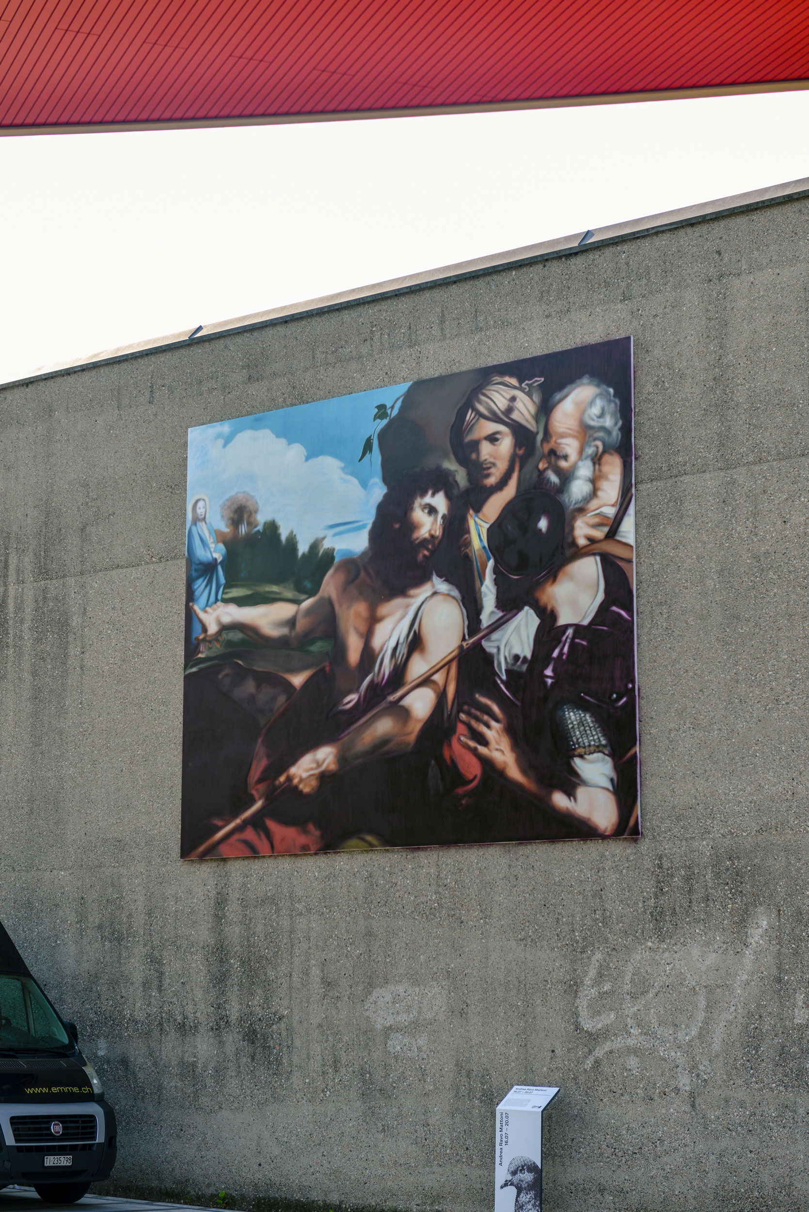 Street art meets 17th century painting with Andrea Ravo Mattoni. Classical art comes to life again in the heart of the city and the public can come into direct contact with local art history. The artist created an amazing reinterpretation of the painting Sermon of St .John the Baptist by the 17th century artist Pier Francesco Mola from Ticino on a large “canvas” 5 metres wide by 4 metres high using spray cans. The original painting is currently on display in the National Gallery of Ancient Art of Palazzo Barberini in Rome and depicts the sermon of St. John the Baptist. Among the characters is a typical Mola figure: a man with a turban. On the other hand, the bearded old man and the soldier behind in shining armour are reminiscent of a Titian painting reinterpreted in Baroque form.
