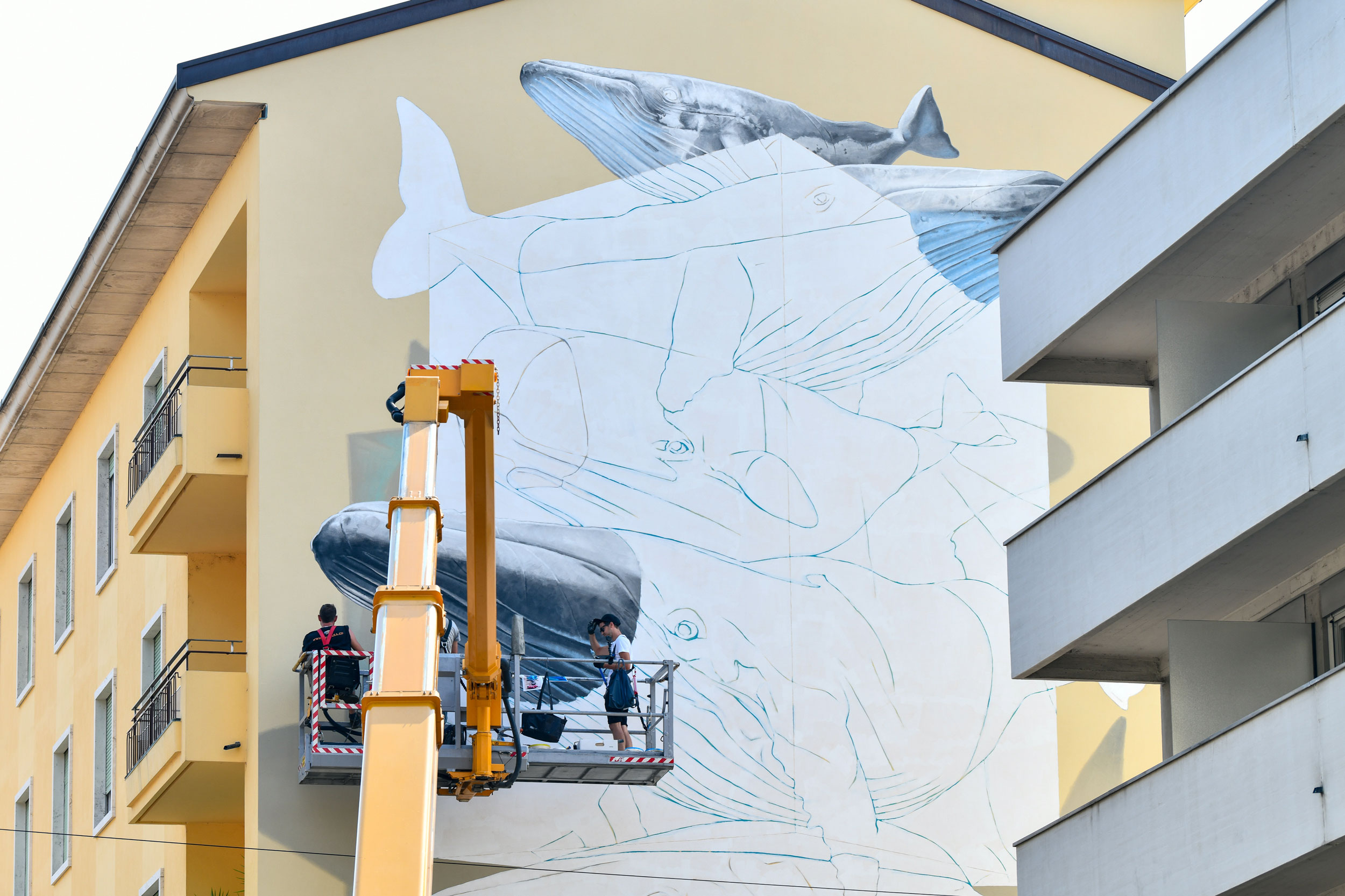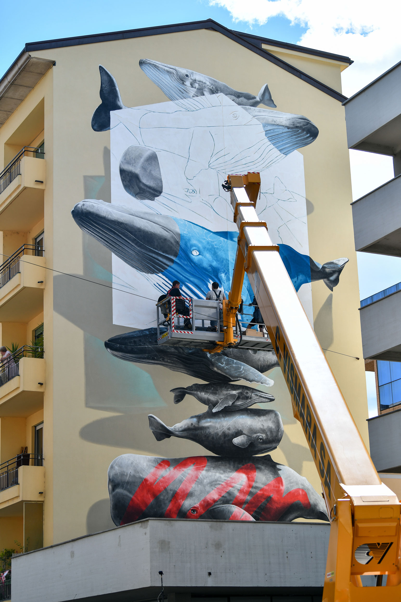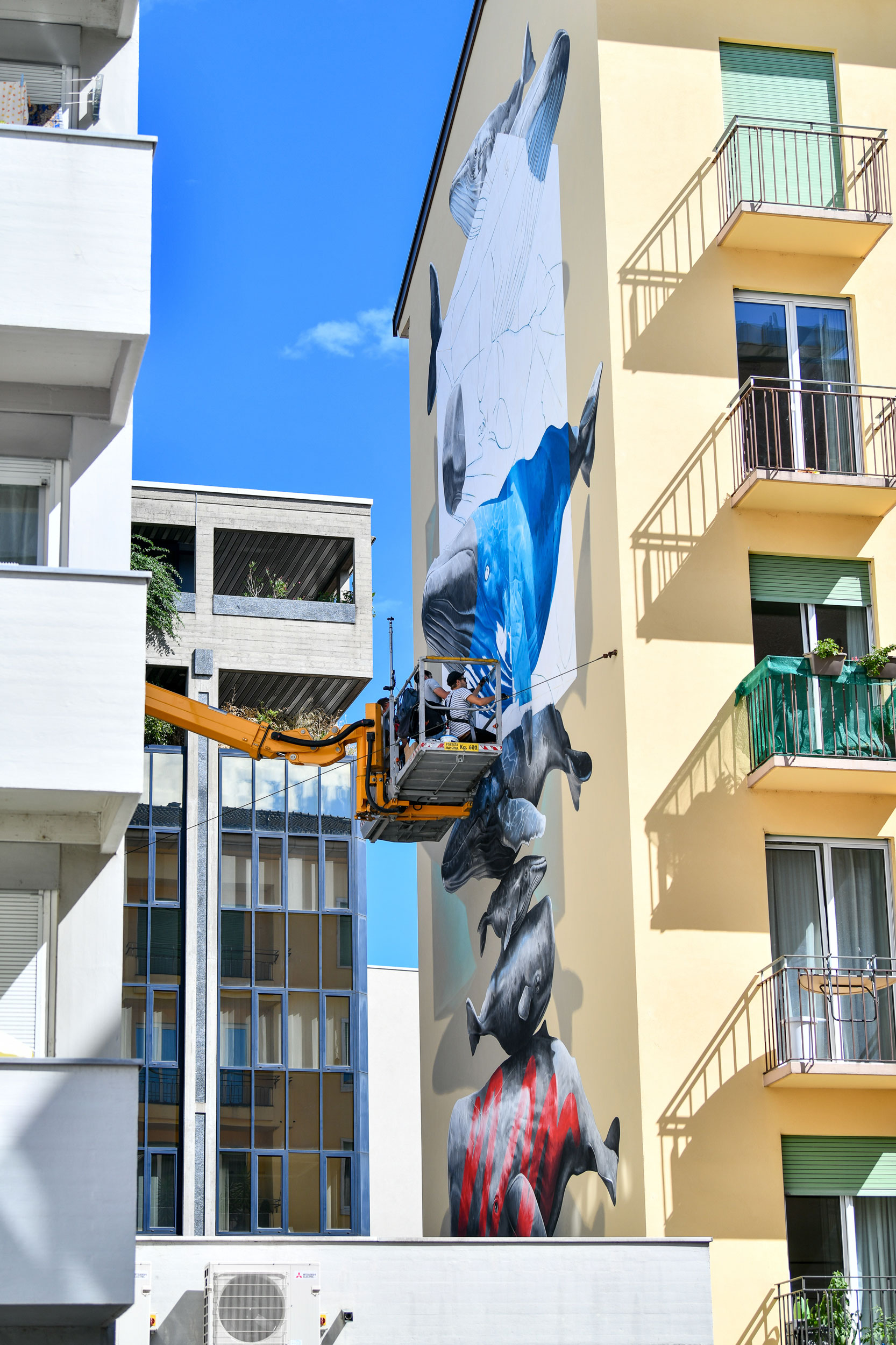 Nevercrew’s artistic career has developed mainly on an international level within the context of urban art, through the creation of murals, installations and sculptures. Their work mainly questions the relationship between humans and nature; in particular, they are interested in the effects of human attitudes on the environment, animals and society as a whole, which is seen in its complexity as one interconnected system. They therefore work on particular ‘living systems’: overviews that are made perceptible in their totality and in their structure by the act of sectioning, which allows to see them as they are inside while maintaining the perceptible global shape. They apply and generate a “simultaneous vision”, which starts from the individual mechanical or natural components up to the overall composition given by the association of different subjects, and then finally expand out automatically in a direct and personal relationship with the observer and the environment.