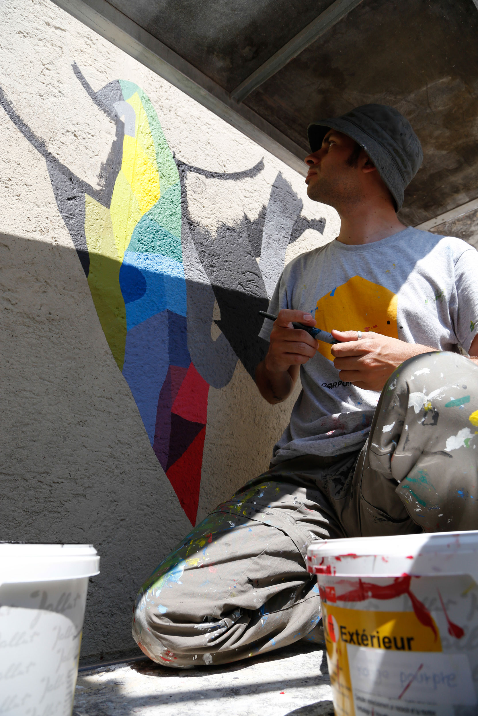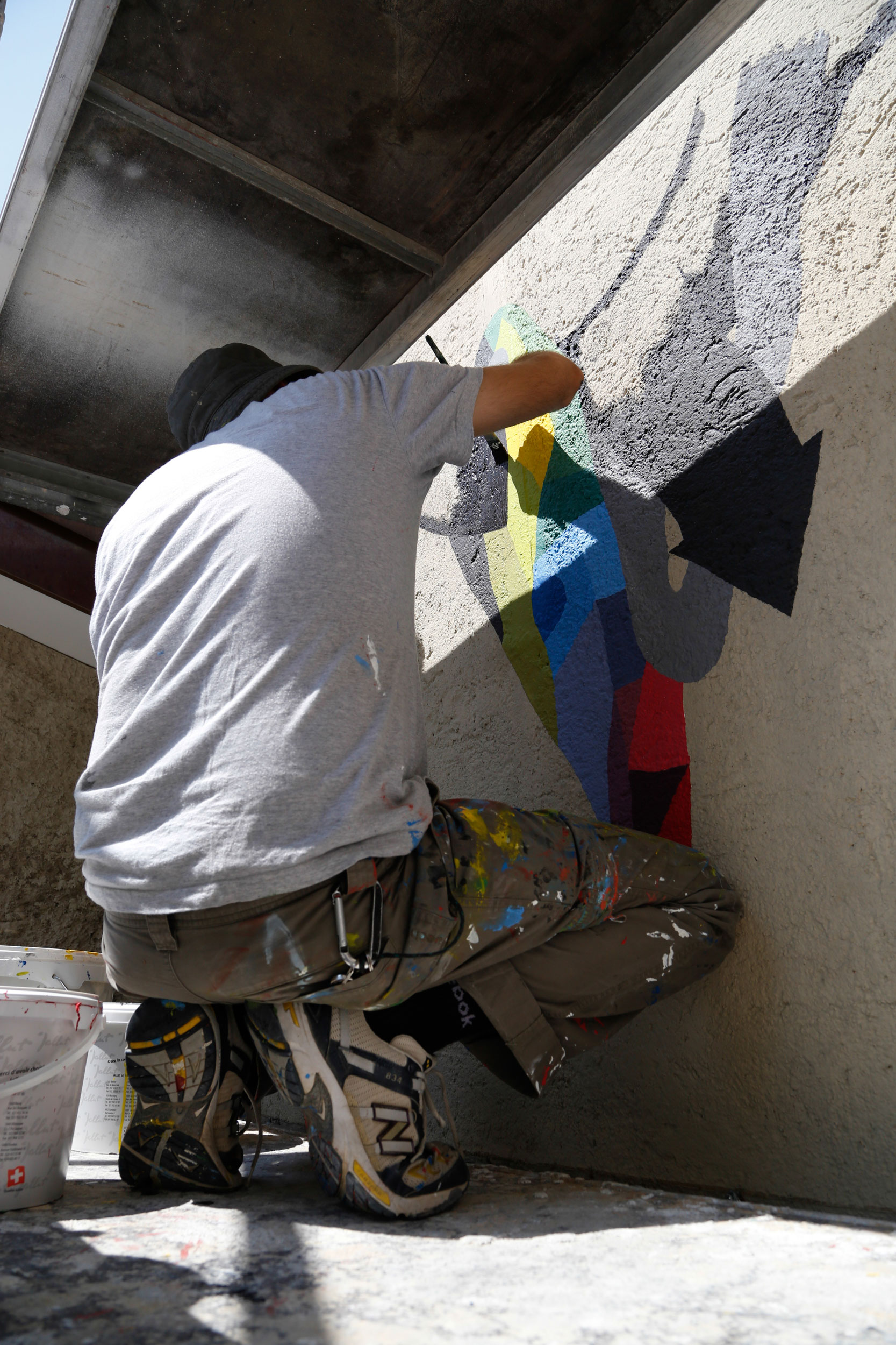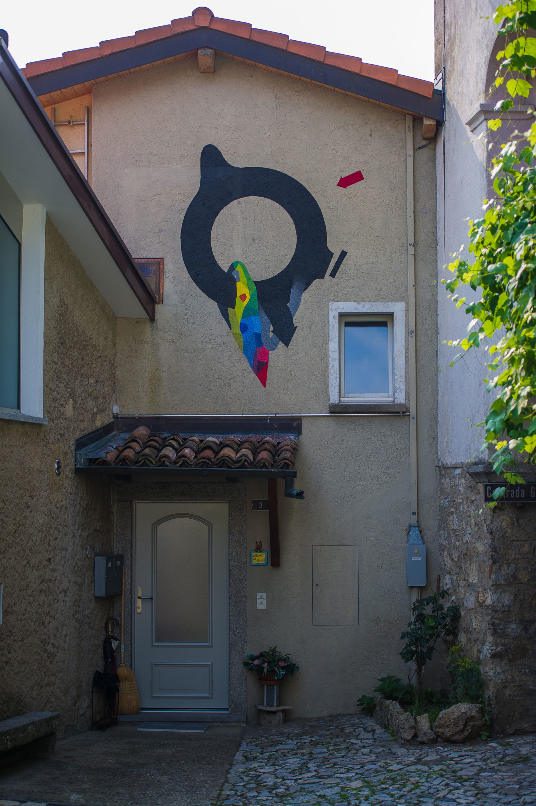 Towards the end of the 1990s, 108 decided to abandon classical lettering in order to develop a personal discourse on the abstract form in urban, industrial and natural spaces. An eclectic artist and follower of primitive art, 108 soon became an important figure in European post-graffiti art. His work is inspired by the works of Kandinsky, Richard Long, the Bauhaus and even primitive art and local shamanism. Pure forms laden with symbolic meaning, with powerful references to the world of the subconscious, which distance themselves from any kind of representation of the known, have been posted on the walls of half of Europe: from large urban centres to suburbs, from country villages to smaller towns like Lugano. The painting is on a wall of a private house in the village of Bré above Lugano, a mountain village that has remained faithful to the rural architecture of times gone by, while being enriched by various works of art located throughout the old village centre.