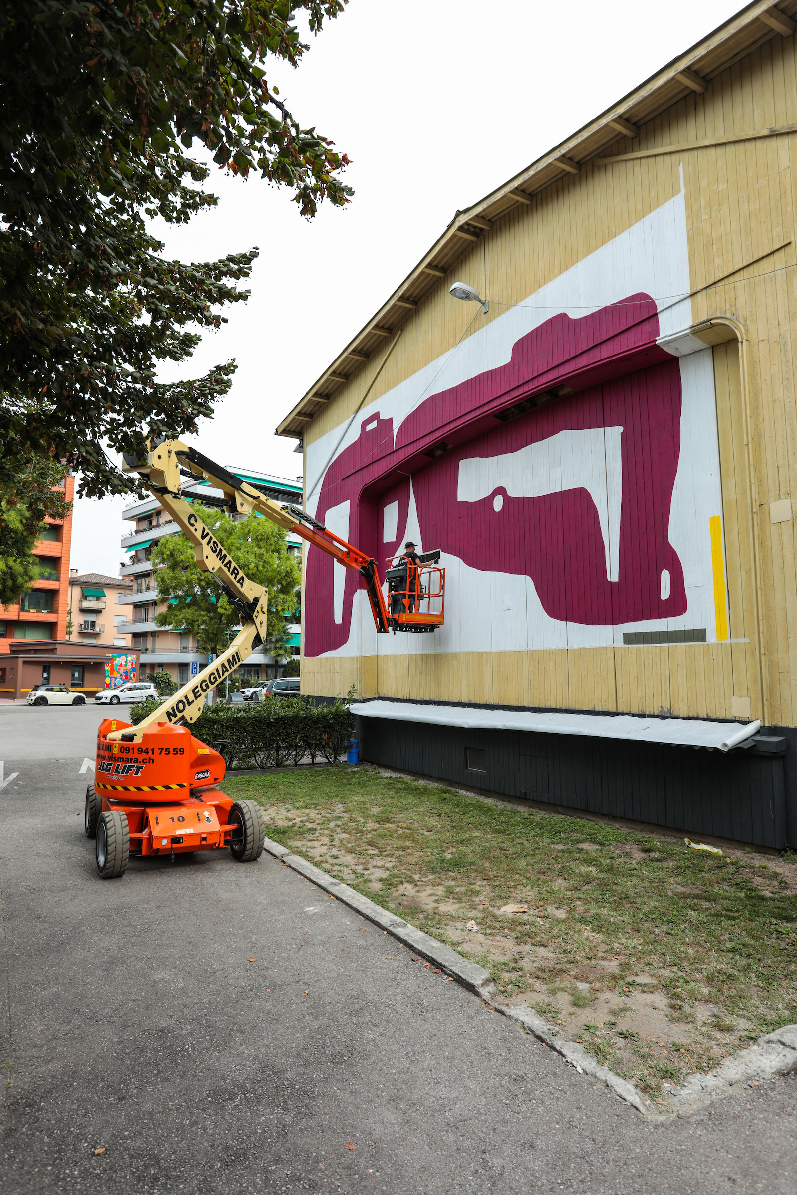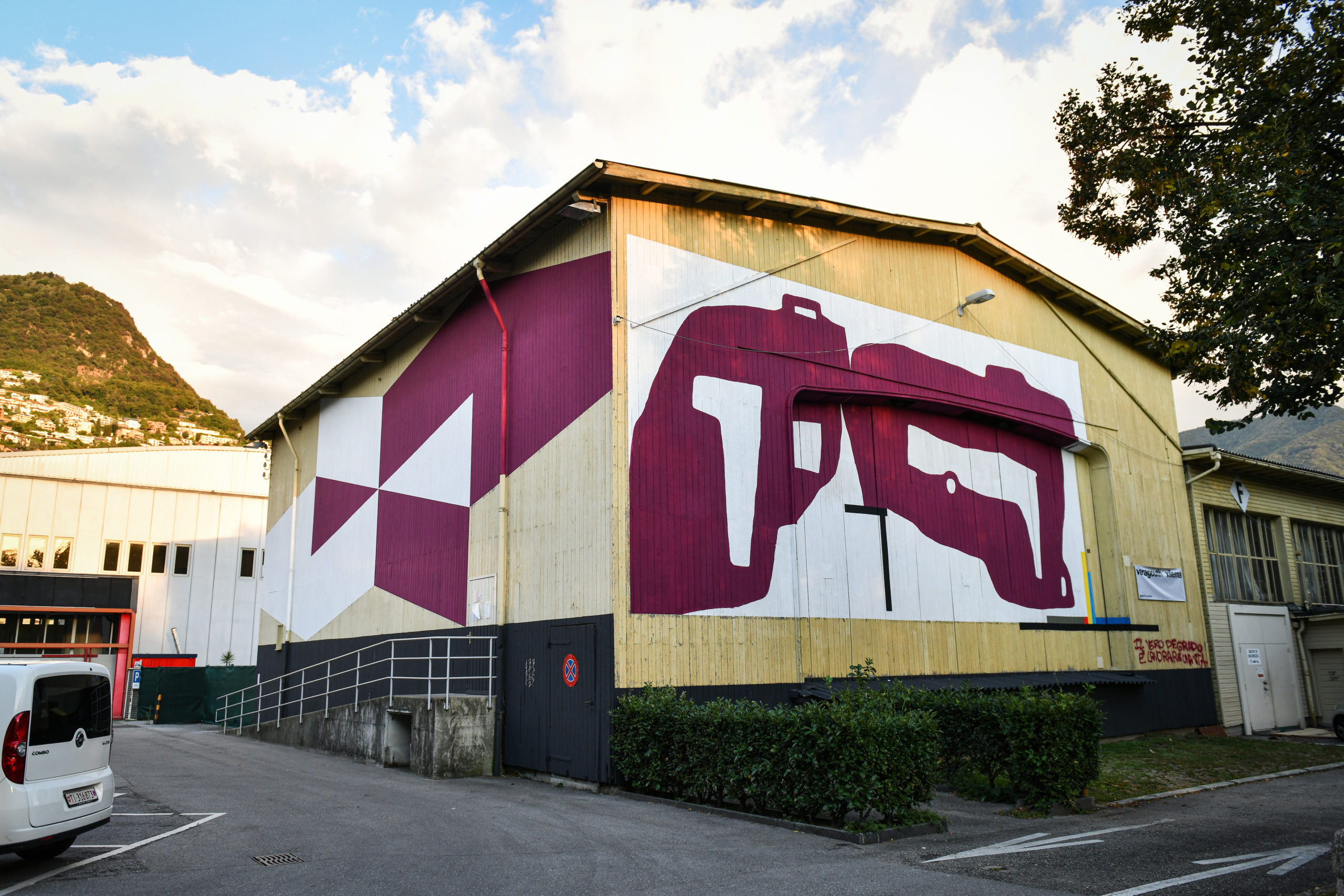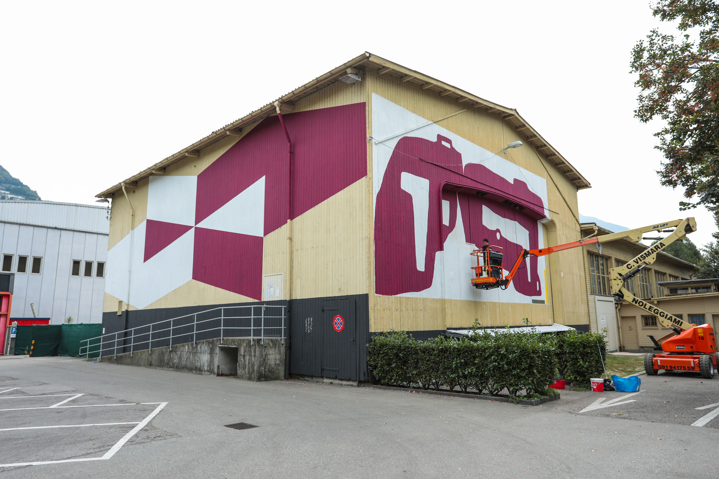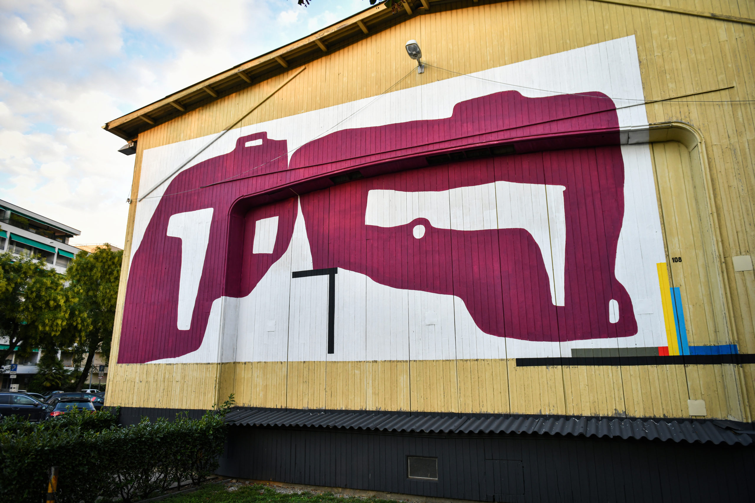 Two renowned artists from the Italian and international scene, 108 (Guido Bisagni) and CT (Matteo Ceretto Castigliano), worked on two walls of the Padiglione Conza (Campo Marzio side) to create two closely interconnected works. The two artists have in fact been developing a joint project for quite some time now: interventions that interact, converse with and compare one another, without ever totally merging into one. In fact, there are many similarities between them: in addition to their abstract and minimalist approach and the unity of the shapes and colours used, they share a particular awareness of the search for essence and formal harmony. Being both miles from the pop world, they pursue an intimate and profound search, a free and almost total immersion into shapes and colours. The individual path of each artist, however, always stands out: the systematic, soft and mostly profoundly black forms of 108 are thus combined with the sharper, more rigorous and geometric ones of CT. Two works that come together to form what can be defined as a single, but also a joint piece of art, thus one that is able to encompass the full complexity of two personal approaches in dialogue and in constant exchange with the surface on which they have been painted and the surrounding environment.