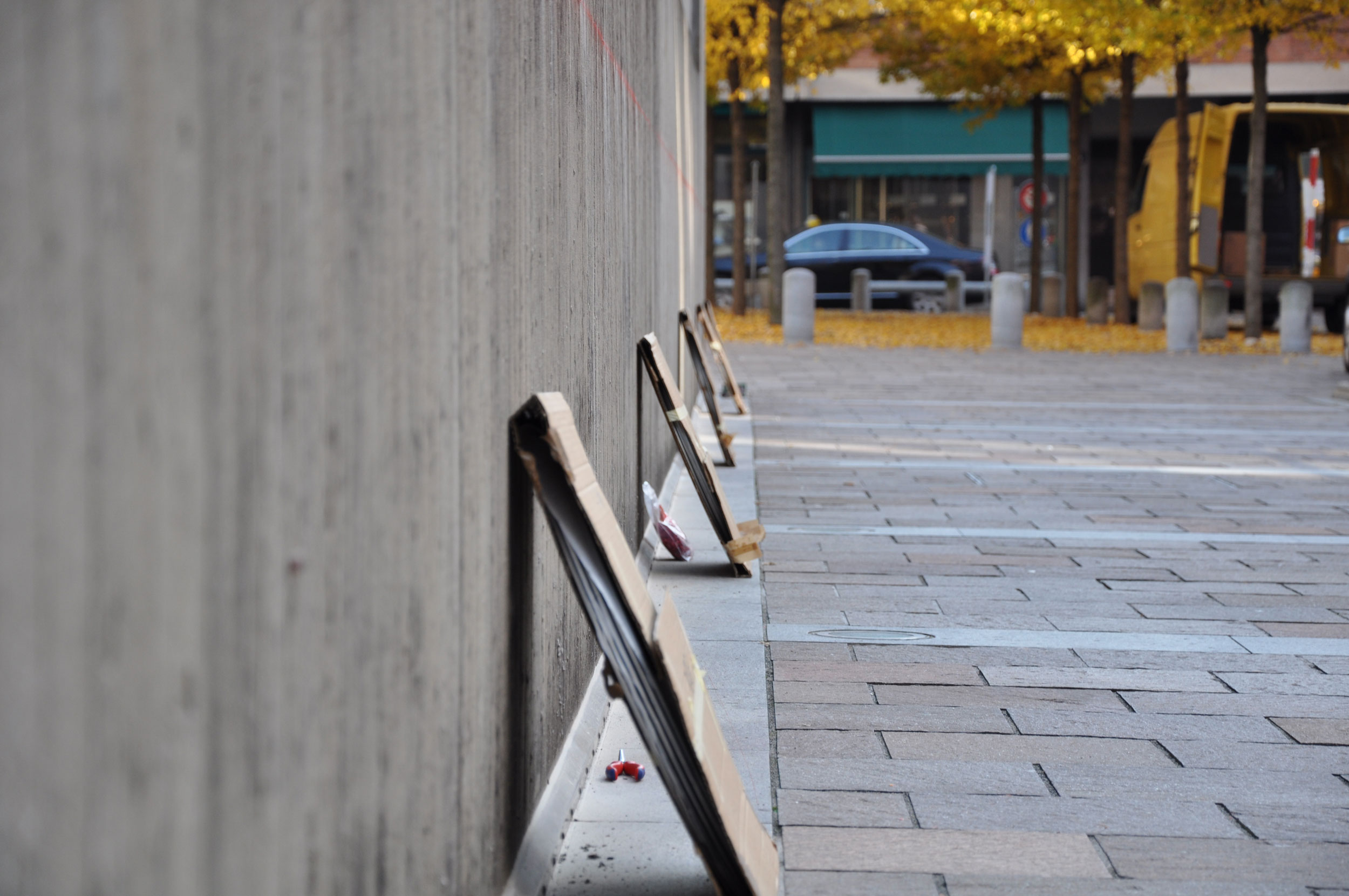 Le installazioni Cartelli, collocate in diversi luoghi della città, rappresentano una nuova chiave di lettura della segnaletica stradale. Oggetti all’apparenza banali che hanno come funzione primaria la regolamentazione della circolazione stradale, qui vengono decontestualizzati perdendo il loro significato originale e acquistando una nuova interpretazione. I cartelli sono disposti in modo da creare delle forme suggerite dalla geometria stessa del segnale sia dall’ambiente urbano circostanze. Le loro qualità estetiche vengono messe in risalto a scapito del loro significato simbolico originario sorprendendo il cittadino nella sua quotidianità, permettendogli di vedere lo spazio urbano in modo totalmente nuovo e inaspettato. Per questa installazione sono stati utilizzati 40 cartelli di fine limite, del diametro di 60 cm ciascuno.