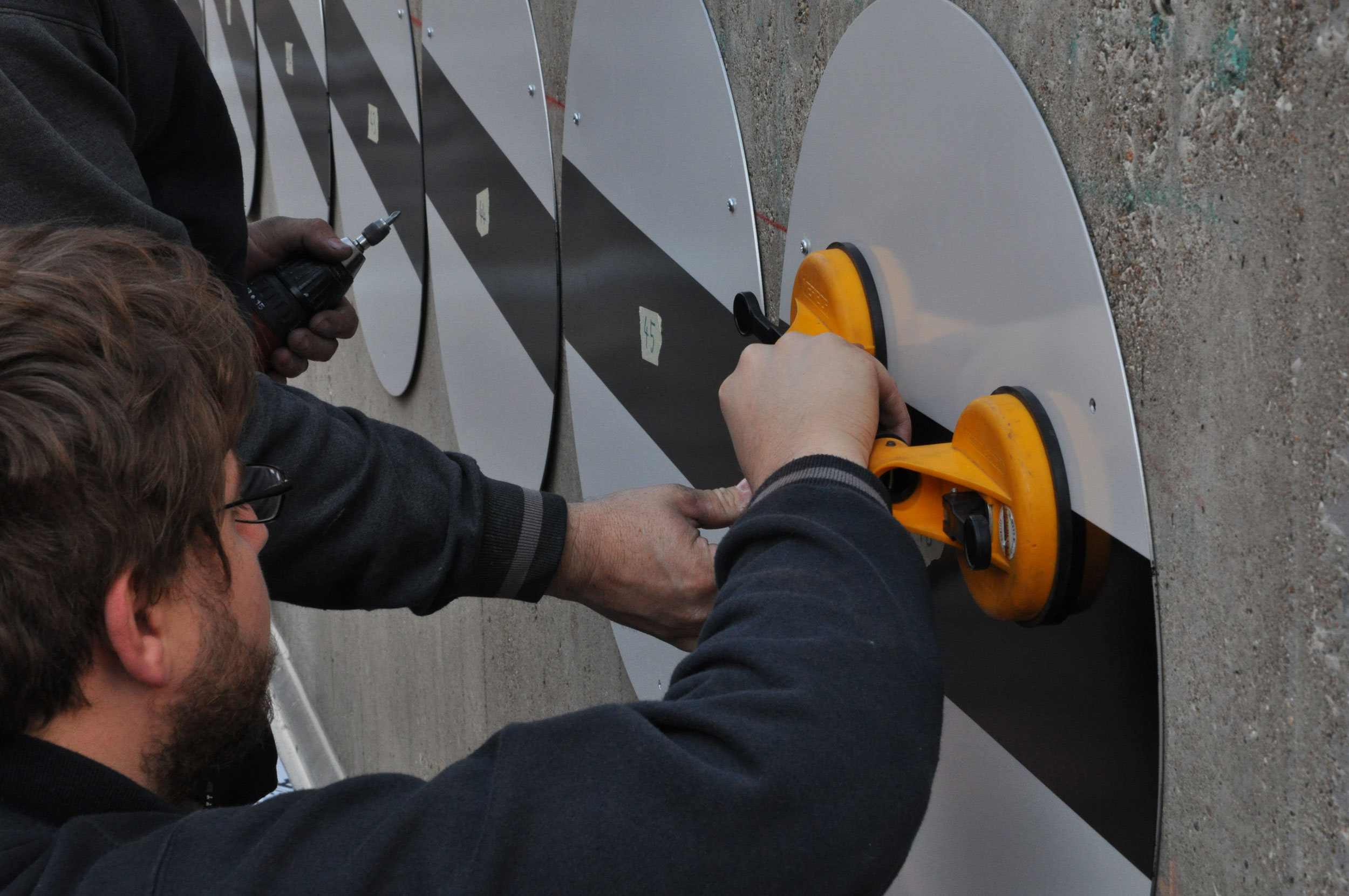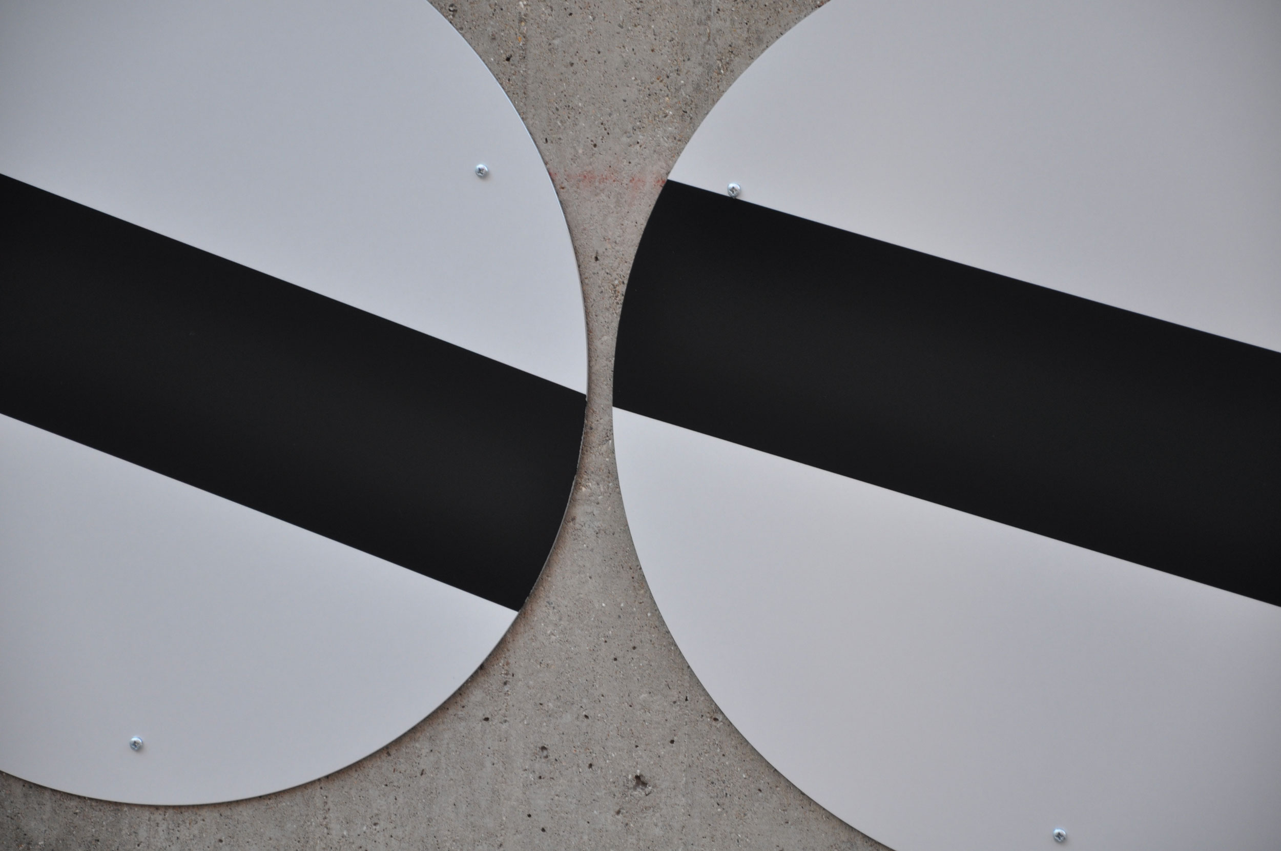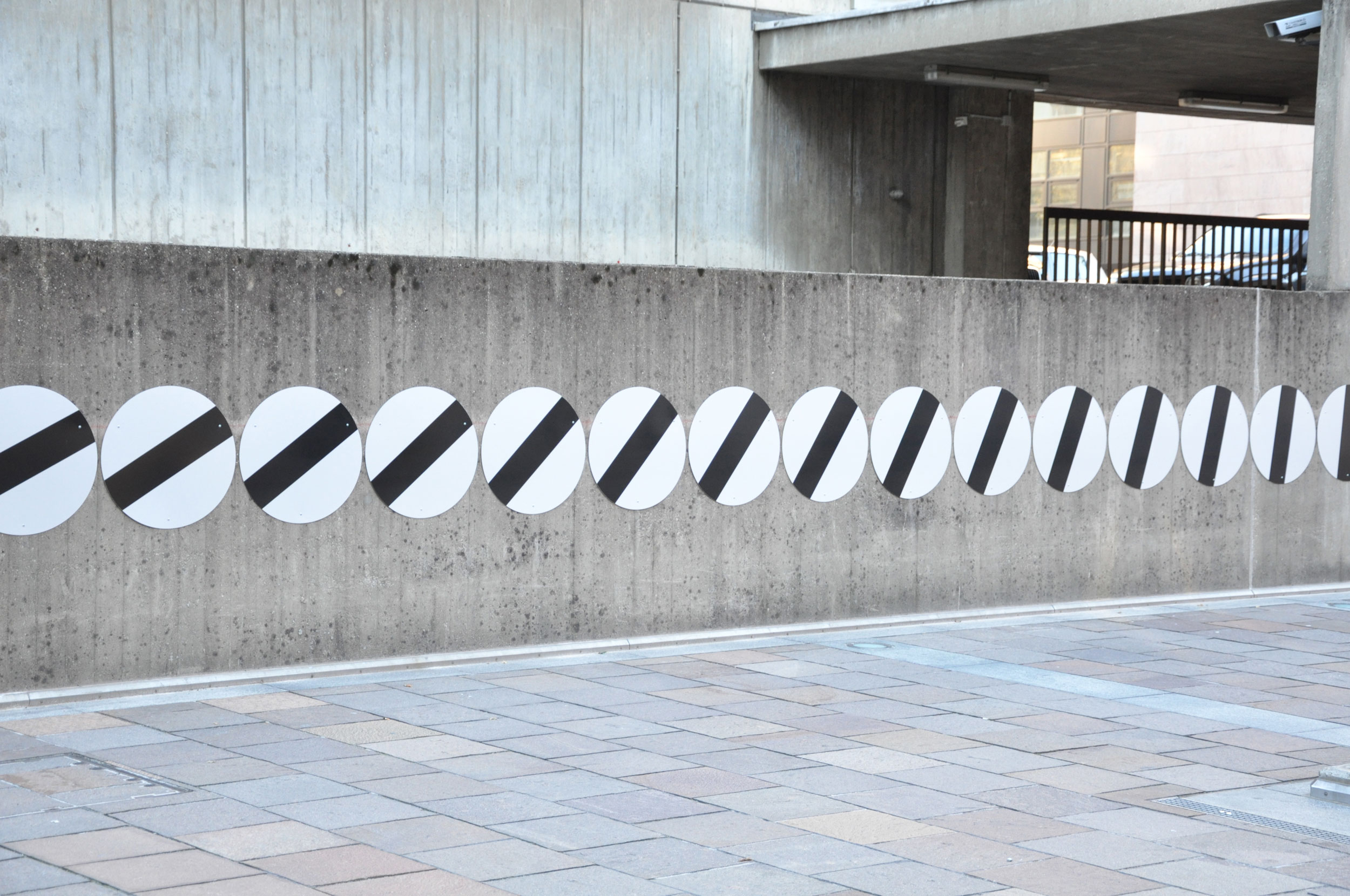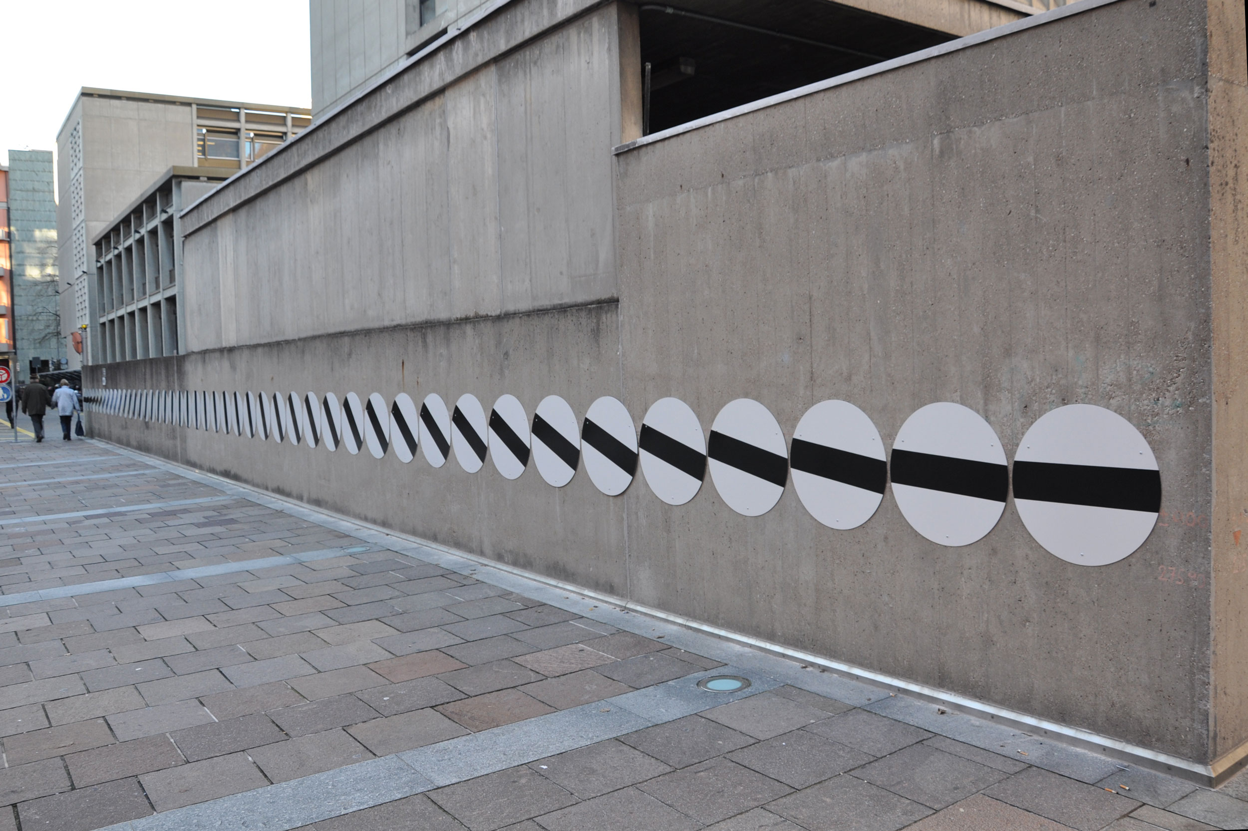 The Signs installations, placed at various locations around the city, offer a new way of reading road signs. Seemingly mundane objects whose main purpose is to direct road traffic are taken out of context, losing their original meaning and taking on a new interpretation. The signs are arranged so as to create shapes suggested by both the geometry of the sign itself and the surrounding urban environment. Their aesthetic qualities stand out to the detriment of their original symbolic meaning, catching passers-by unawares as they go about their daily lives, allowing them to see the urban space in a totally new and unexpected way. For this installation, 40 end-of-speed-limit signs were used, each with a diameter of 60 cm.