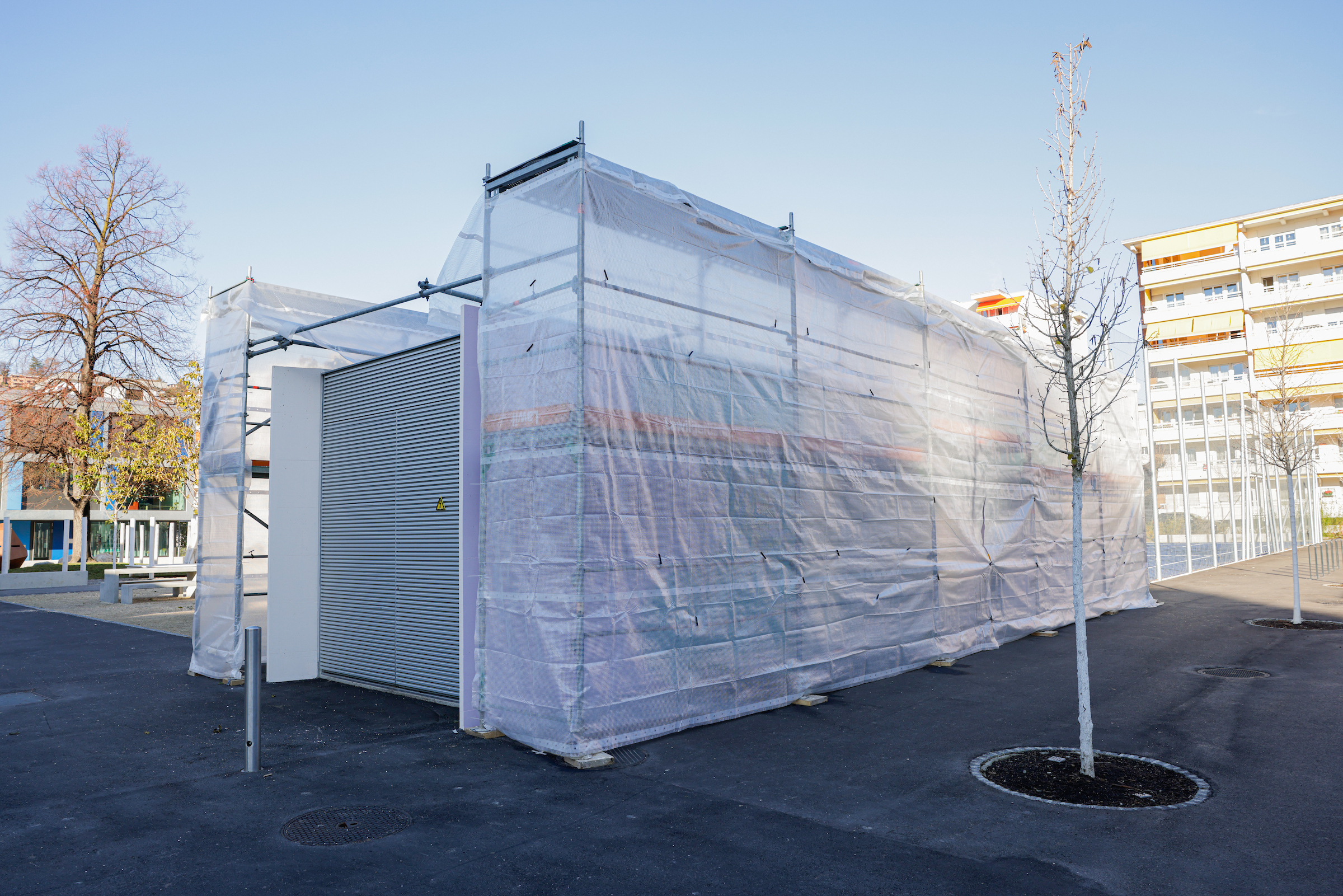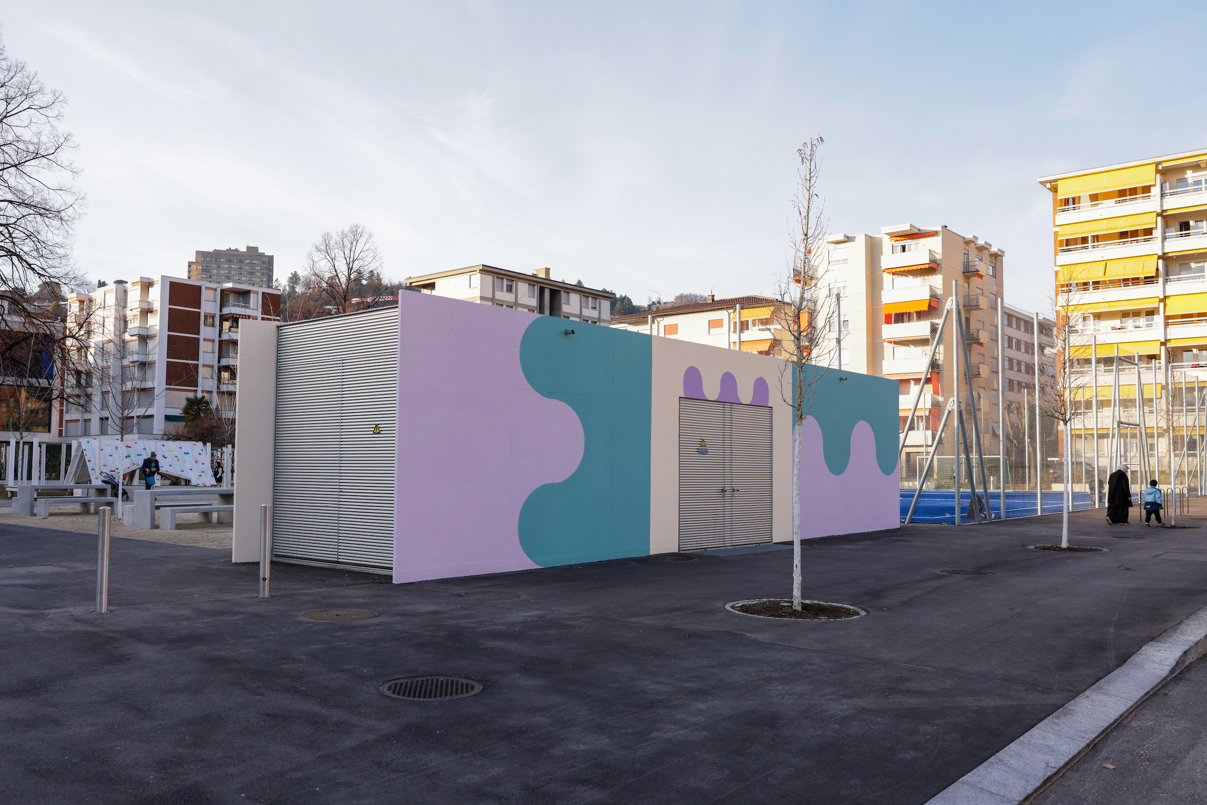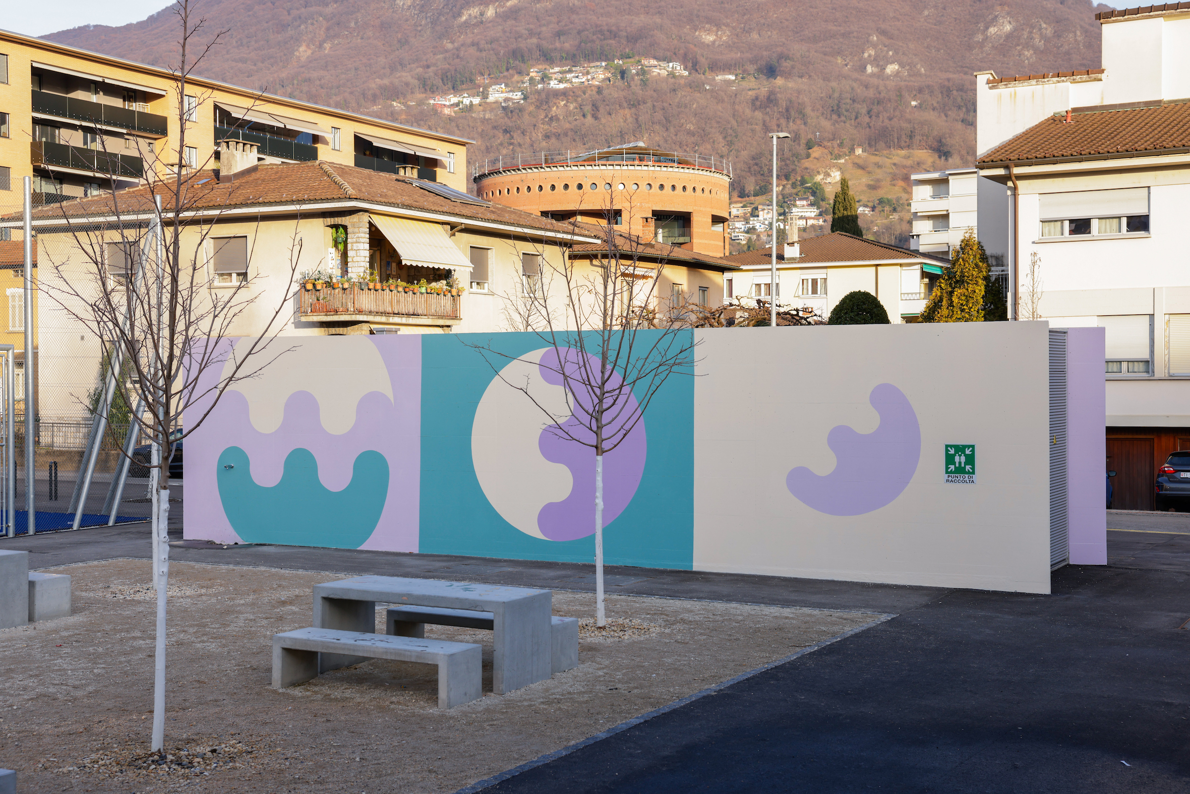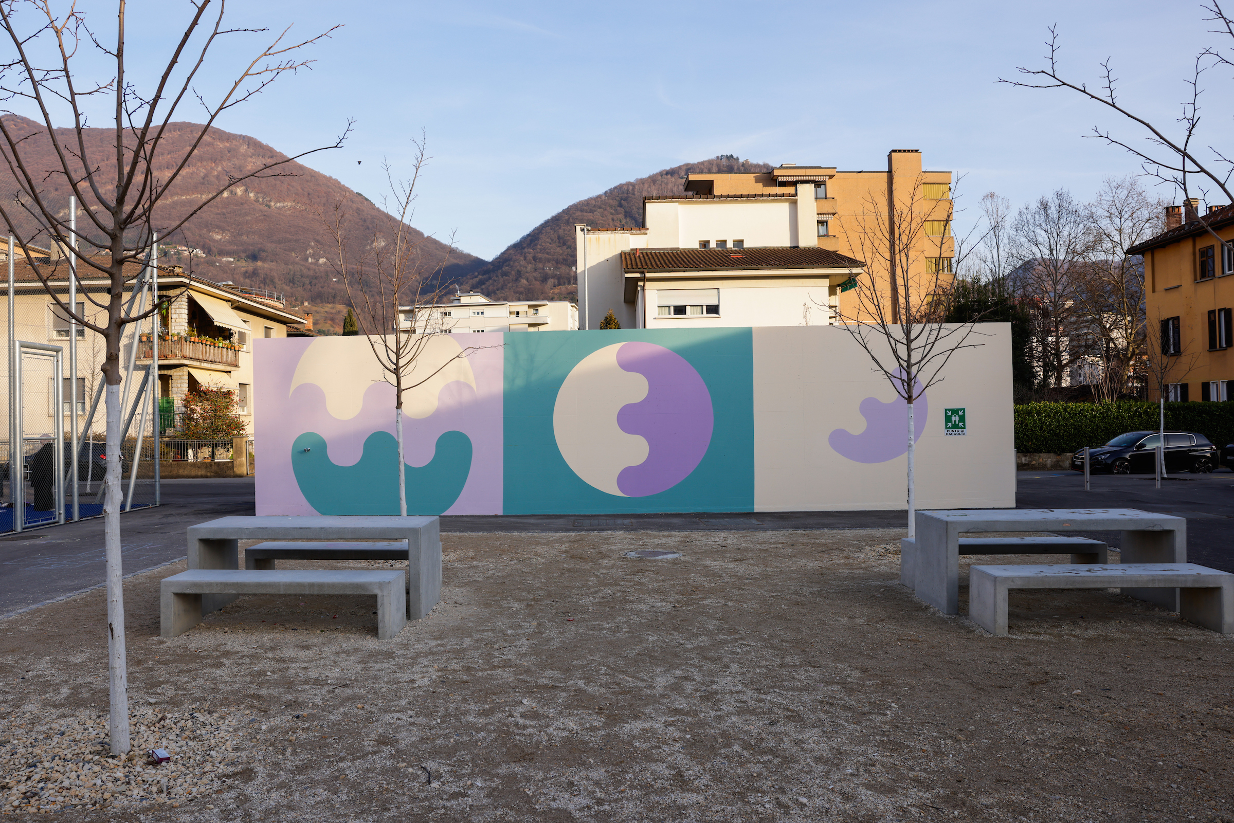 Per l’intervento artistico Armonia n.5, Milly Miljkovic e Katia Piccinelli, dopo aver studiato delle composizioni astratte dalle linee tondeggianti e sintetiche, si sono ispirate alle fotografie aeree del complesso scolastico: la visione dall’alto offre infatti una tendenza di dominanti sinuose e curvilinee, molto diversa da quella che se ne ha a livello del suolo, dove vigono la verticalità e le linee dritte. L’intervento è inoltre stato pensato per dialogare con lo spazio circostante e inserirsi nel complesso con armonia. Riferendosi all’universo infantile, i bambini sono infatti i principali frequentatori di questi spazi, si sono formati spontaneamente degli “abbracci cromatici” di taglio geometrico e dalle campiture piatte, che a tratti si uniscono e a tratti si cercano nello spazio.