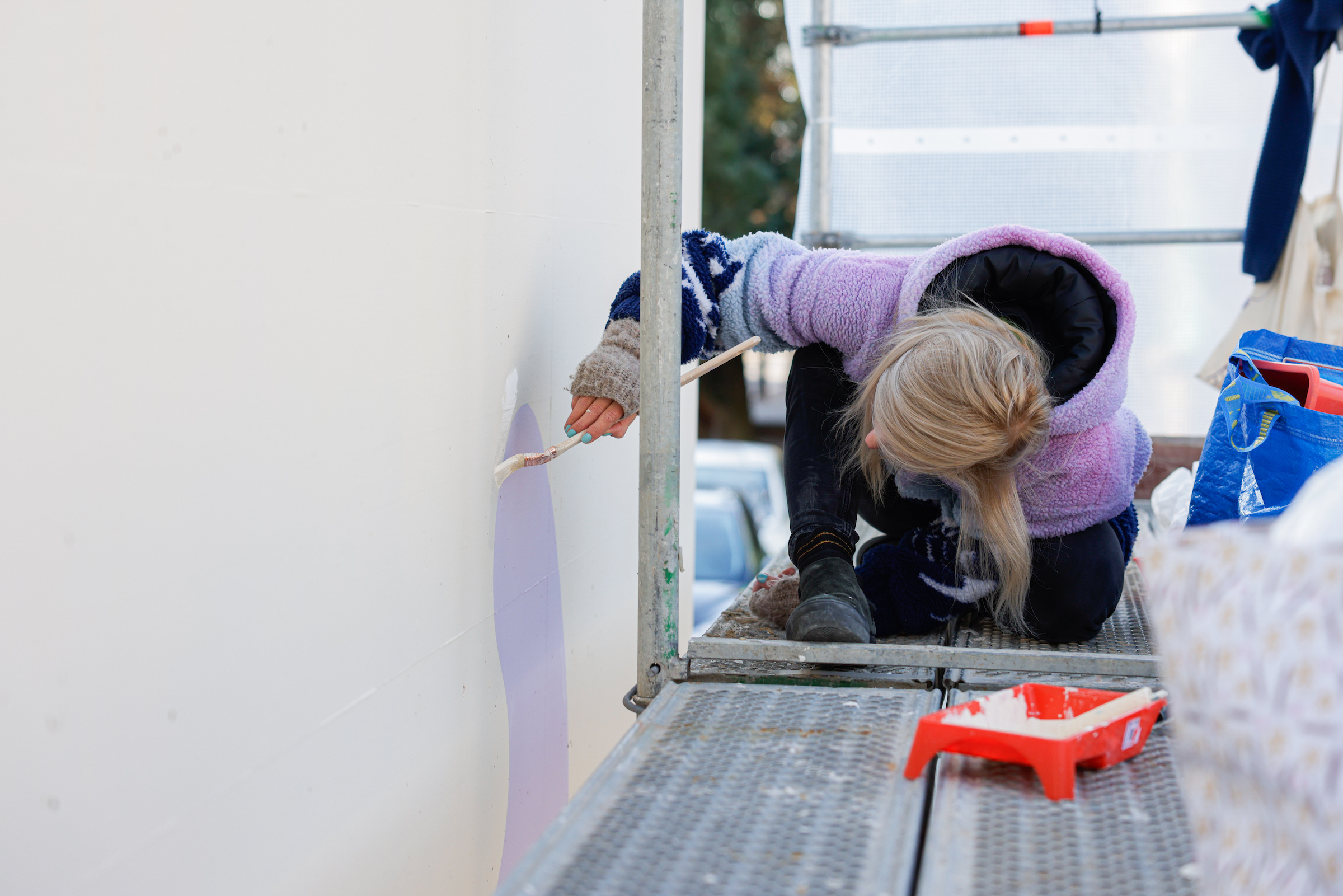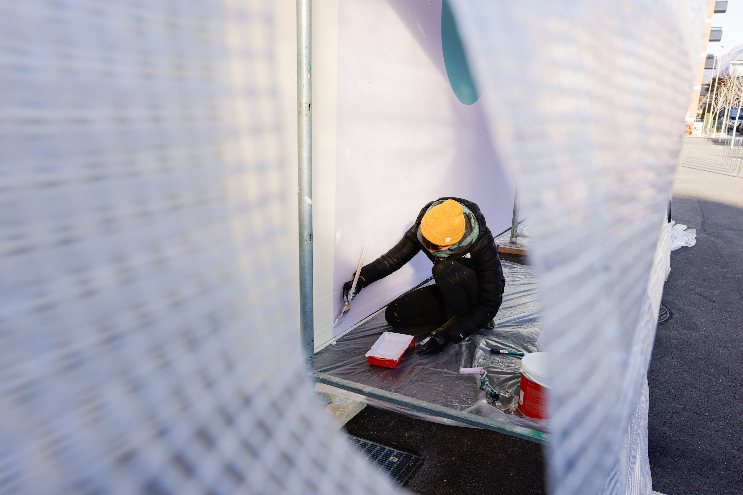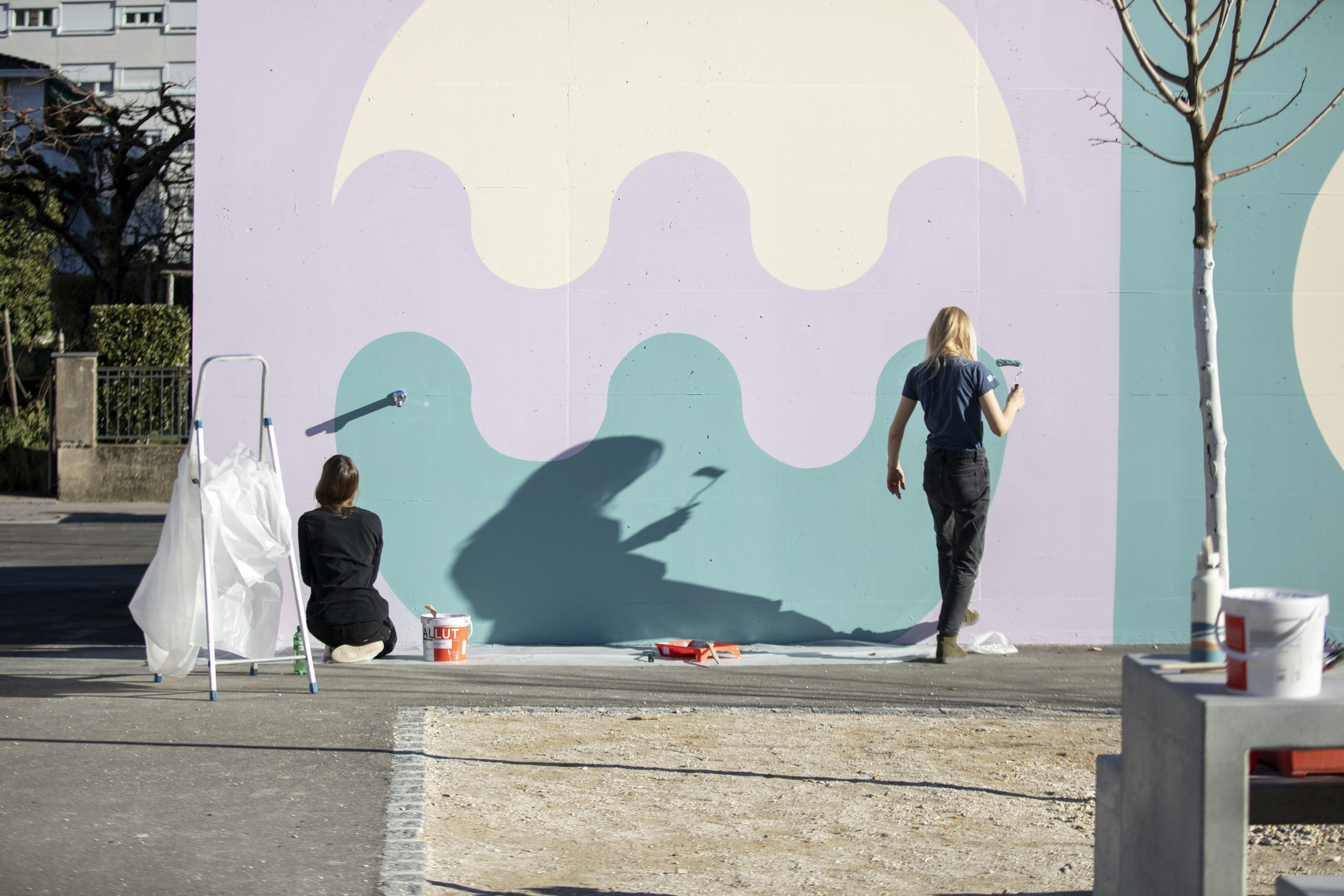 La scelta del materiale, la composizione grafica ed i colori scelti, sono elementi distintivi dello stile e del linguaggio delle artiste, che in occasione di questo progetto, lavorano insieme per la prima volta su un muro esterno, creando un tutto omogeneo e coerente.