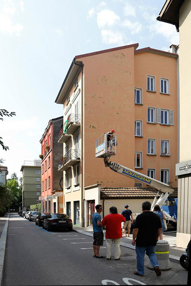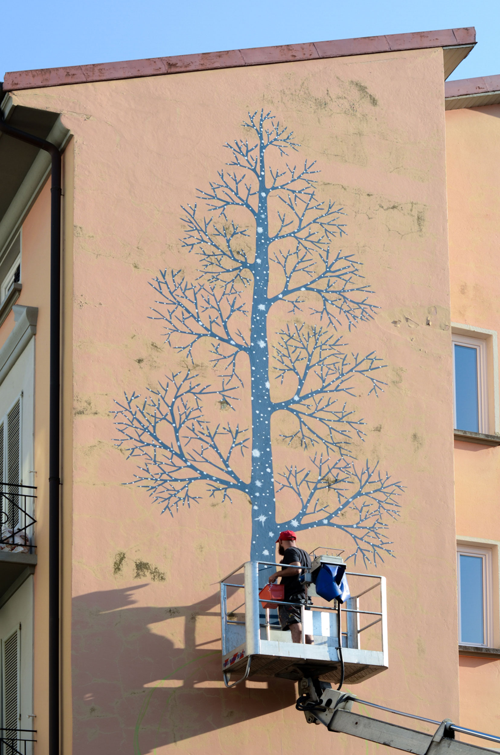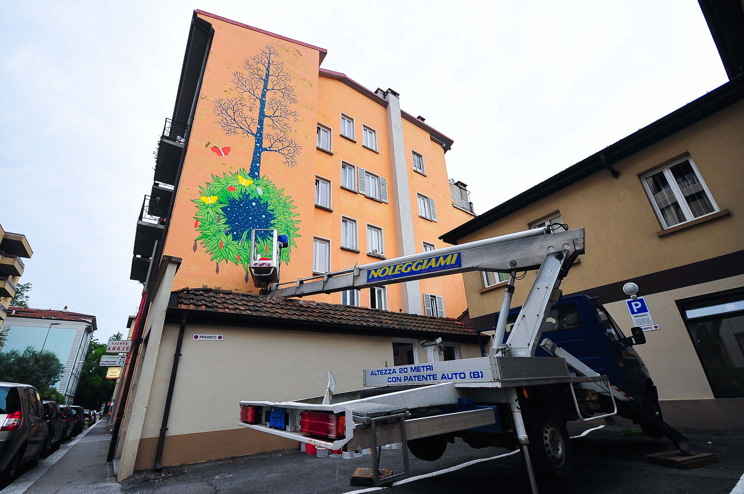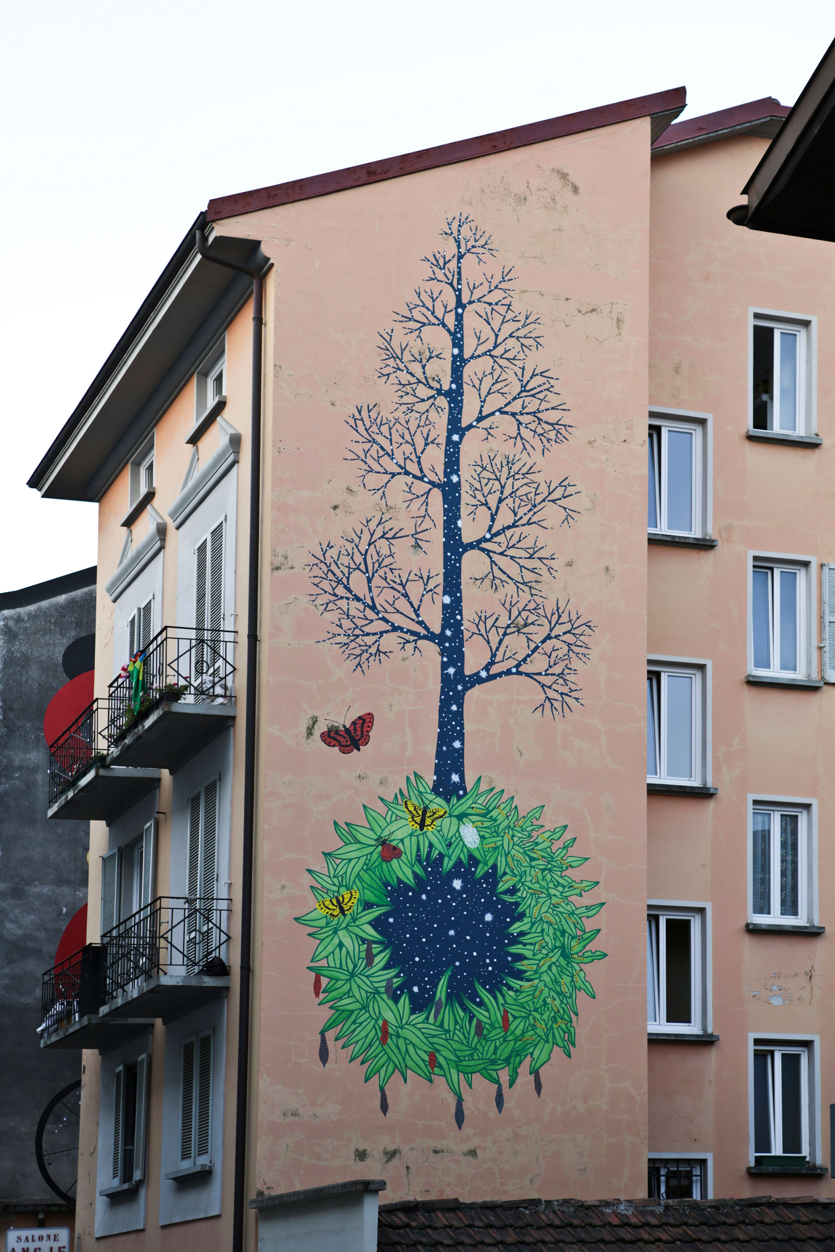 The work of Dem, an Italian artist born in 1978, is constantly inspired by complex and diverse indigenous traditions and cultures, and in particular their way of relating to nature. The characters in his works are therefore somewhere between the human and animal worlds: deliberately enigmatic, mystical and open to every possible interpretation. The artist, in line with the leitmotif of his entire artistic career, gave the City of Lugano a large mural depicting the relationship between the animal world and nature. In keeping with his style, this work also features an enigmatic and mystical composition, open to many interpretations. The artist took full advantage of the vertical wall at his disposal by creating a specially-made representation for the location.