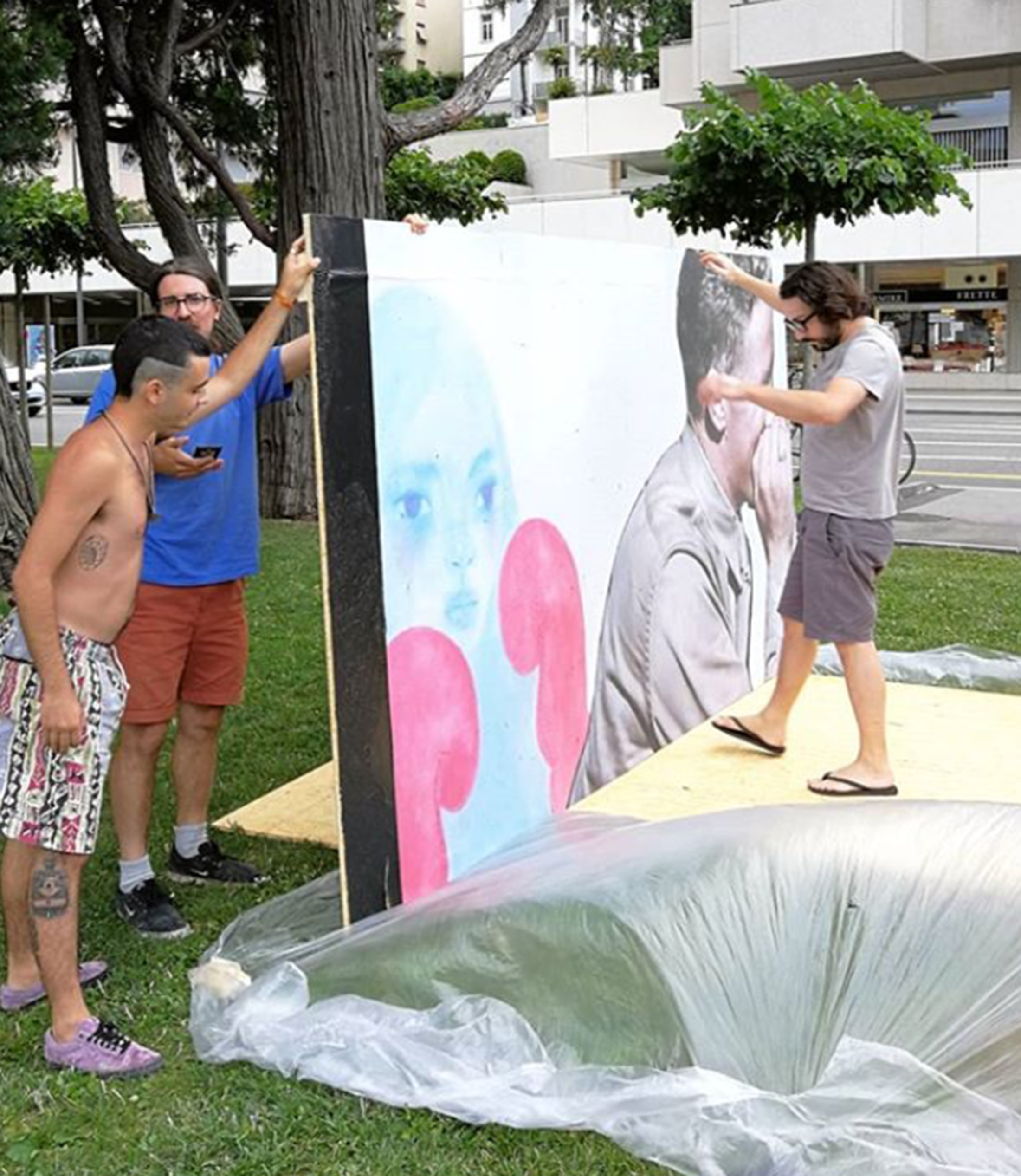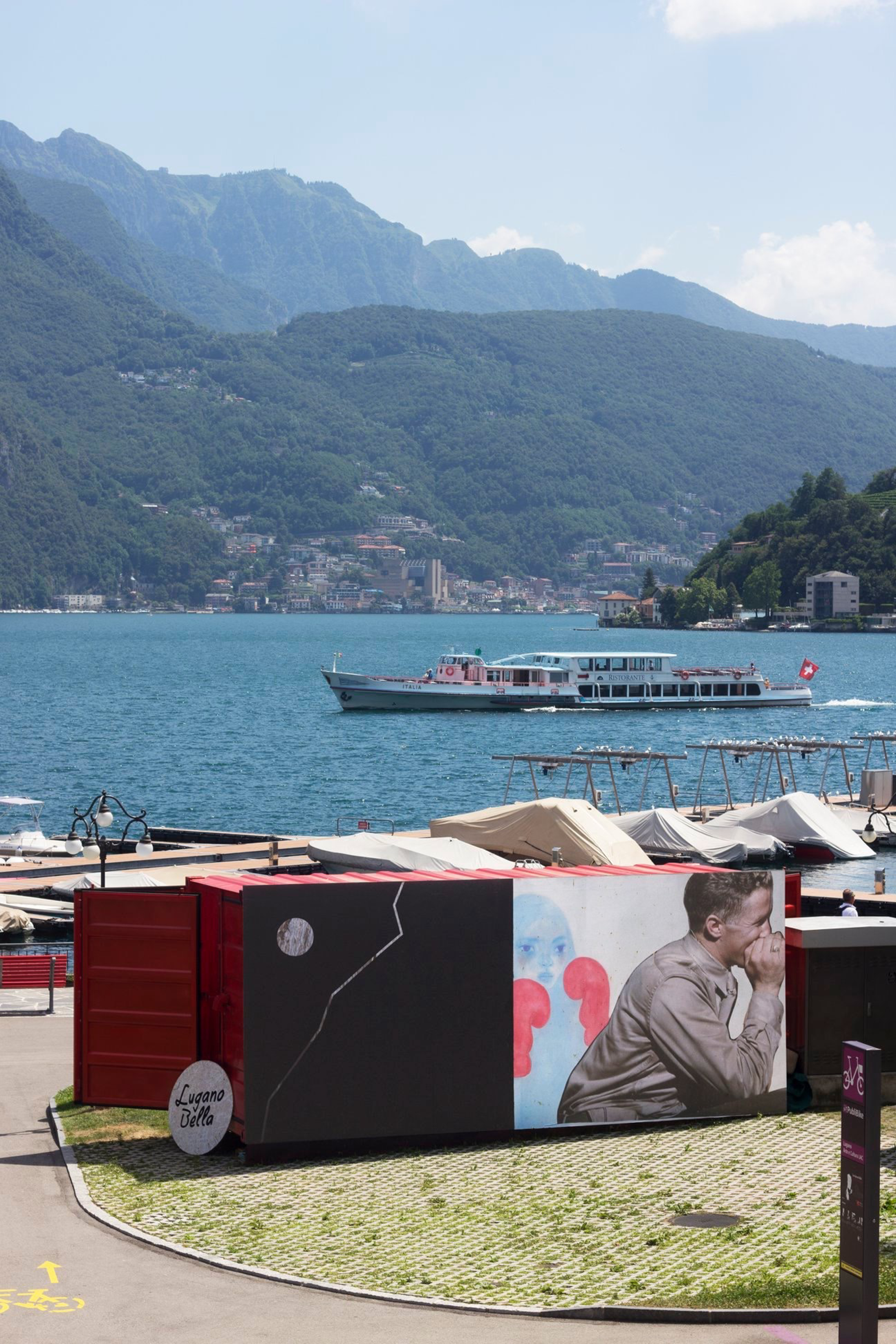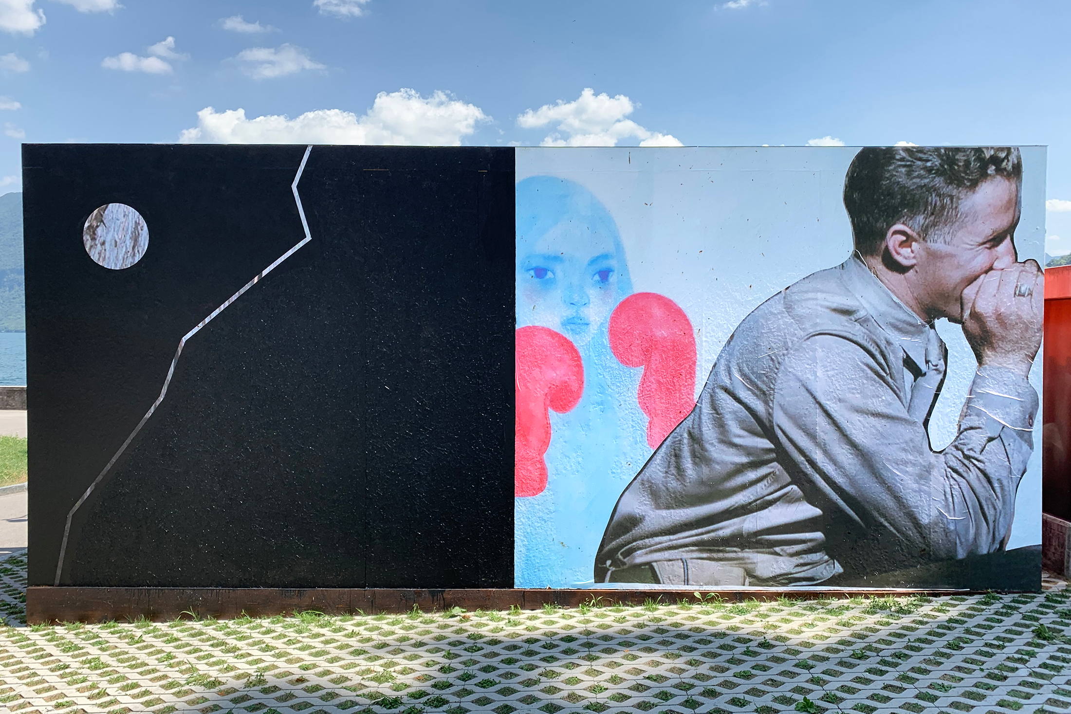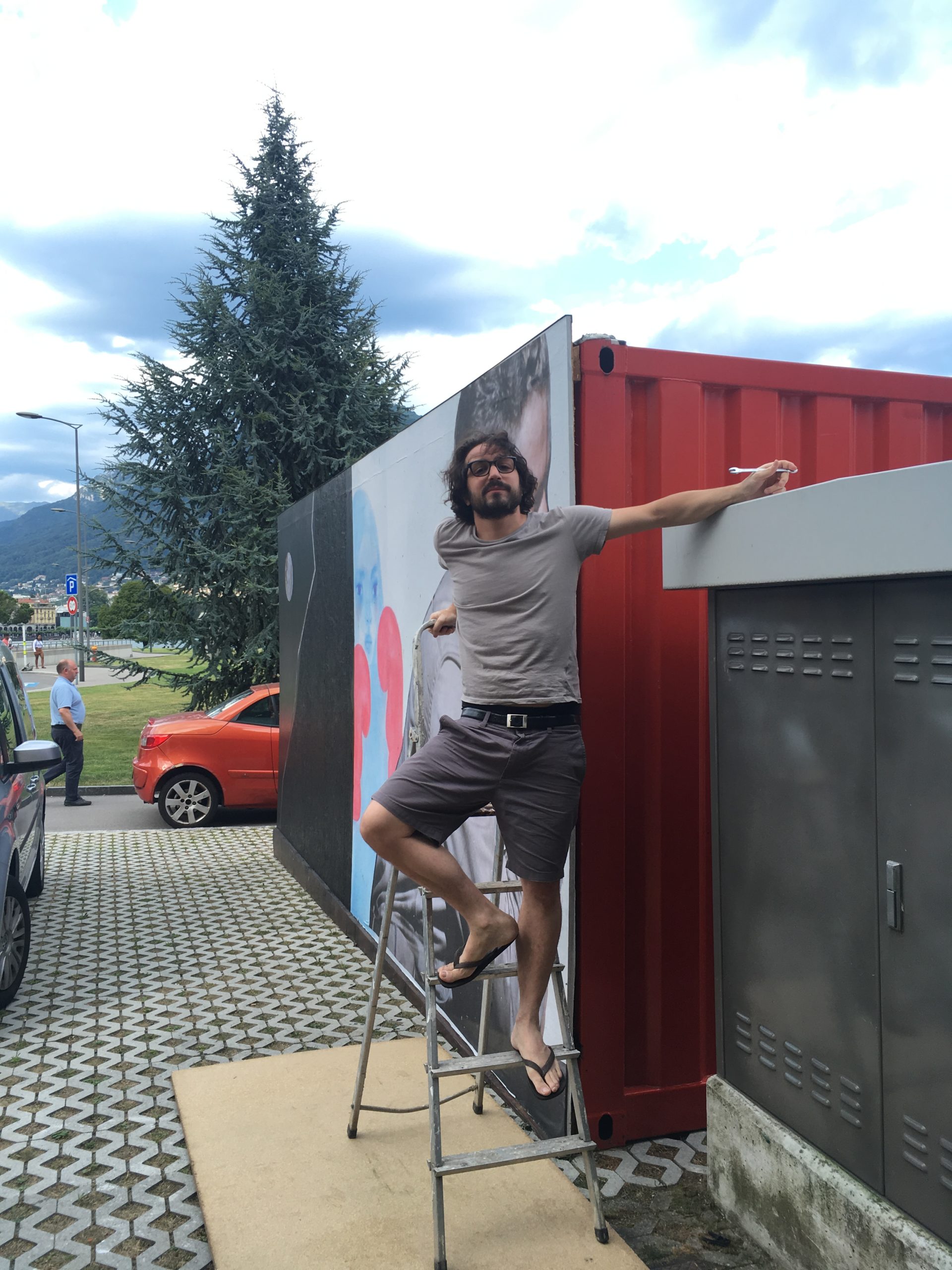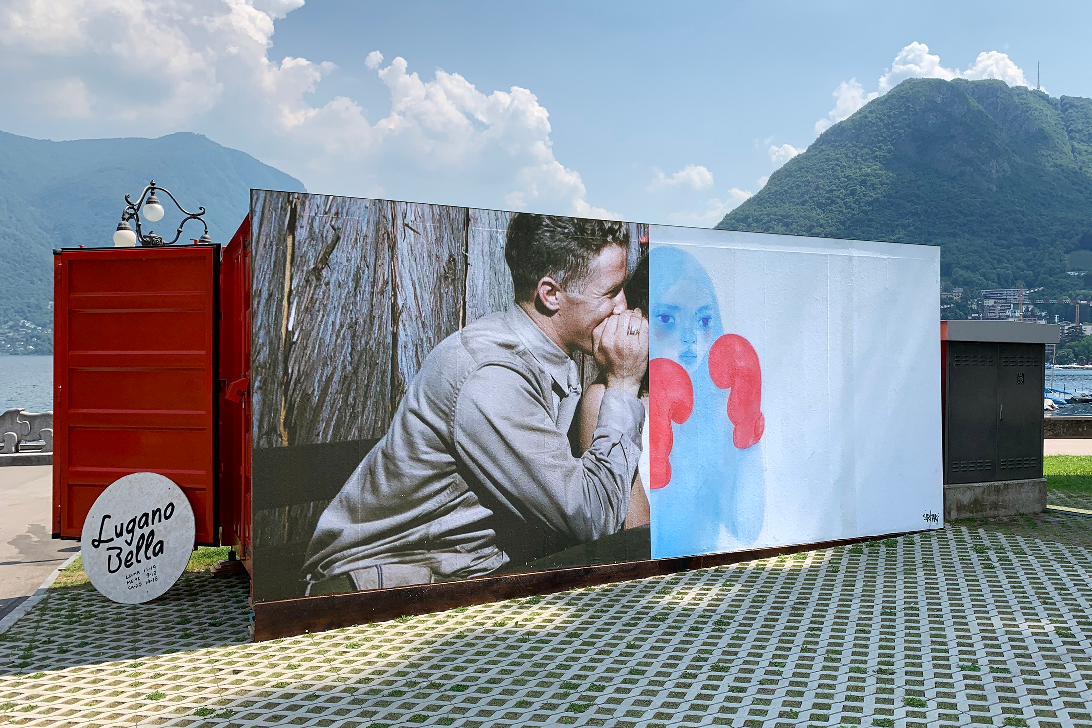 Since 2019, artwork has been posted on the back wall of the temporary red container at Lugano Bella, a meeting and selling place for goods and wares from the thriving local scene. The first intervention, a collage entitled Elly Santoro, was created by the artist Sir Taki from Massagno. The panel was then modified in collaboration with Kevin Carrozzo, to seal the friendship of the two artists who met on the lawn of the Rivetta Belvedere. While the painting was being created, it was possible to interact with the artist and watch his work take shape.