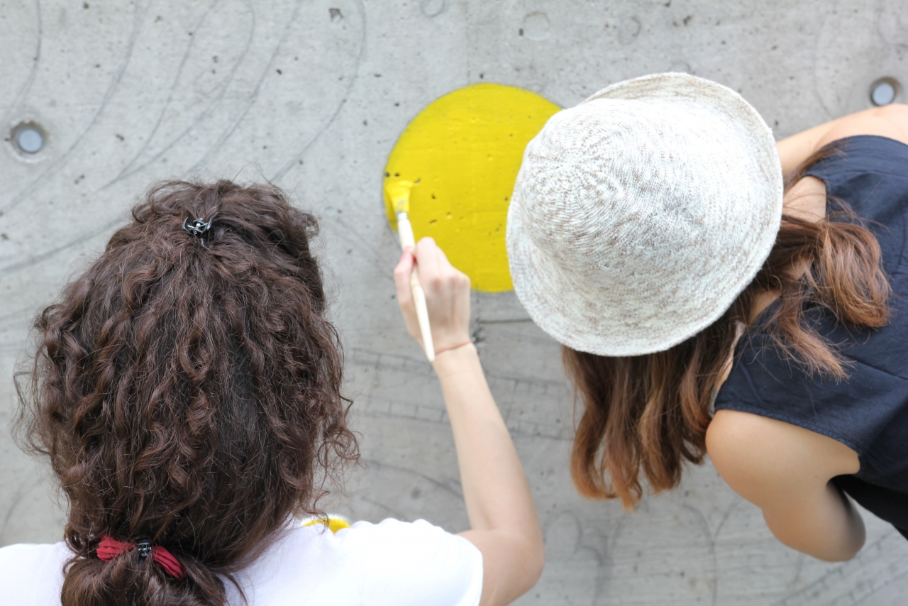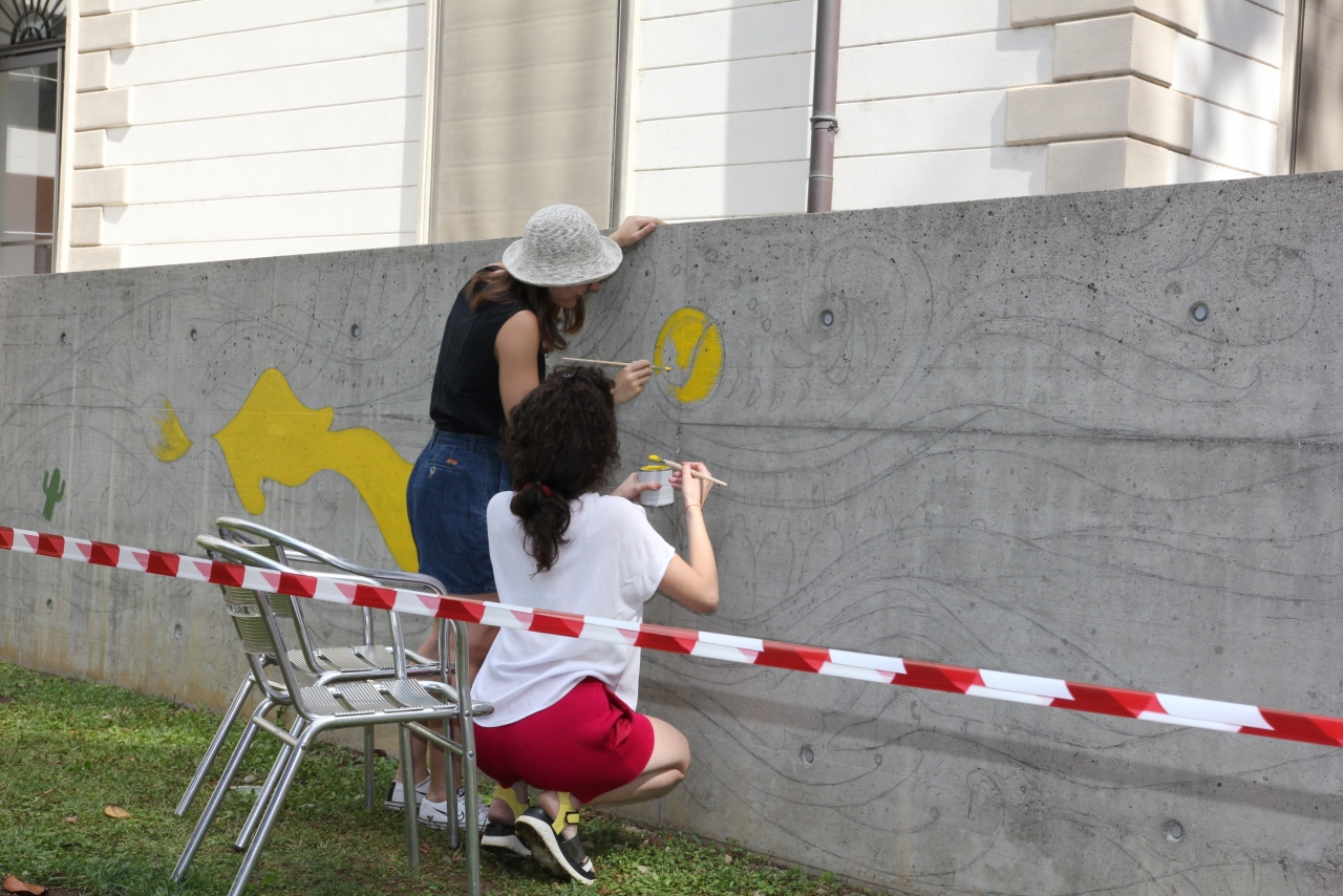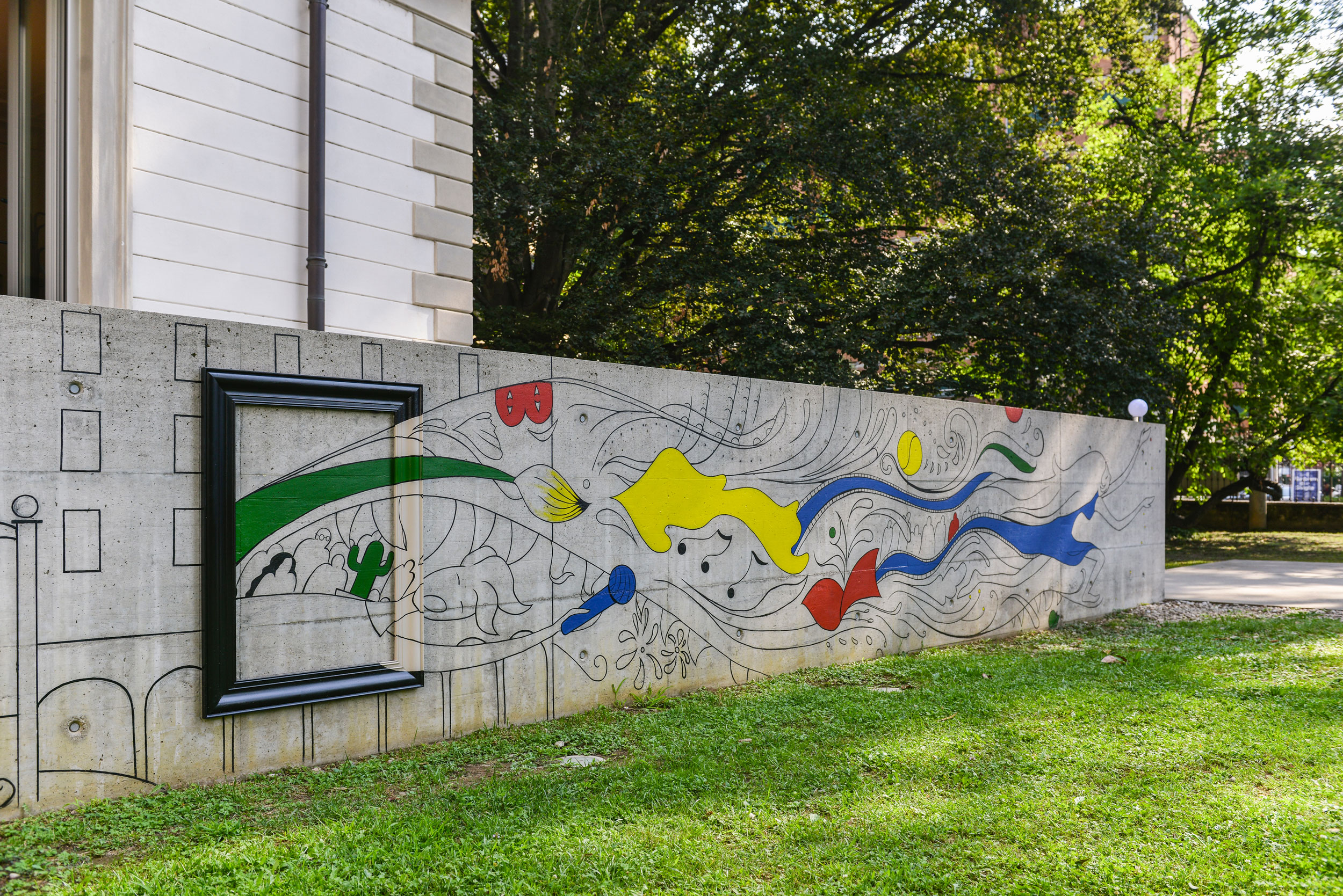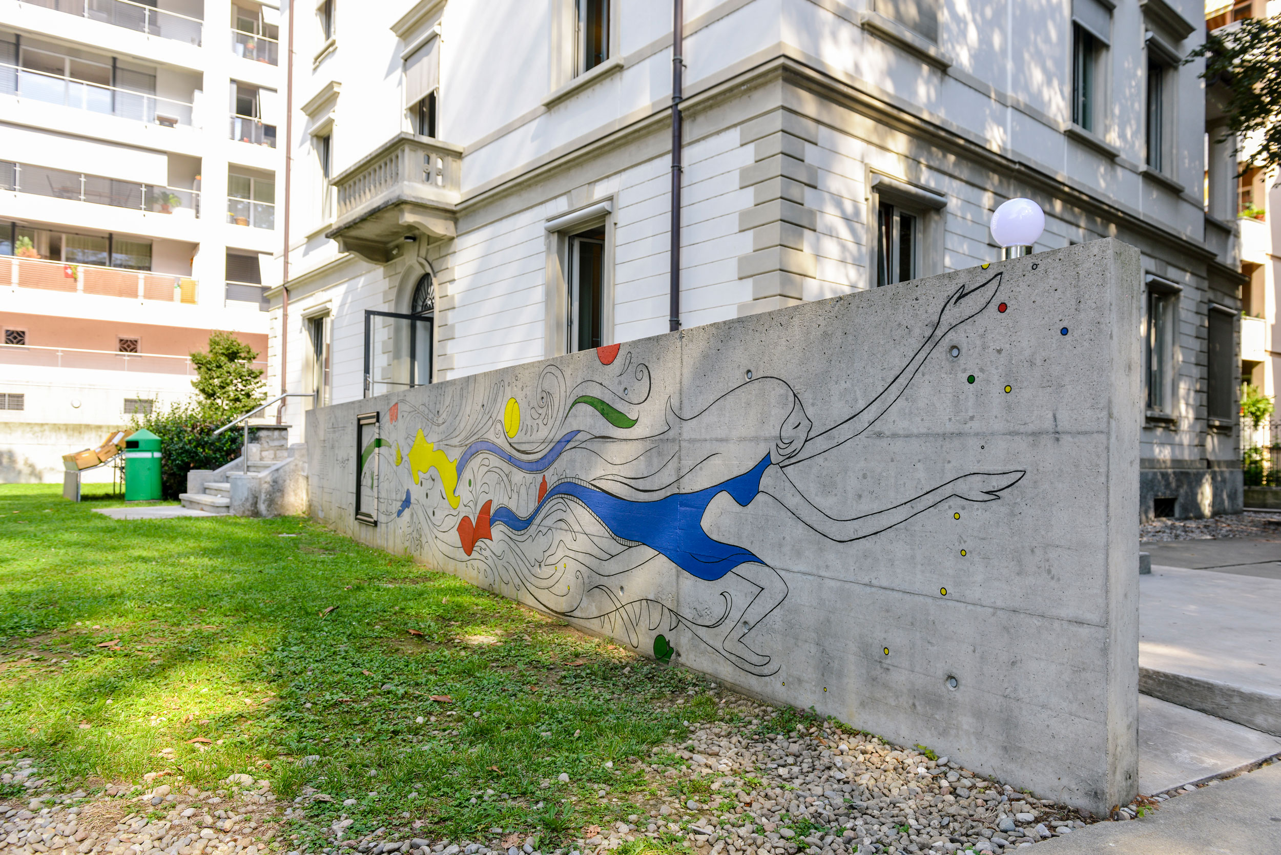 FLUX is a mural incorporating both the building of Villa Carmine (headquarters of the Events and Conventions Division of the City of Lugano) and what happens inside it: ideas and events. A project that is intriguing, whose small coloured elements draw the eye, urging it to seek out and understand the other forms of the black and white design. On the left, starting from the corner to the central area where there is the opening, are views of historical buildings and symbols of the city such as the LAC, the arcades, the funicular railway, the gate to the Parco Ciani and the basilica. The part on the right, on the other hand, is filled with the flow of ideas and activities that are created by the Events and Conventions Division, which culminate with a light bulb, representing the final ideas.