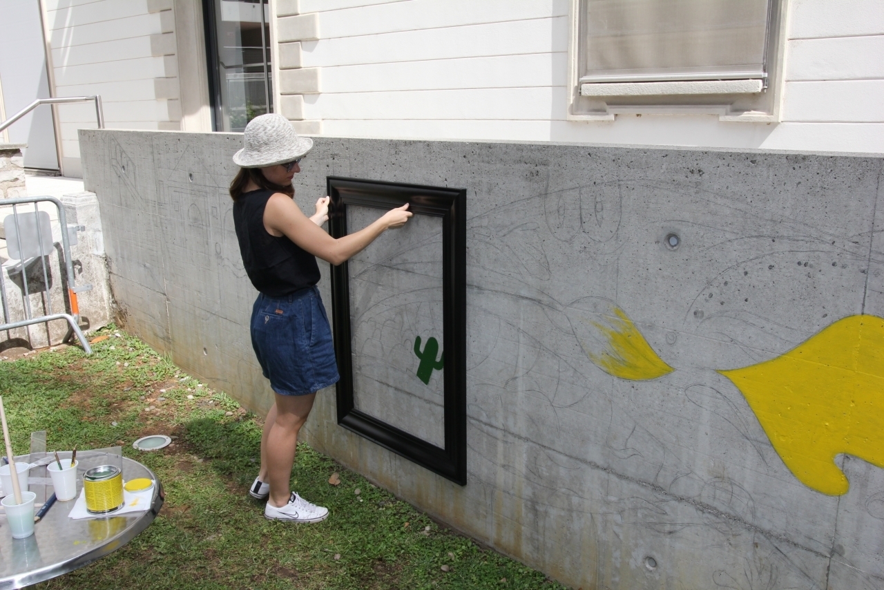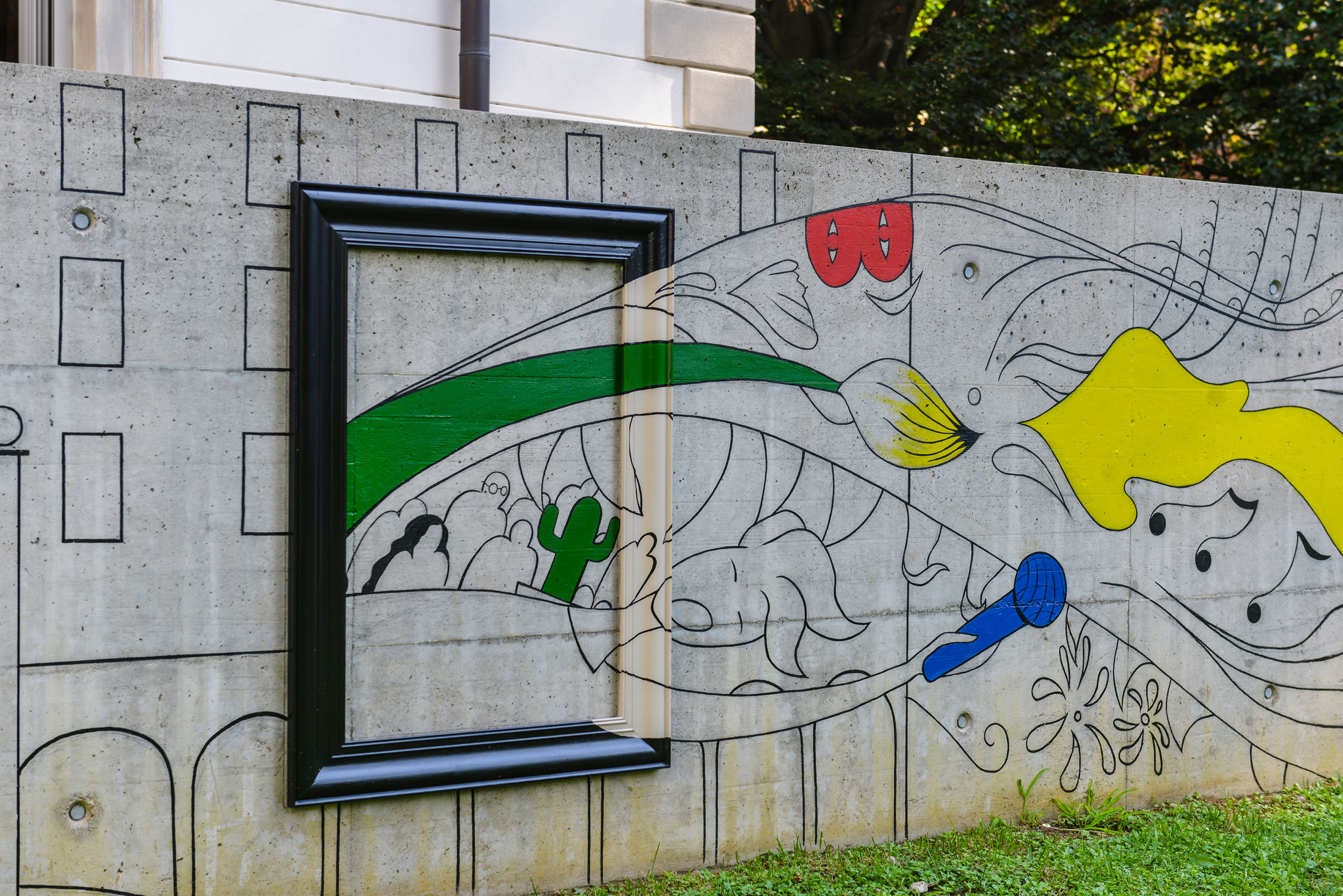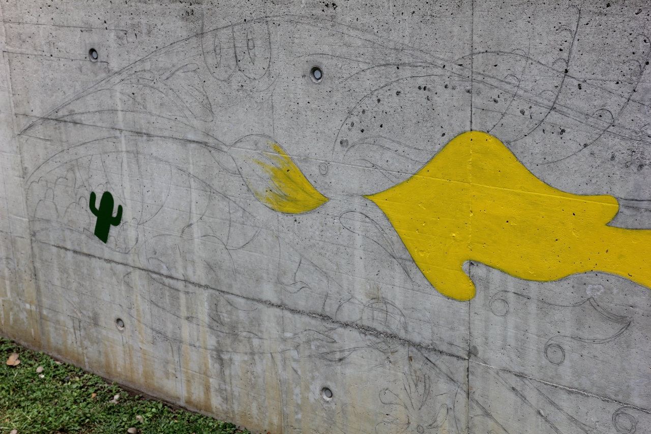 L’opera FLUX riesce a integrare l’edificio di Villa Carmine (sede della Divisione eventi e congressi della Città di Lugano) nell’opera e a ciò che accade al suo interno: idee ed eventi. Un progetto che incuriosisce, i cui piccoli elementi colorati stimolano l’occhio, esortandolo a cercare e comprendere le altre forme del disegno in bianco e nero. A sinistra, a partire dall’angolo fino alla parte centrale dove si trova l’apertura, trovano luogo visualizzazioni di edifici e simboli storici della Città come il LAC, i portici, la funicolare, il cancello al Parco Ciani e la basilica. La parte a destra è invece riempita dal flusso di idee ed attività che vengono create dalla Divisione eventi e congressi, queste culminano il loro percorso con una lampadina accesa, che rappresenta le idee finali.