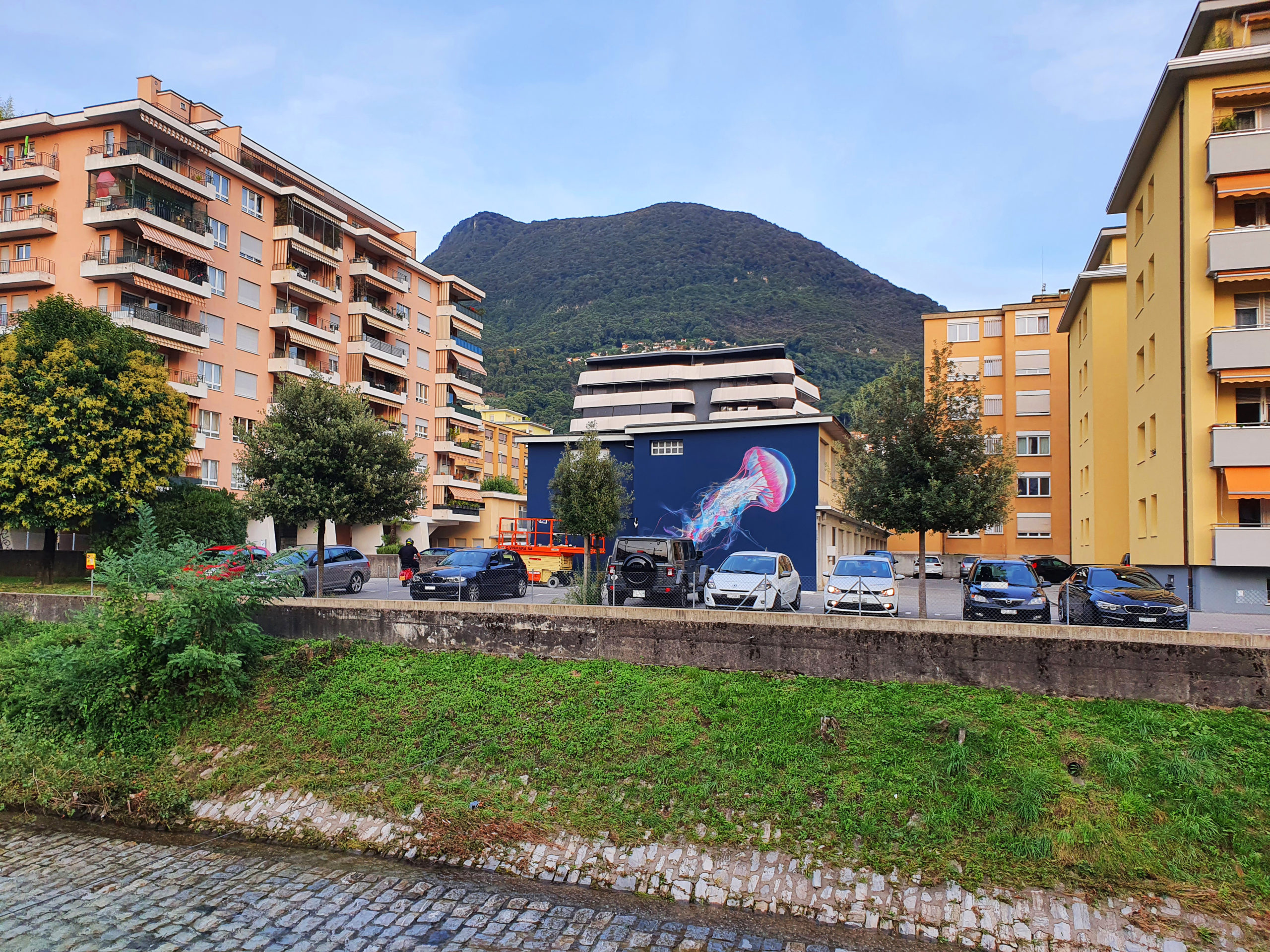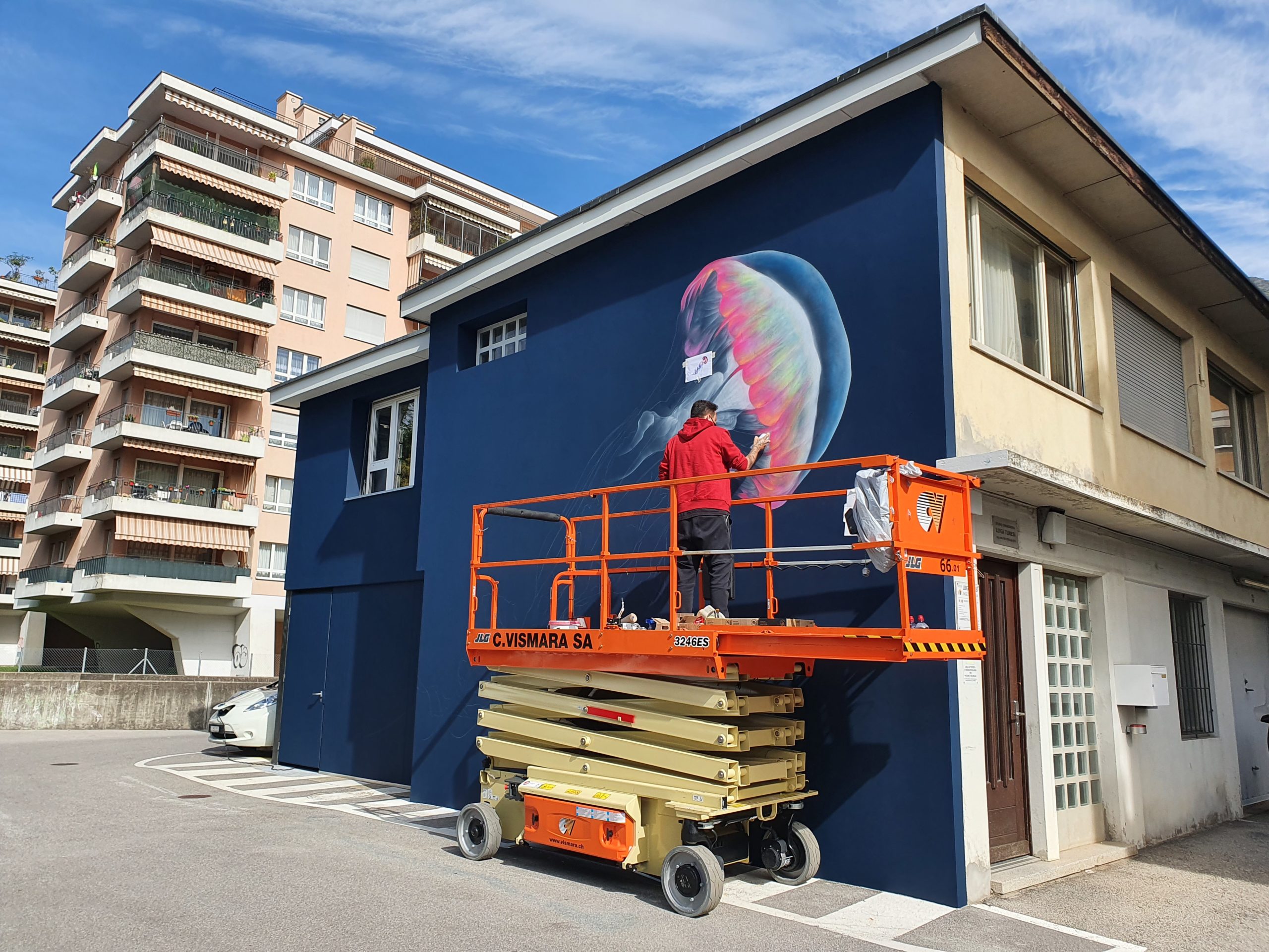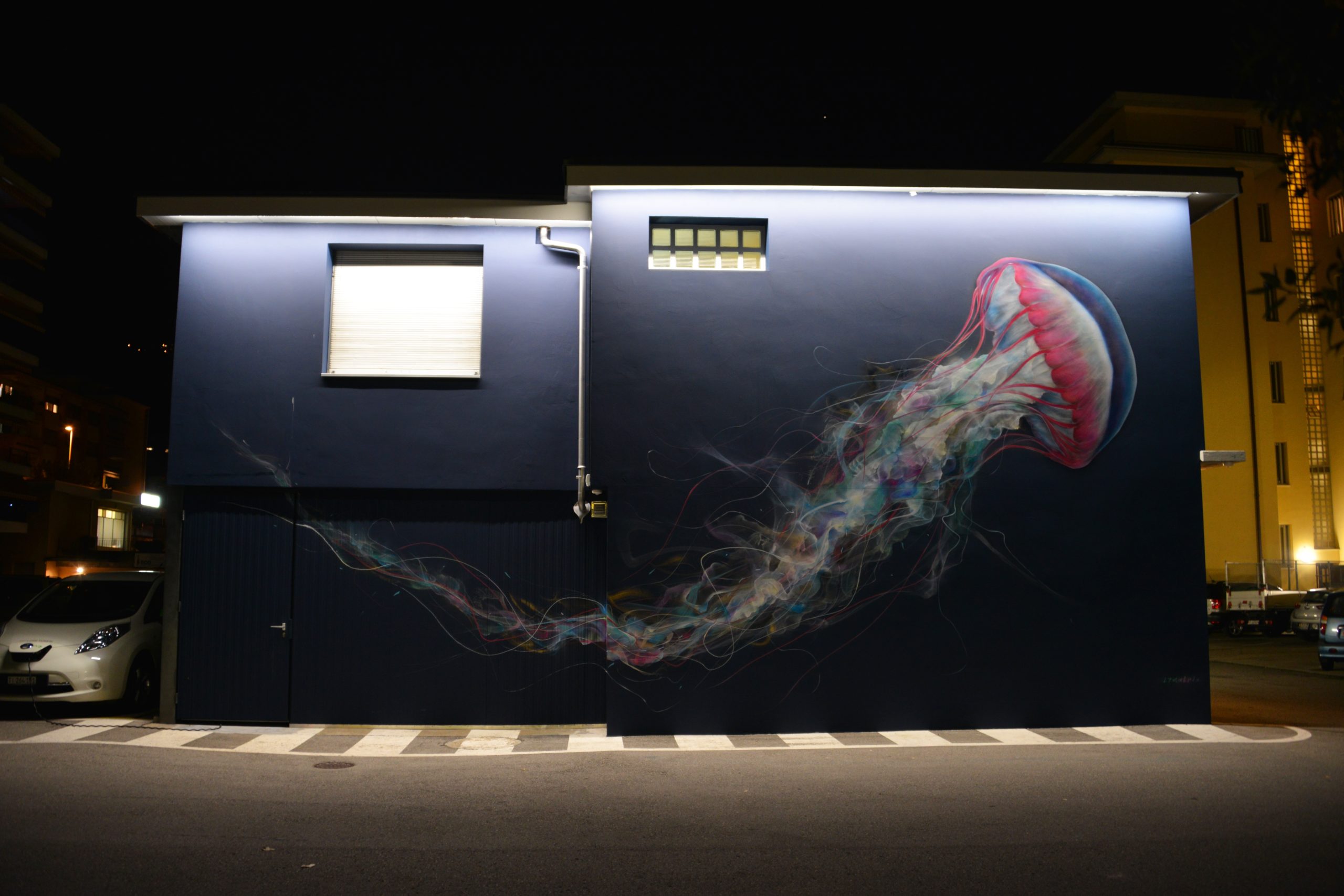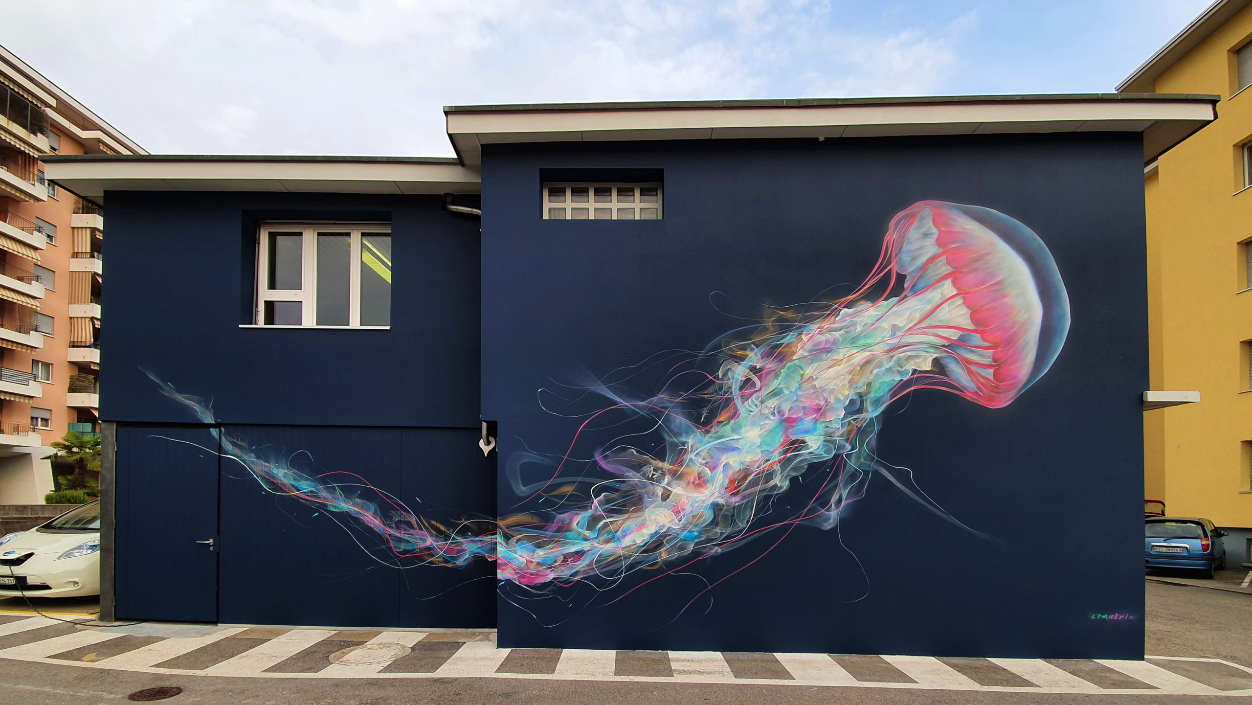 Aware that improving aesthetics contributes to the greater care and attention of people in the city, the Luigi Tunesi Ingegneria SA firm organised an art initiative for the walls of its offices on Via Fola in Lugano. Hence, a call for entries was issued directly by the firm in June 2020, inviting artists to submit projects with a water theme. The jury chose the project of L7matrix, a Brazilian artist currently living in Ticino, as the winner. And so, preparation work for the wall took place from 21-25 September 2020, and the work was completed between 28-30 September 2020. Iridescent jellyfish are a source of great inspiration for L7matrix, who succeeds in capturing their movements in his work through colours, translucency and changes in tone. The black or dark blue background makes the contrast of fluorescent and iridescent colours really stand out and enhances their tones, almost as if they were in a deep ocean, where luminescent creatures that use their own light to feed and survive can be found in its darkest corners. The artist used spray cans and iridescent and interference acrylic paint: in doing so, the angle at which the work is observed changes, as well as the range of colours perceptible to the eye. The mural can also be seen in the evening (until 00:00) thanks to LED lighting fitted by Luigi Tunesi Ingegneria SA.