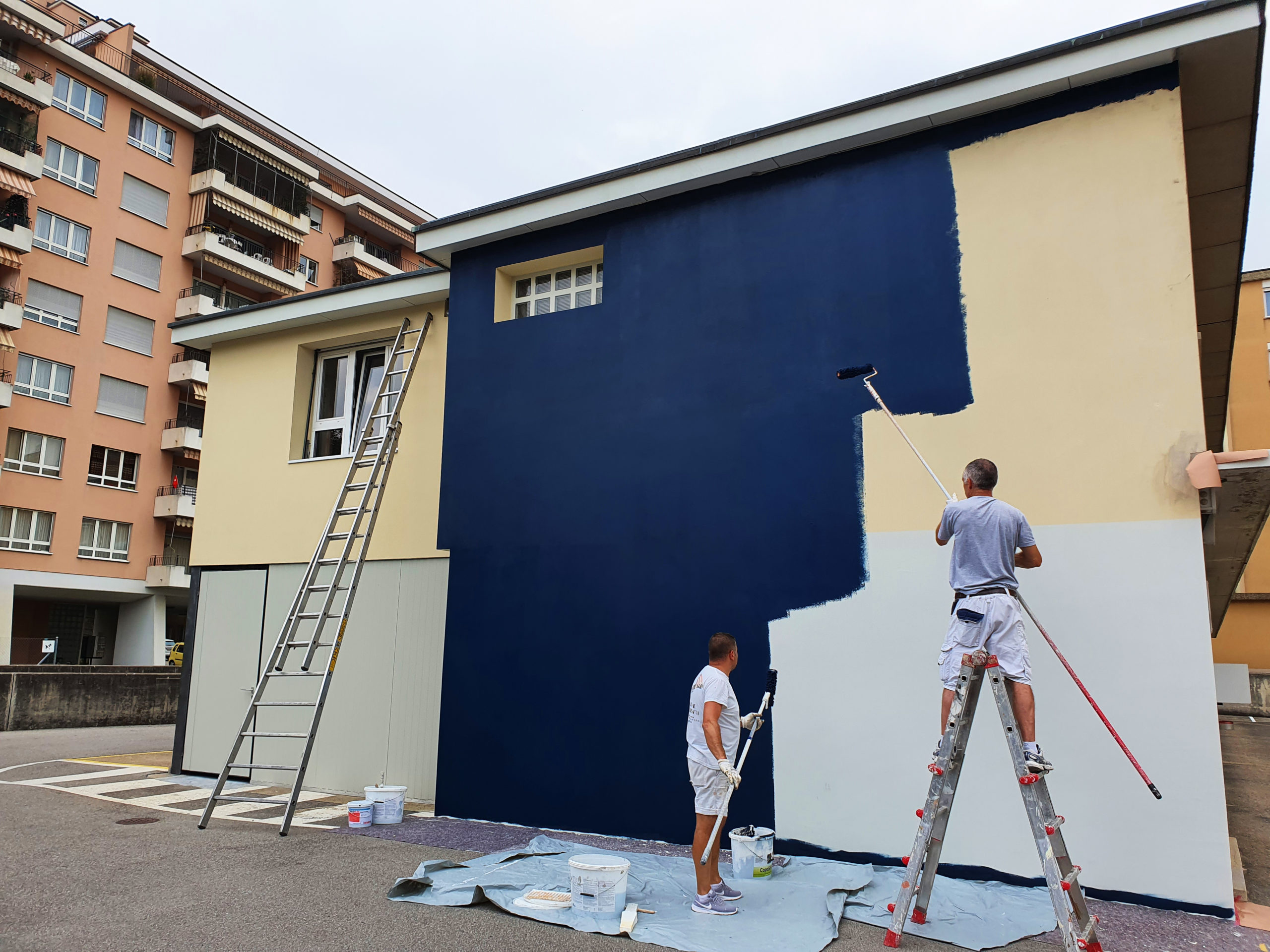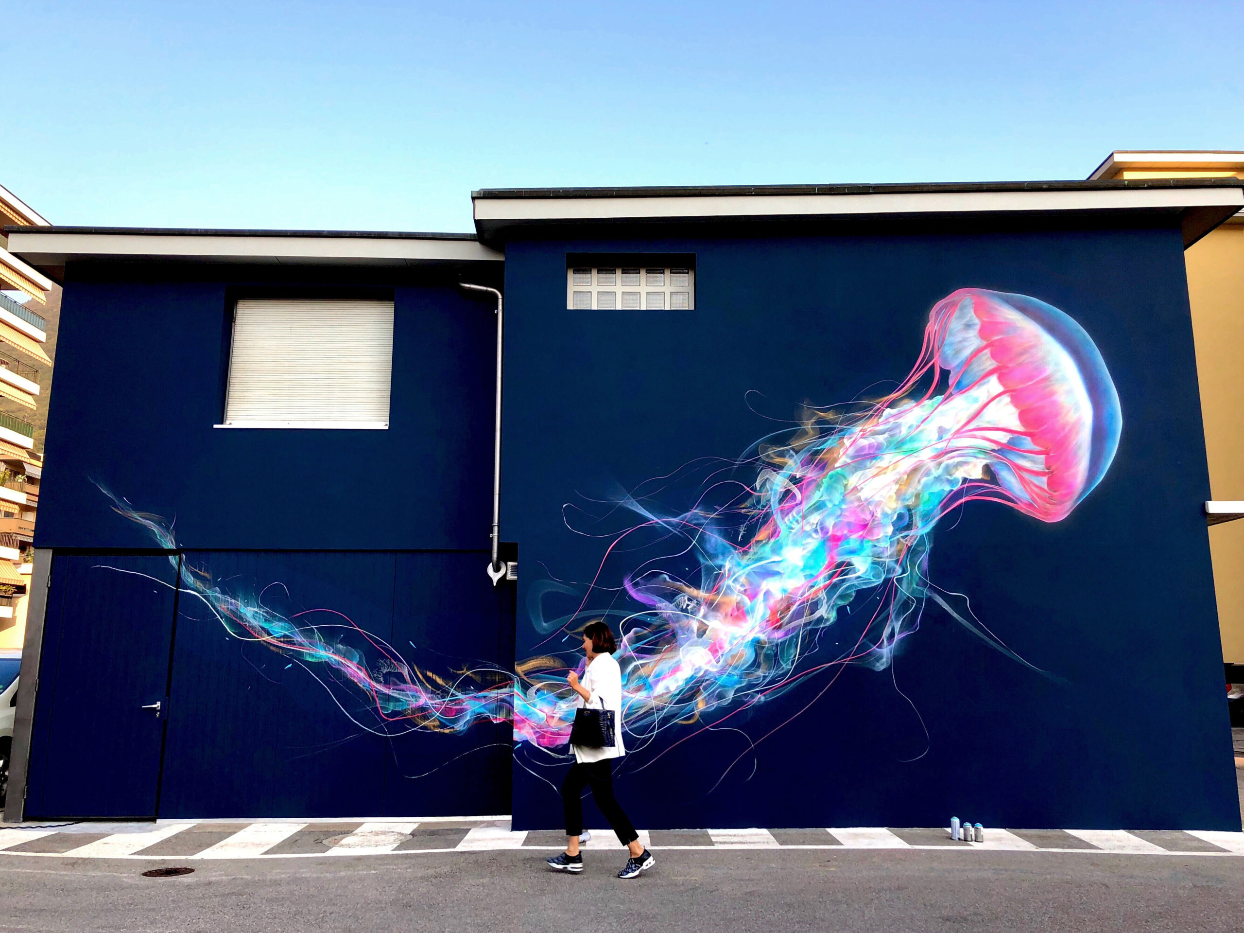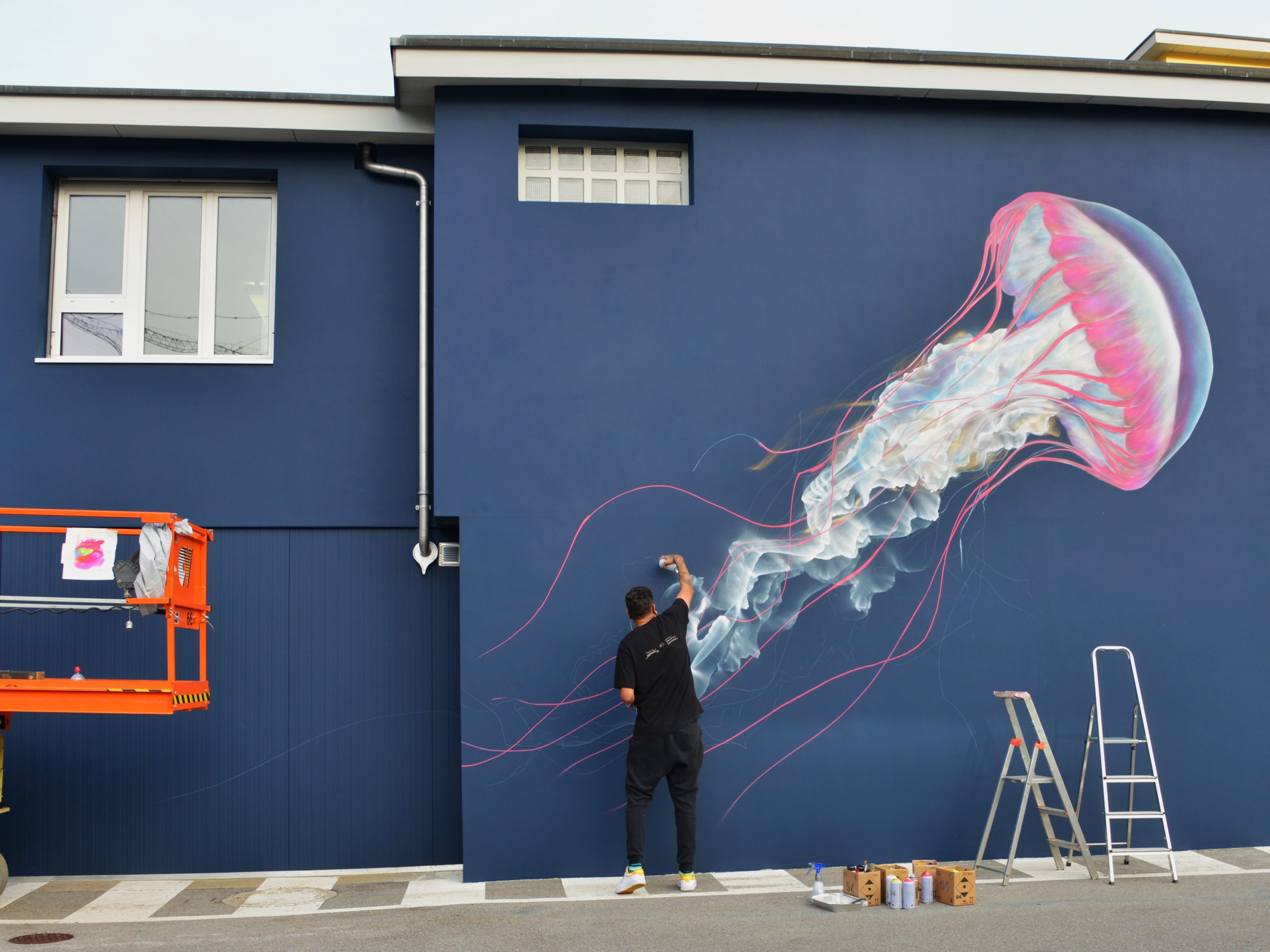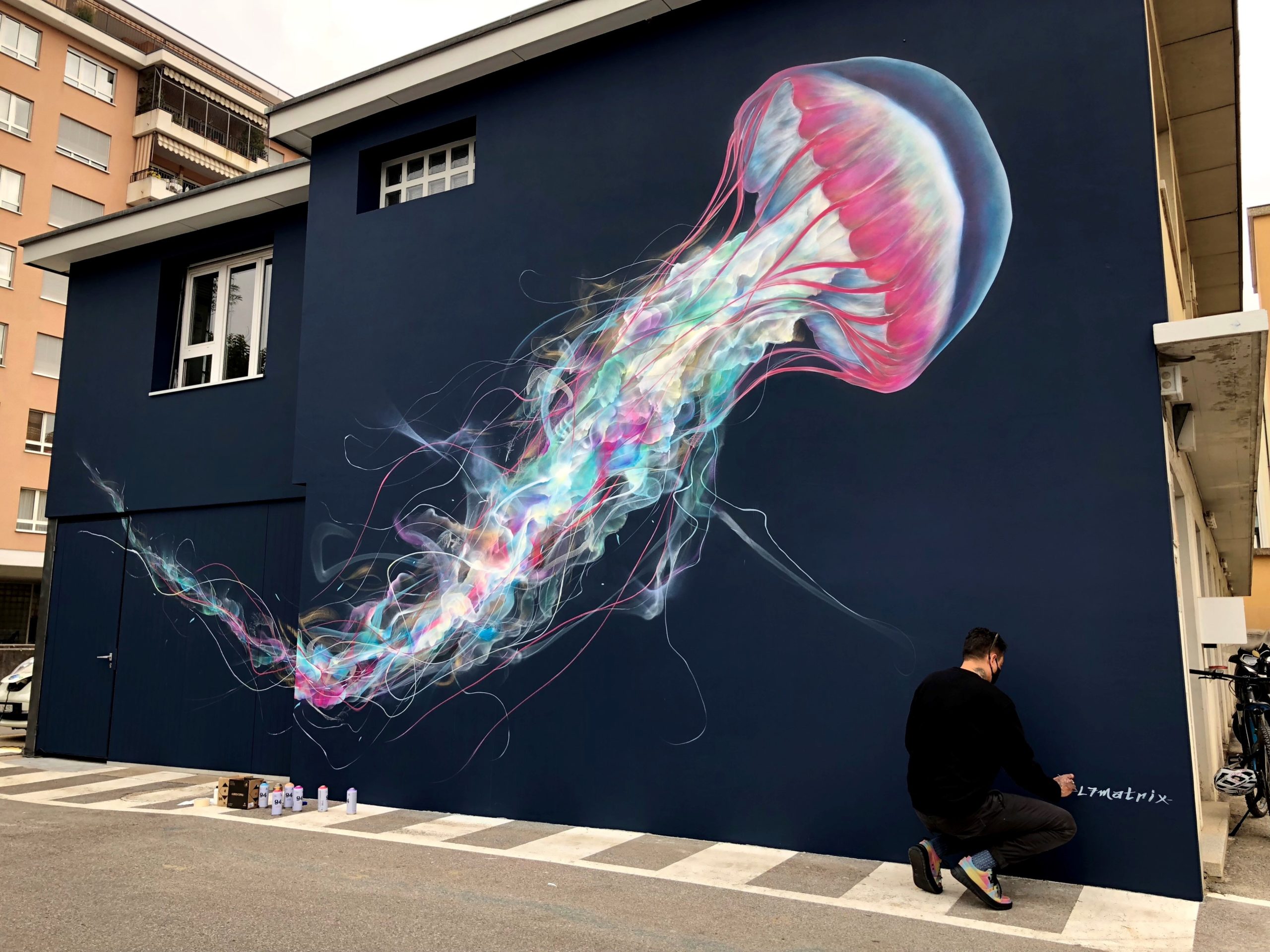 Aware that improving aesthetics contributes to the greater care and attention of people in the city, the Luigi Tunesi Ingegneria SA firm organised an art initiative for the walls of its offices on Via Fola in Lugano. Hence, a call for entries was issued directly by the firm in June 2020, inviting artists to submit projects with a water theme. The jury chose the project of L7matrix, a Brazilian artist currently living in Ticino, as the winner. And so, preparation work for the wall took place from 21-25 September 2020, and the work was completed between 28-30 September 2020. Iridescent jellyfish are a source of great inspiration for L7matrix, who succeeds in capturing their movements in his work through colours, translucency and changes in tone. The black or dark blue background makes the contrast of fluorescent and iridescent colours really stand out and enhances their tones, almost as if they were in a deep ocean, where luminescent creatures that use their own light to feed and survive can be found in its darkest corners. The artist used spray cans and iridescent and interference acrylic paint: in doing so, the angle at which the work is observed changes, as well as the range of colours perceptible to the eye. The mural can also be seen in the evening (until 00:00) thanks to LED lighting fitted by Luigi Tunesi Ingegneria SA.