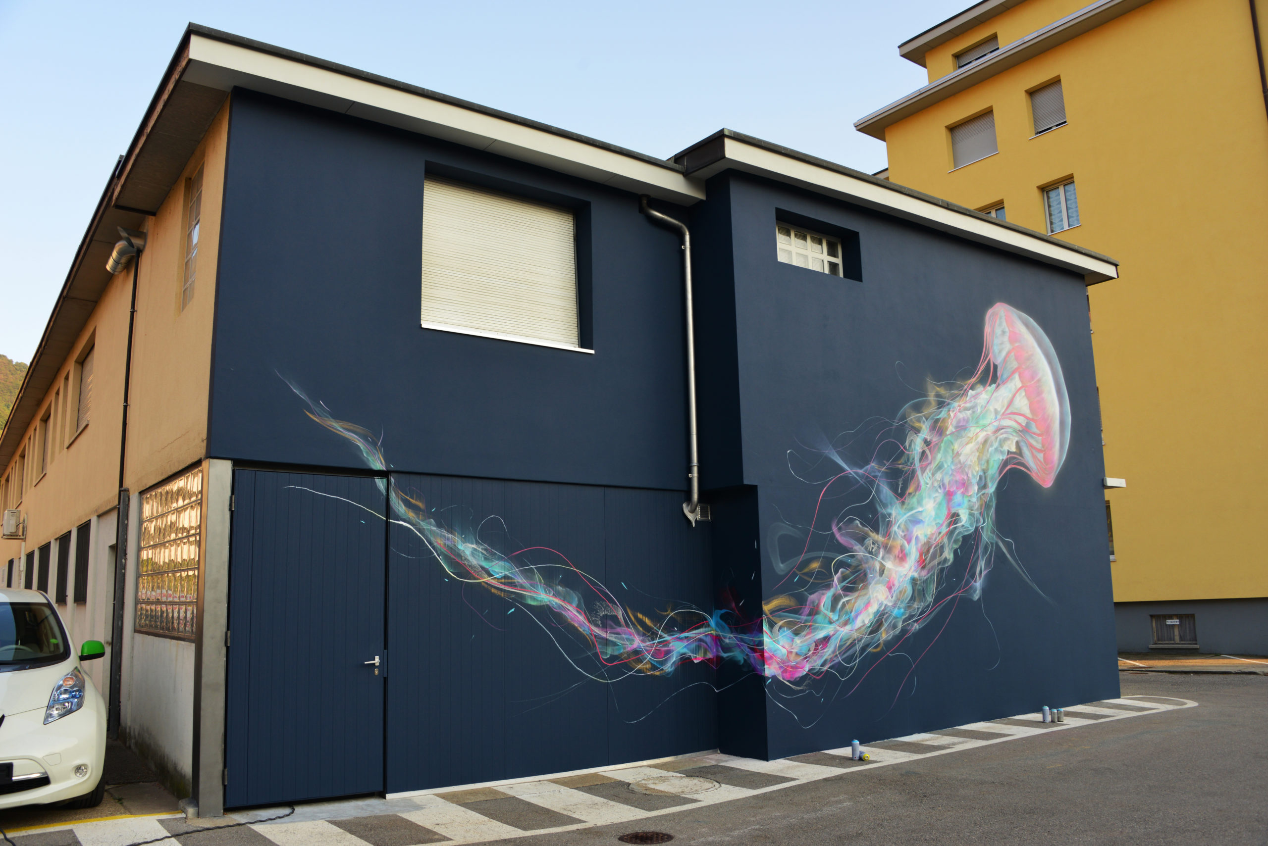 Consapevoli che il miglioramento estetico contribuisce a una maggiore cura e attenzione di chi vive i luoghi della città, lo studio Luigi Tunesi Ingegneria SA ha promosso un intervento artistico sulle mura dei propri uffici in via Fola a Lugano. In questo senso un bando di concorso è stato indetto direttamente dallo studio nel mese di giugno 2020 e gli artisti invitati a proporre progetti legati al tema dell’acqua. La giuria ha designato come vincitore il progetto di L7matrix, artista brasiliano attualmente residente in Ticino. Così i lavori di preparazione del muro si sono svolti dal 21 al 25 settembre 2020 e l’opera è stata realizzata tra il 28 e il 30 settembre 2020. Le meduse iridescenti sono fonte di grande ispirazione per L7matrix che nel suo lavoro riesce a catturarne il movimento attraverso colori, trasparenze e mutamenti di tono nei suoi molteplici aspetti e forme. Il fondo nero o blu scuro esalta il contrasto dei colori fluorescenti e iridescenti, potenzia i loro toni come in un profondo oceano, dove negli angoli più scuri possiamo incontrare creature luminescenti che grazie alla propria luce riescono ad alimentarsi e sopravvivere. L’artista ha utilizzato le bombolette spray e la pittura acrilica iridescente e di interferenza: in questo modo cambiando la prospettiva con cui si osserva l’opera, cambia anche la gamma di colori percepibili all’occhio. L’opera è visibile anche durante le ore serali (fino alle ore 00:00) grazie a un’illuminazione led realizzata dallo studio Luigi Tunesi Ingegneria SA.