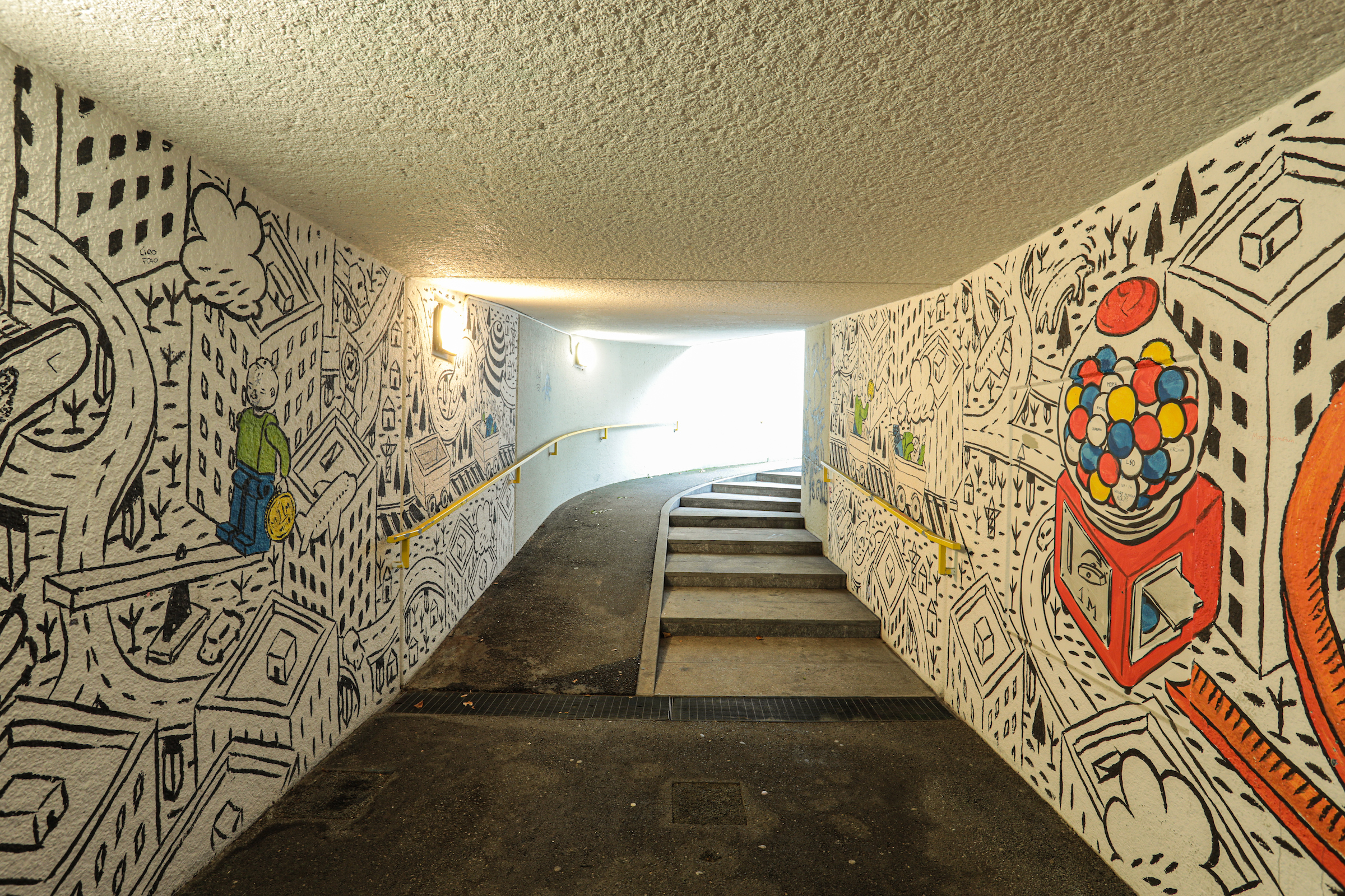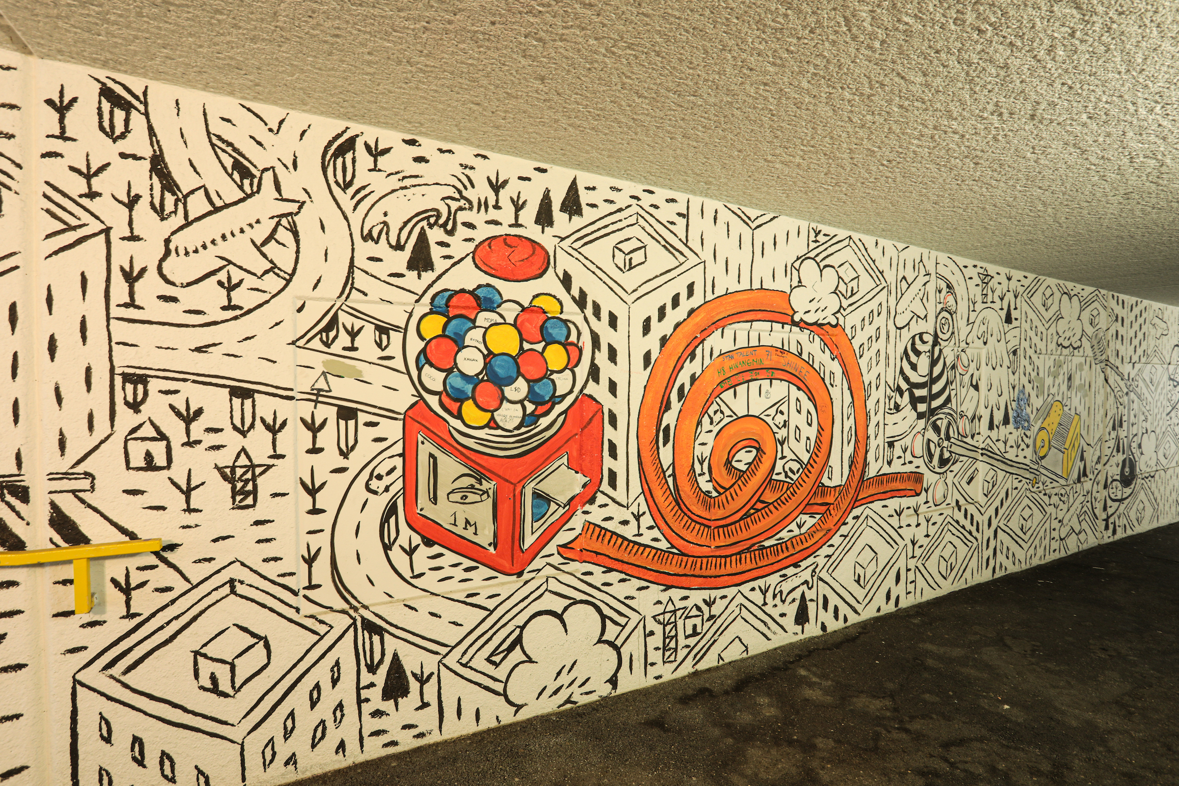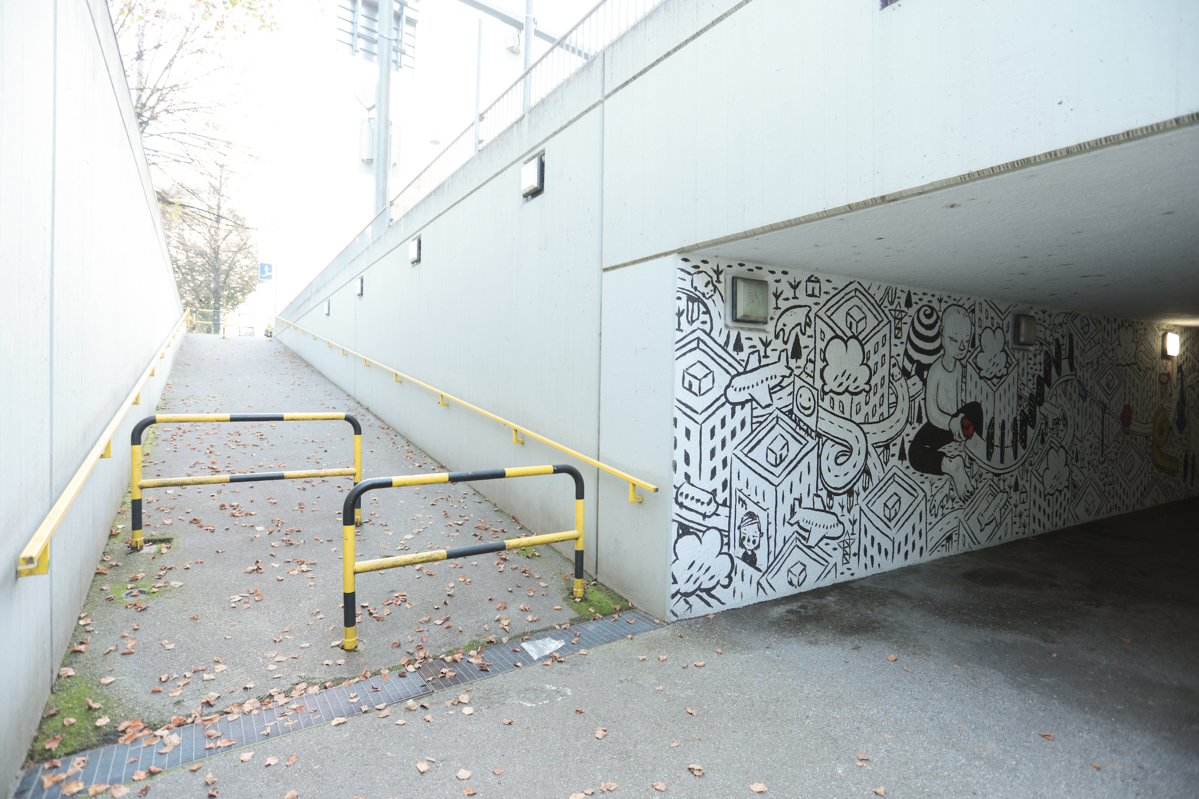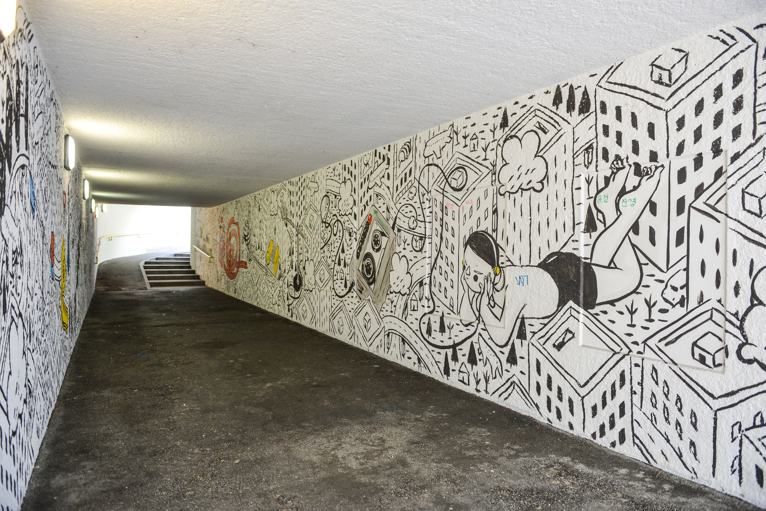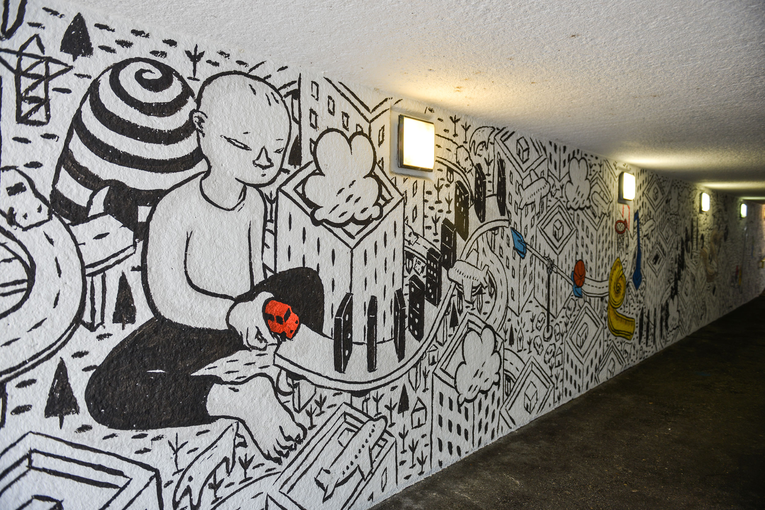 In occasione della terza edizione di TI/Street Art, Festival delle culture urbane, Millo, talentuoso street artist pugliese, ha ridipinto il sottopasso “Gerra” di Via Trevano. Con un murale in bianco e nero intervallato da lampi di colore accesi, come nel suo stile, sorprende lo spettatore. La sua è una ricerca estetica personale che pone l’attenzione sulla fragilità dell’esistenza umana in relazione al contesto che la ospita, indagando così non solo ciò che ci circonda ma soprattutto ciò che si cela dentro di noi.