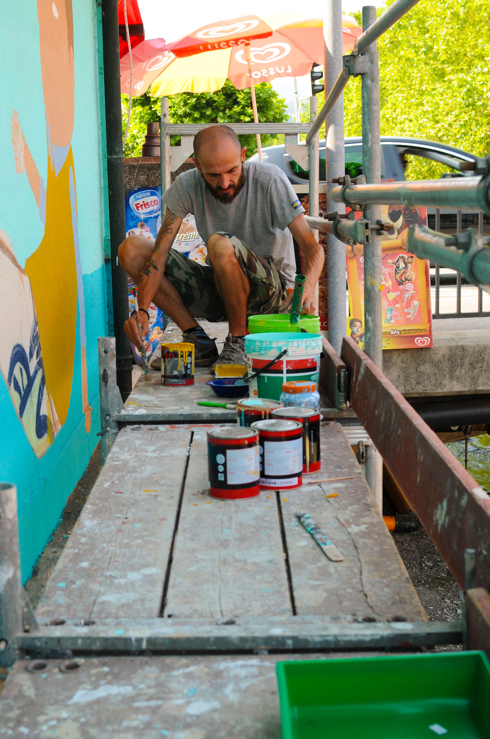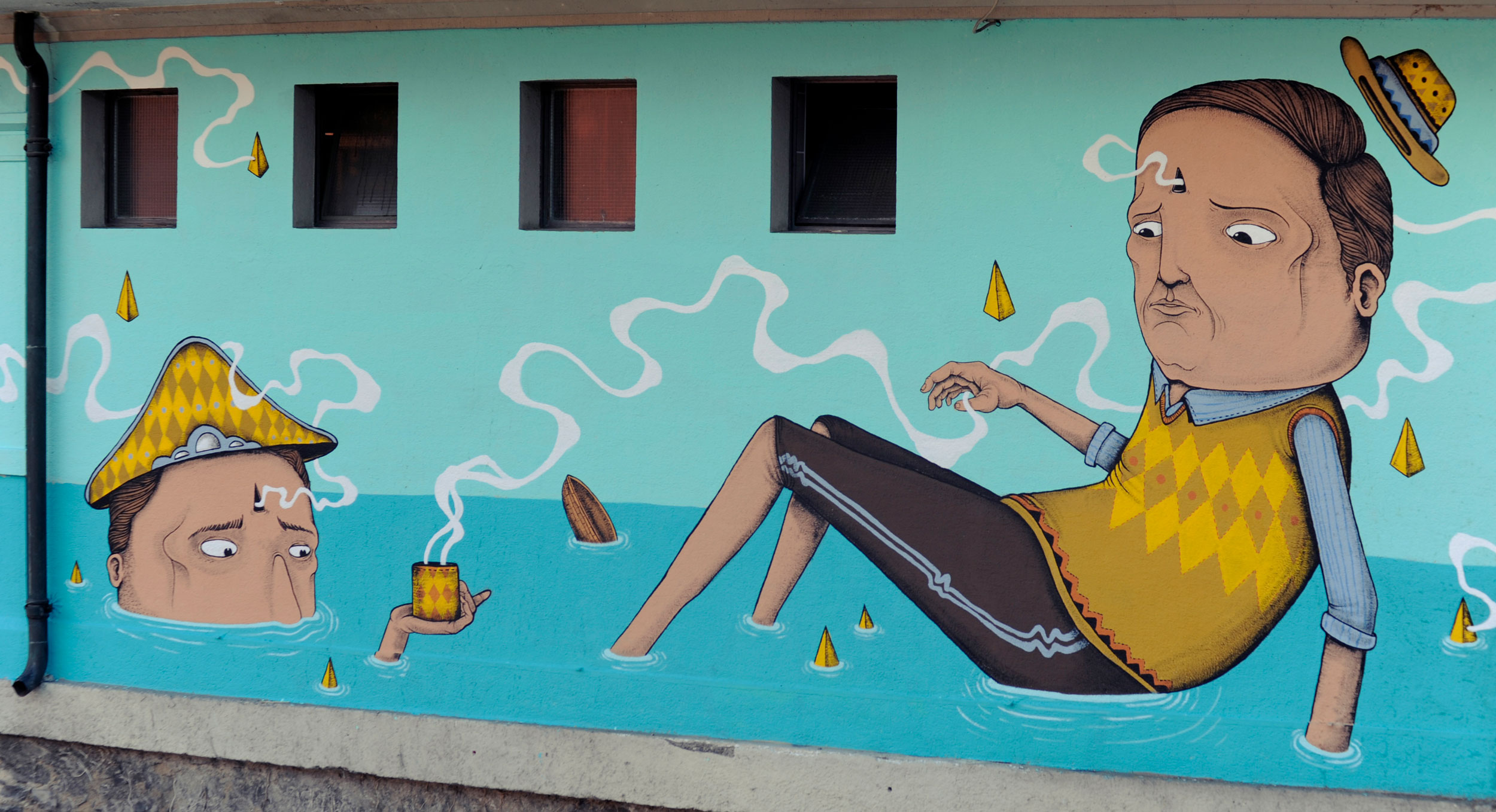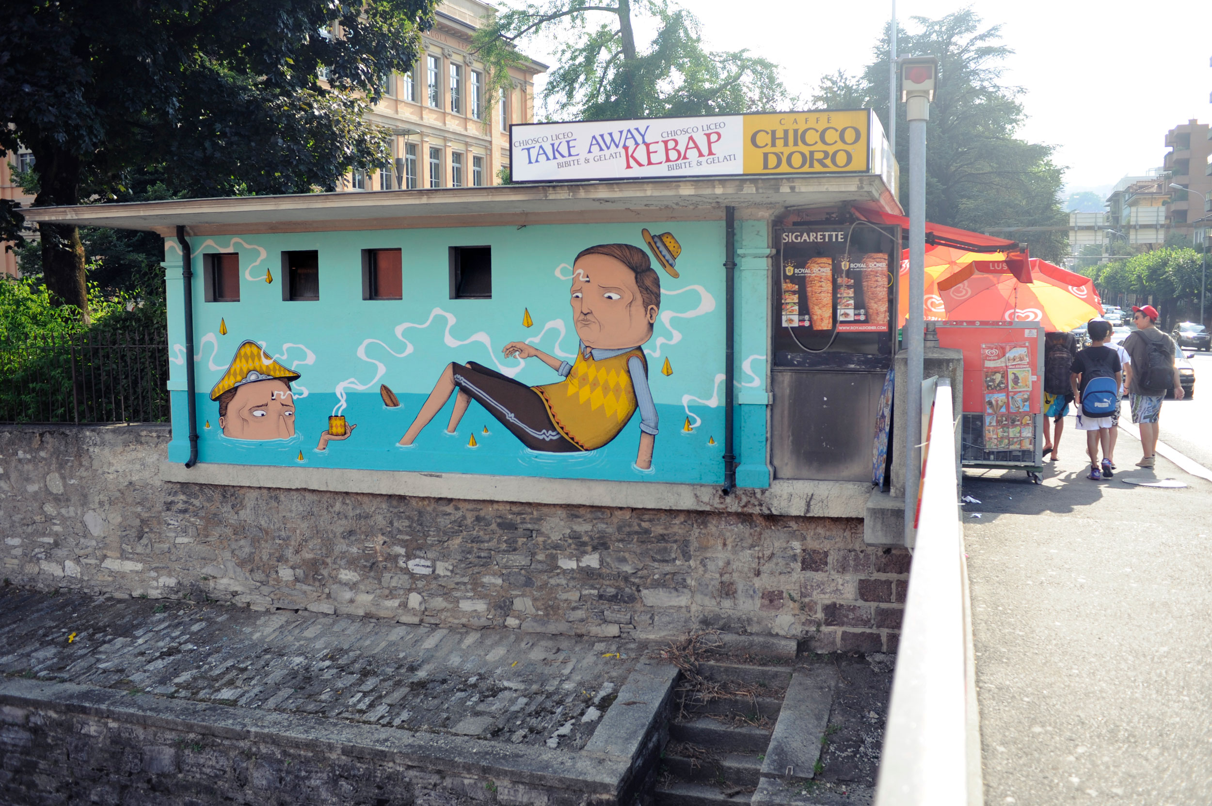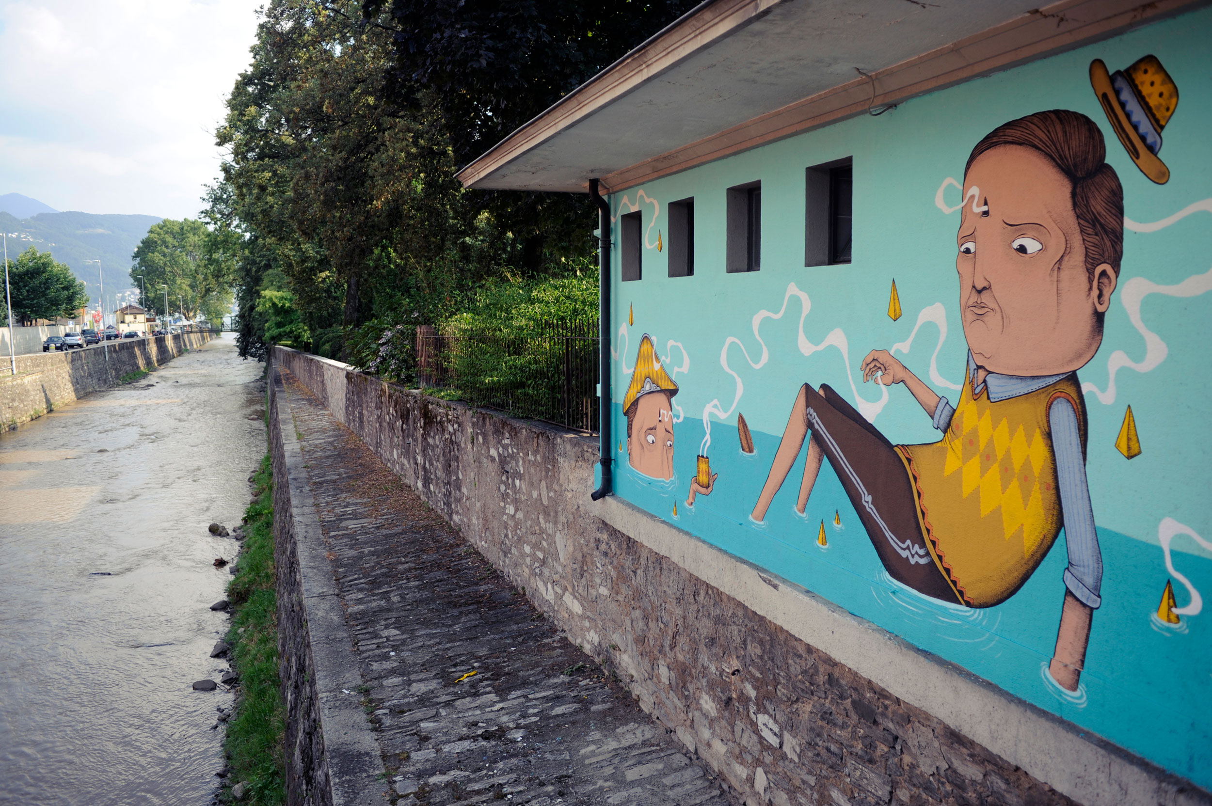 This creation by Seacreative tells the story of an imaginary, fantasy world made up of grotesque characters that do not belong to any specific urban landscape, but only to the games of his mind. Inspired undoubtedly by the presence of the nearby river, he painted a scene stylistically consistent with his previous creations: bizarre characters with surprised and absent expressions, surrounded by an imaginary background straight from the fantasy world. By drawing inspiration therefore from the elements surrounding the location, Seacreative leaves the viewer with different ways of interpreting what they see.