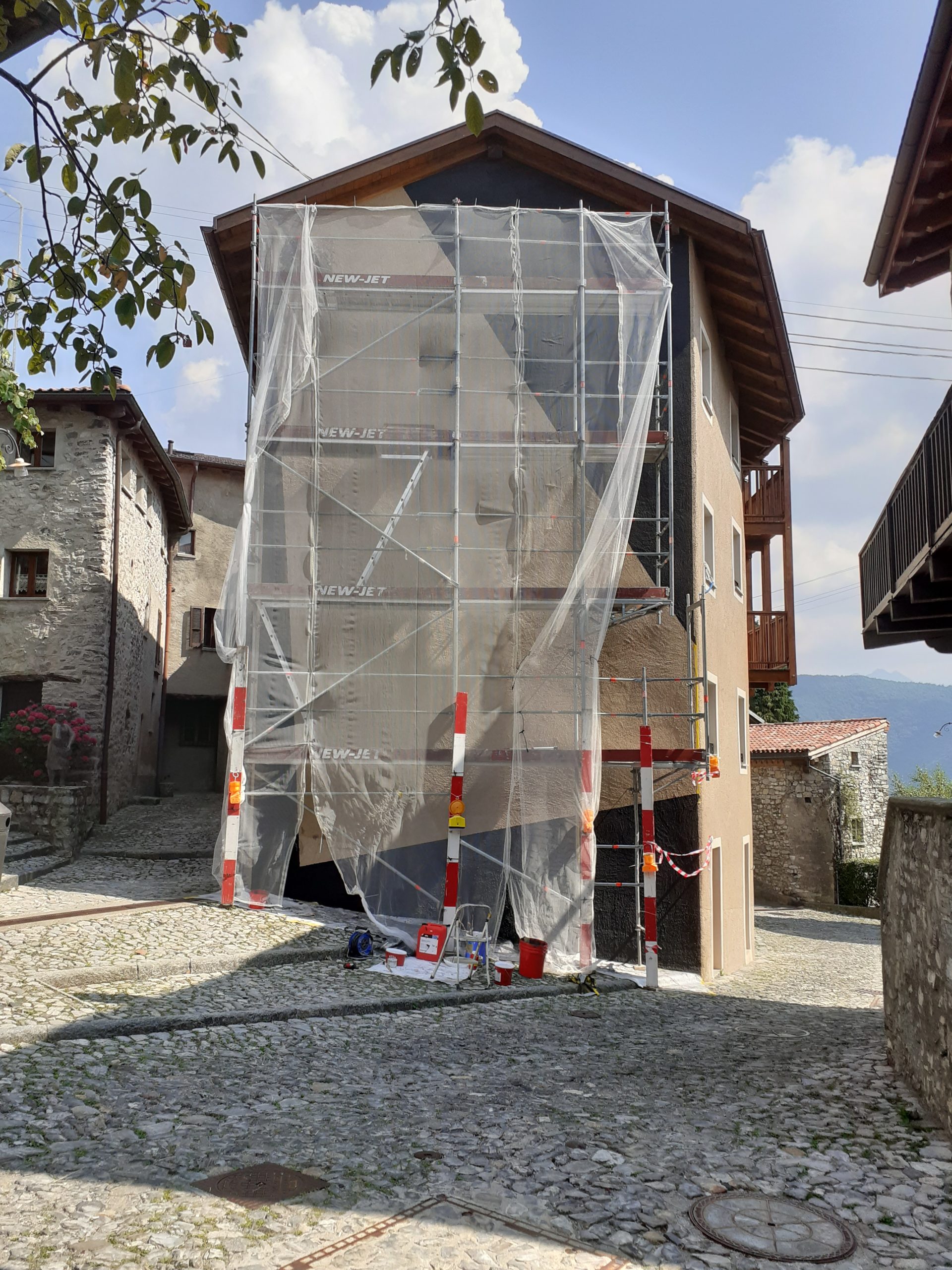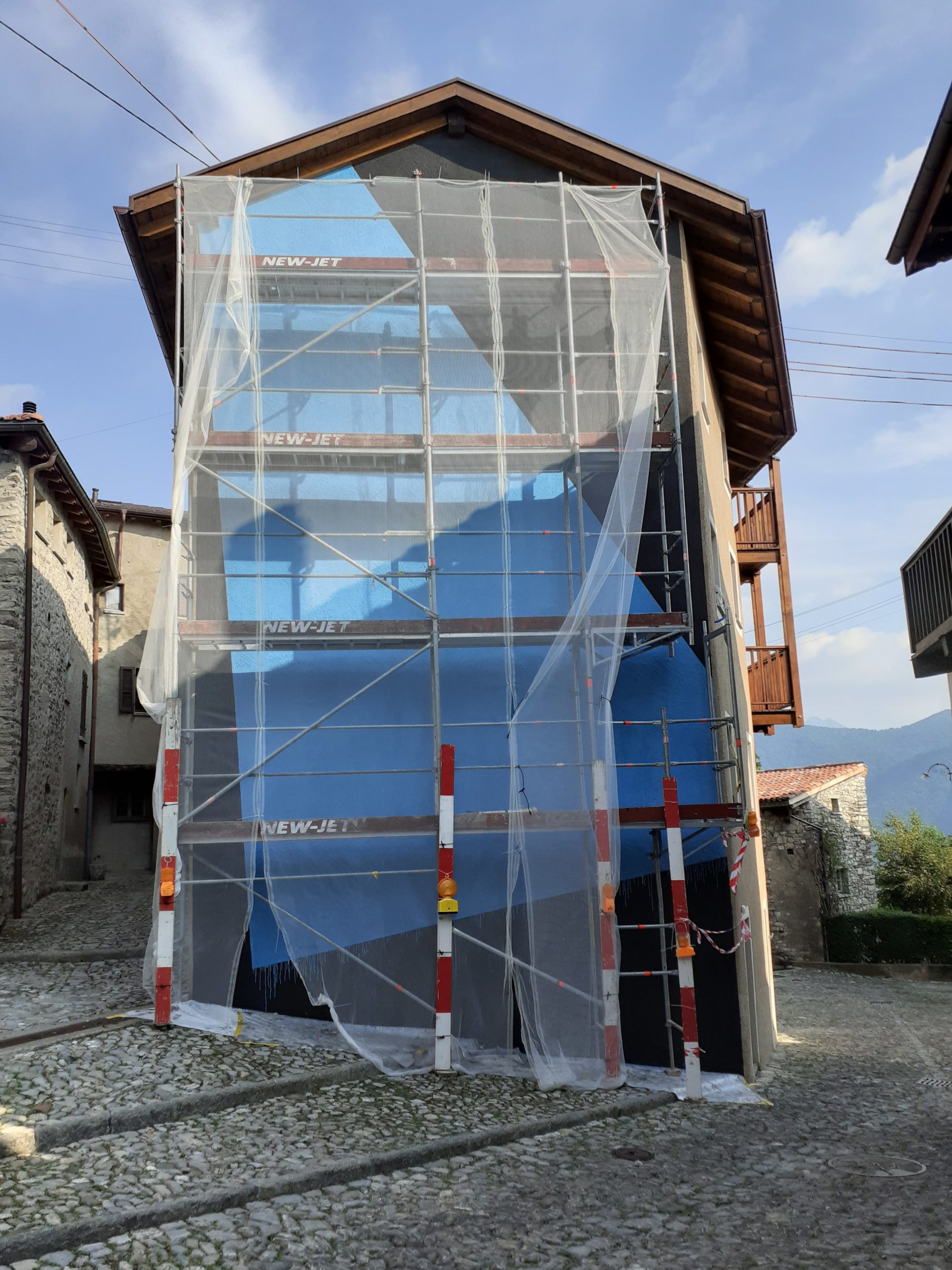 «Ho aderito con piacere all’invito degli amici del Circolo di realizzare un’opera commemorativa. La visita nel nucleo del paese in loro compagnia è stata affascinante e la scoperta della grande parete su Piazzetta Lelèn ha richiamato subito la mia attenzione perché priva di elementi architettonici particolari, ma allo stesso tempo caratterizzante lo spazio con la sua presenza massiccia», così racconta Bernasconi il suo approdo a Brè. Nella mia vita mi sono confrontato spesso con opere di grandi dimensioni – anche molto più estese di quelle di Brè – ma l’approccio all’opera è sempre lo stesso: uso forme geometriche note e le organizzo in maniera libera nello spazio che ho a disposizione, cercando il dialogo con il contesto circostante. E poi amo il colore. In questo caso il colore dominante è l’azzurro, che sembra calare dal cielo nel nucleo con forza, ma non con prepotenza».