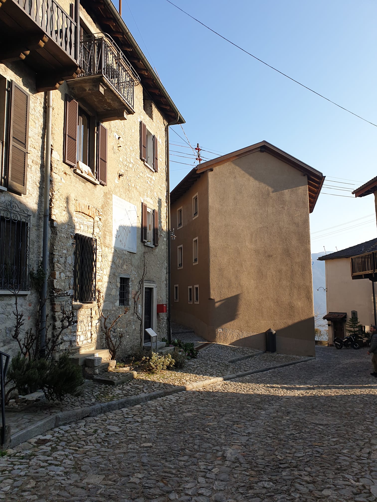 Livio Bernasconi, born in 1932, is considered one of the most acclaimed artists on the Swiss contemporary art scene. His hallmark is unmistakable and has allowed him to develop his strong, determined, personal contribution to the poetics of geometric abstraction. It is therefore no coincidence that the Circolo Culturale Pasquale Gilardi “Lelèn” invited Bernasconi to commemorate another prominent artist: the painter Wilhelm Schmid, who lived with his wife, Maria, in the village of Brè for many years in the house that later became a museum dedicated to the artist. The project, which makes a visual and emotional impression, consists of a large blue parallelogram on a dark background, painted on the entire surface of the northwest-facing façade of a private home, overlooking one of the most picturesque squares in the village centre. The converging and diverging lines, which outline the geometric shape, fit in perfectly with the profiles of the houses, alleyways and ribbons of light, creating a magical atmosphere involving the whole neighbourhood. The choice of this wall was suggested due to its proximity to the museum, as well as its prominent, but not immediately visible location for those arriving from the south. However, it allowed Bernasconi to make a further contribution to the world of mural paintings in Ticino, which are particularly admired due to their ability to interact with the space and surrounding architecture, the potential of which in this case is expressed to the full. “I gladly accepted the invitation of my friends in the Circle to create a commemorative work. The visit to the village centre with them was fascinating, and the discovery of the large wall on Piazzetta Lelèn immediately drew my attention because it lacked any particular architectural elements, but at the same time had an imposing presence in the space,” said Bernasconi about his visit to Brè. “In my life I have often been confronted with works of a considerable size – even much larger than those in Brè – but my approach to the work is always the same: I use well-known geometric shapes and organise them freely in the space that is available to me, seeking some kind of interaction with the surrounding environment. And then I love colour. In this case the dominant colour is light blue, which seems to drop from the sky forcefully, but not overbearingly, into the village centre.”