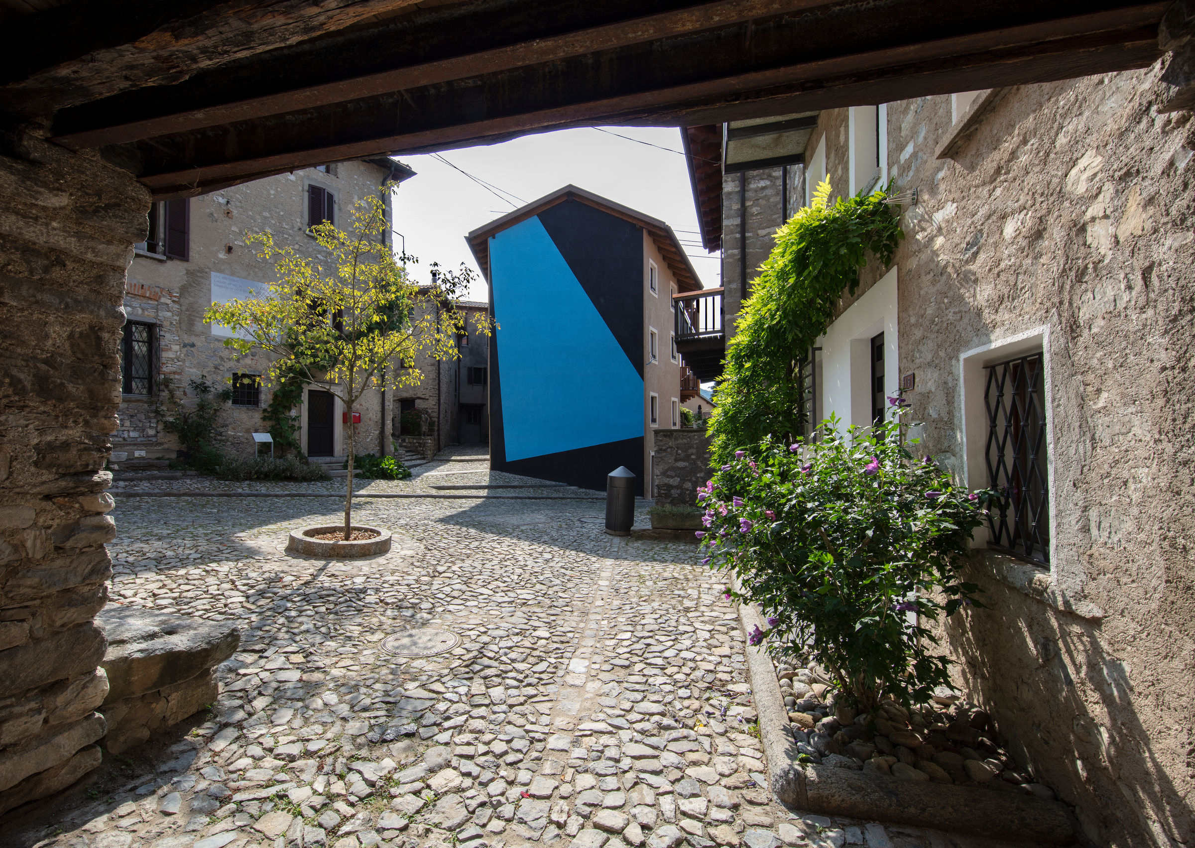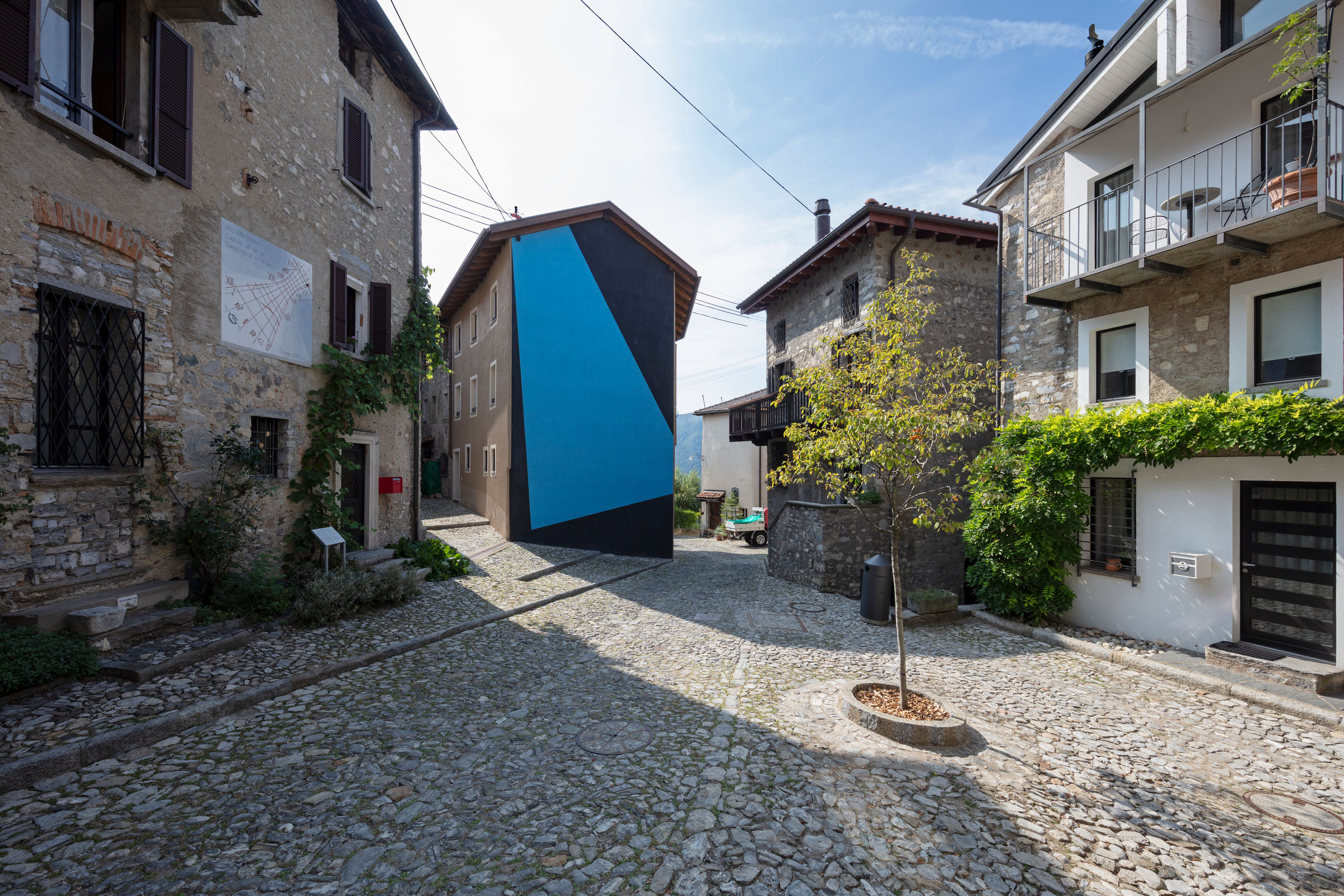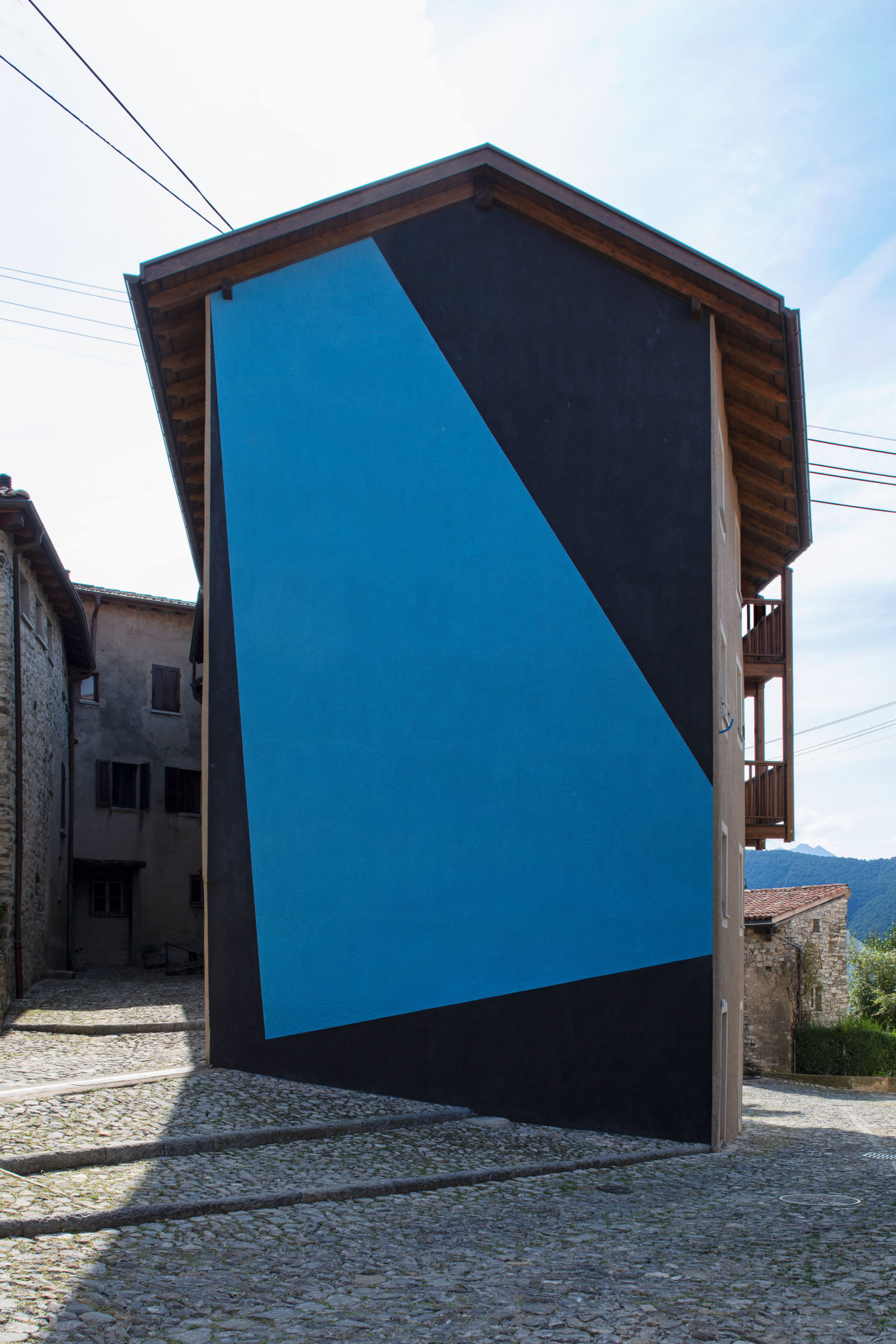 Livio Bernasconi, classe 1932, è considerato una delle maggiori personalità nel panorama artistico contemporaneo svizzero. Possiede un segno inconfondibile, che gli ha permesso di elaborare con forza e determinazione il suo personale contributo alla poetica dell’astrazione geometrica. Non è quindi un caso che il Circolo culturale Pasquale Gilardi “Lelèn” abbia invitato proprio Bernasconi a ricordare la presenza artistica di primo piano di un altro artista: il pittore Wilhelm Schmid che, con la moglie Maria, visse nel villaggio di Brè molti anni nella casa poi divenuta un museo a lui dedicato. Il progetto, di sicuro effetto scenografico ed emotivo, consiste in un grande parallelogramma azzurro su sfondo scuro, dipinto sull’intera superficie della facciata posta a nordovest di un’abitazione privata, che dà su una delle piazze più caratteristiche del nucleo. Le linee convergenti e divergenti, che delineano la figura geometrica, relazionano perfettamente con i profili delle case, delle viuzze, dei fili della luce, creando un’atmosfera magica che coinvolge tutto il quartiere. La scelta della parete è stata suggerita dalla sua vicinanza al museo oltre che dalla sua collocazione preminente, ma non immediatamente percepibile per chi sale da sud. Ha comunque permesso a Bernasconi di lasciare un ulteriore contributo nell’ambito della pittura murale in Ticino, particolarmente apprezzata proprio per la sua capacità di dialogare con lo spazio e con l’architettura, che qui esprimono tutto il loro potenziale.
