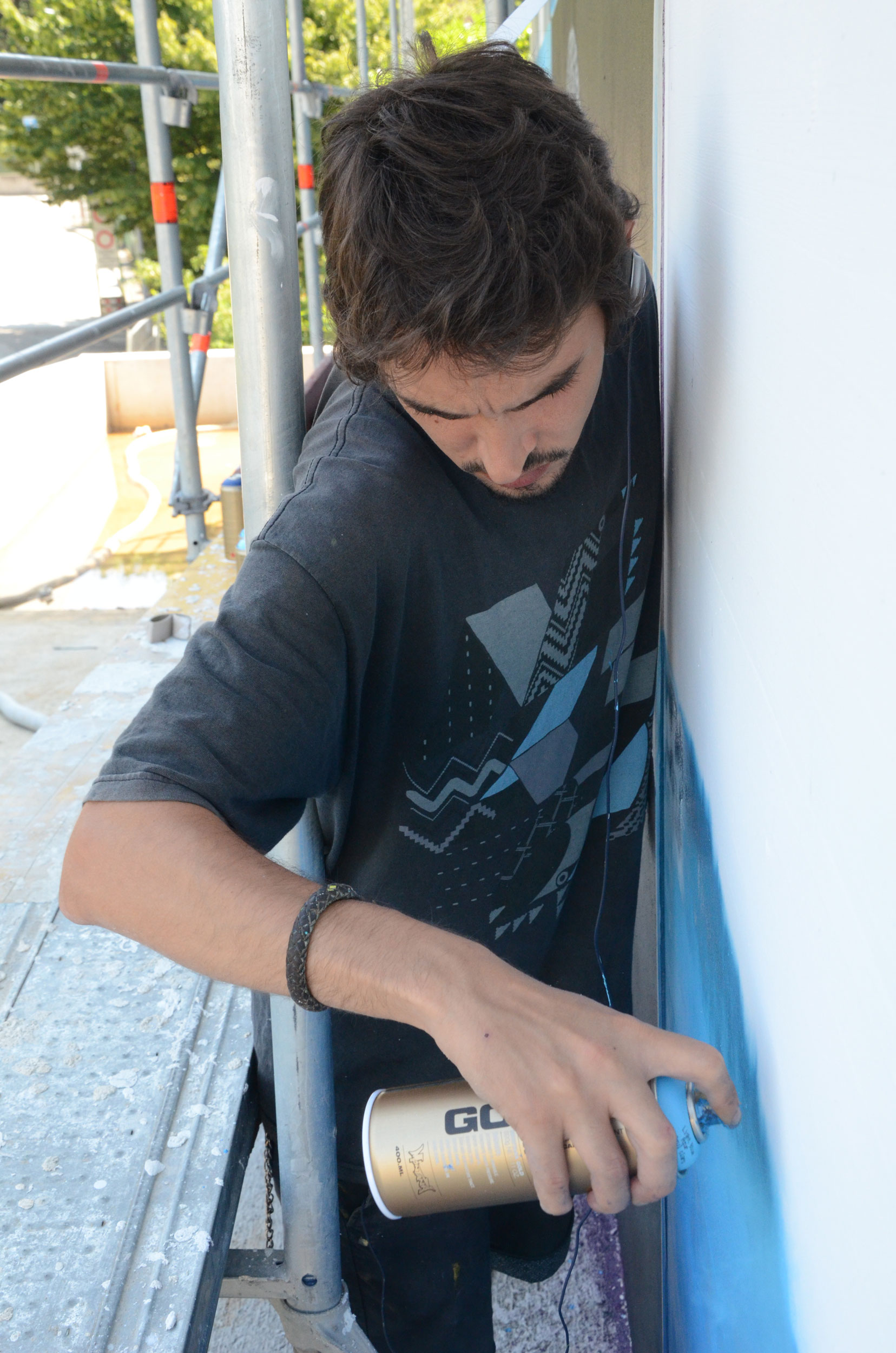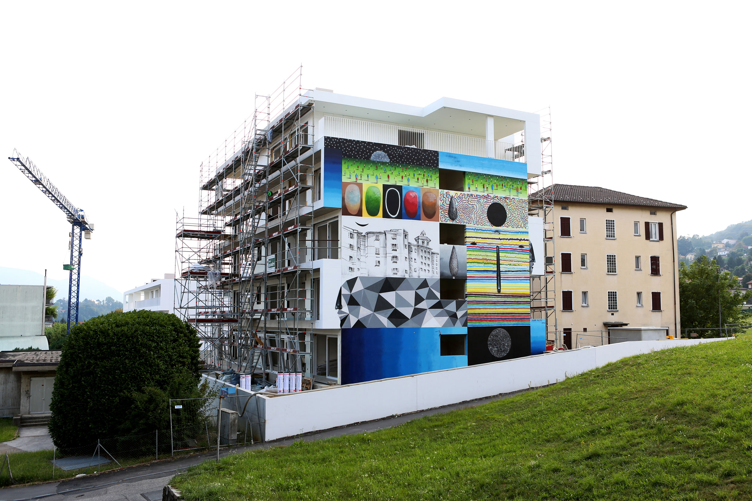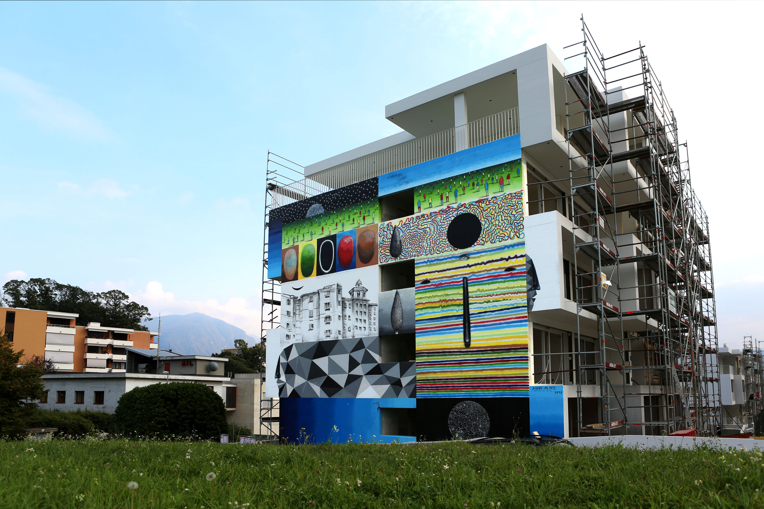 Geometrico e primitivo ma allo stesso tempo figurativo e futuristico il lavoro di Xuan Alyfe fa l’occhiolino ai più grandi movimenti artistici dell’epoca moderna. Attraverso una complessa combinazione di colori psichedelici ed elementi simbolici, elegantemente posati su fondi spesso monocromatici, il giovane street artist spagnolo, crea composizioni leggere ed equilibrate. Alle estremità più alte dell’opera si nota una sorta di mondo terreno a cavallo tra giorno e notte. Soffermandosi sui dettagli si scoprono invece visioni distorte della realtà in cui si può individuare uno scorcio urbano da una parte in contrasto alle vibranti linee che accompagnano la vista verso il grande volto.